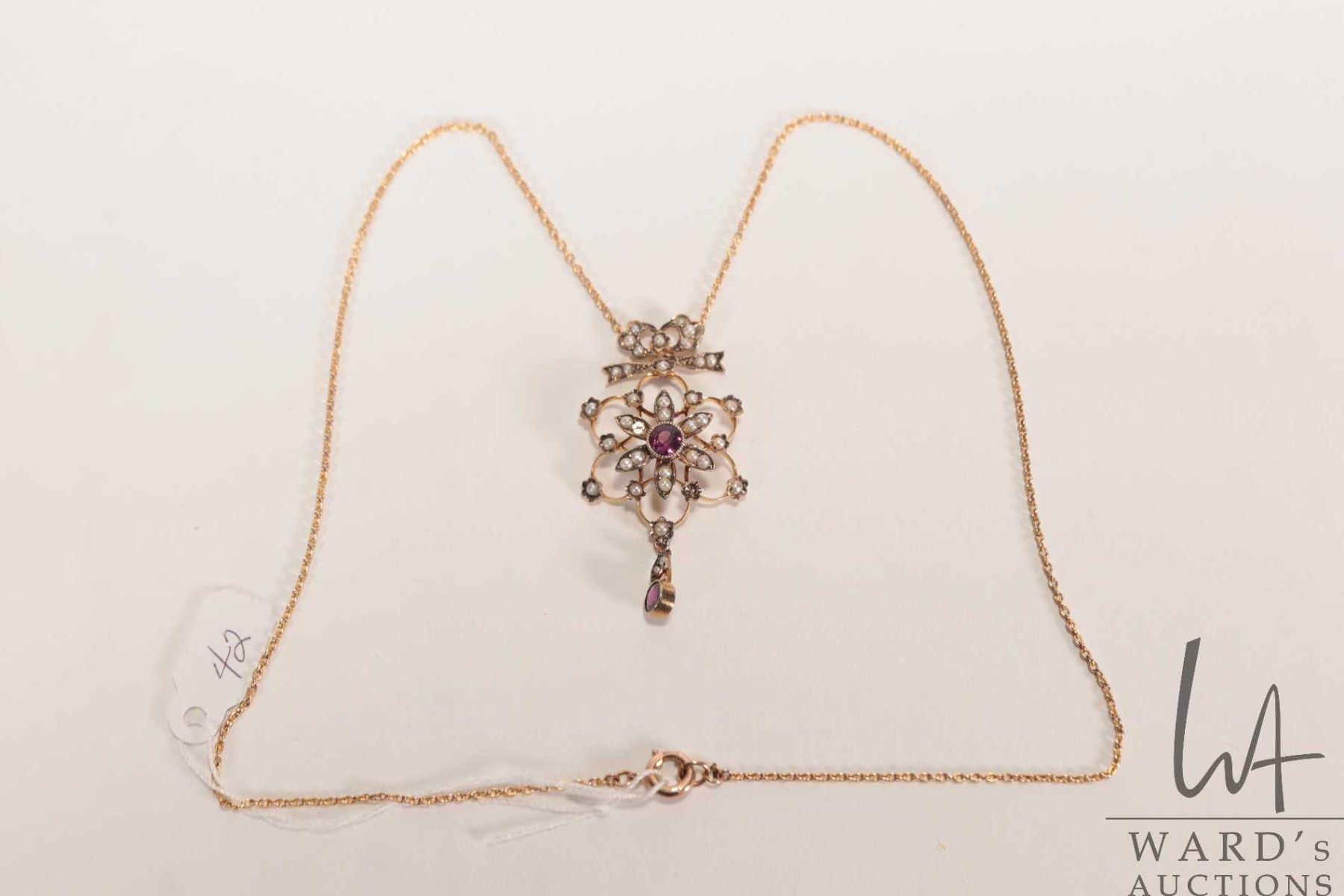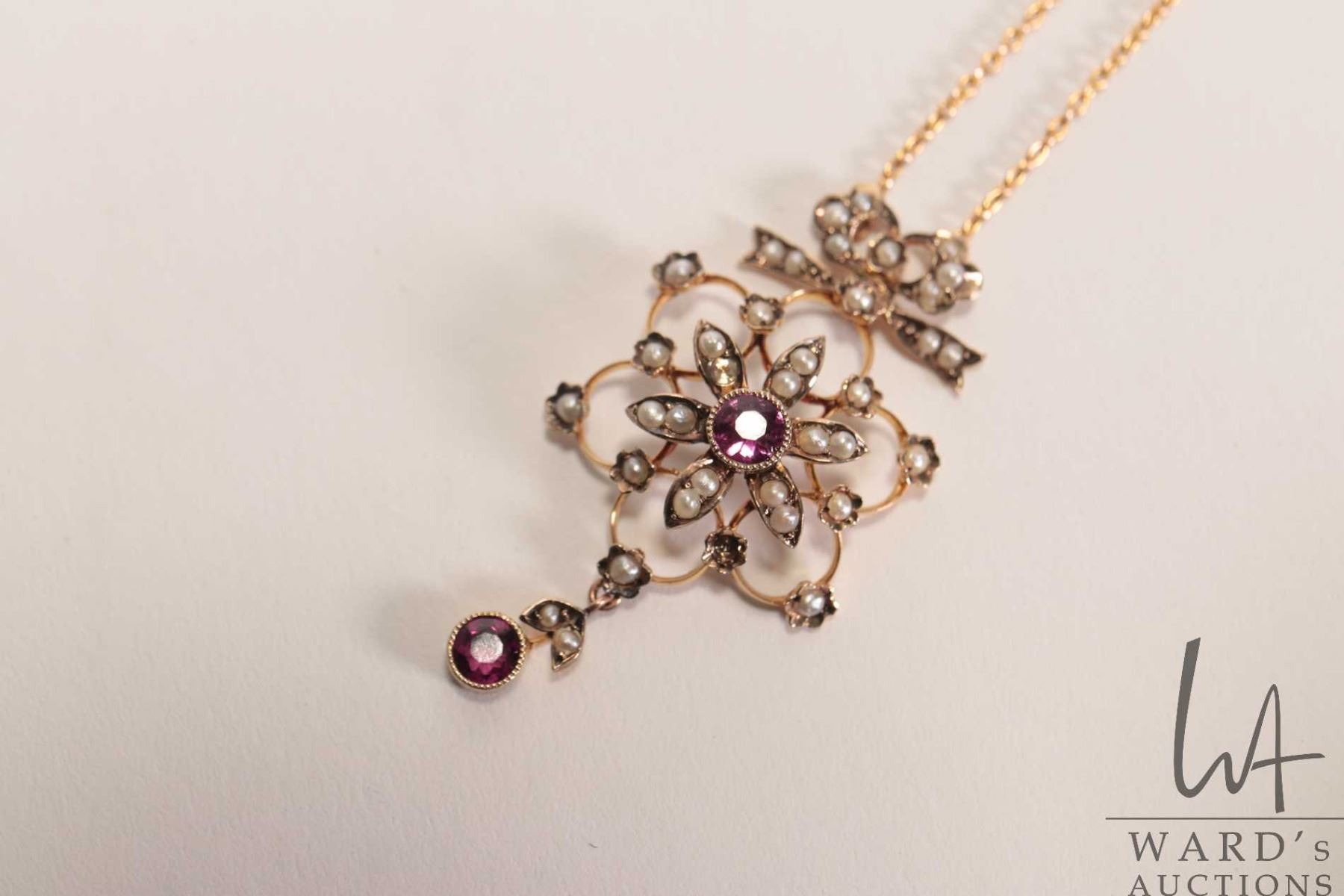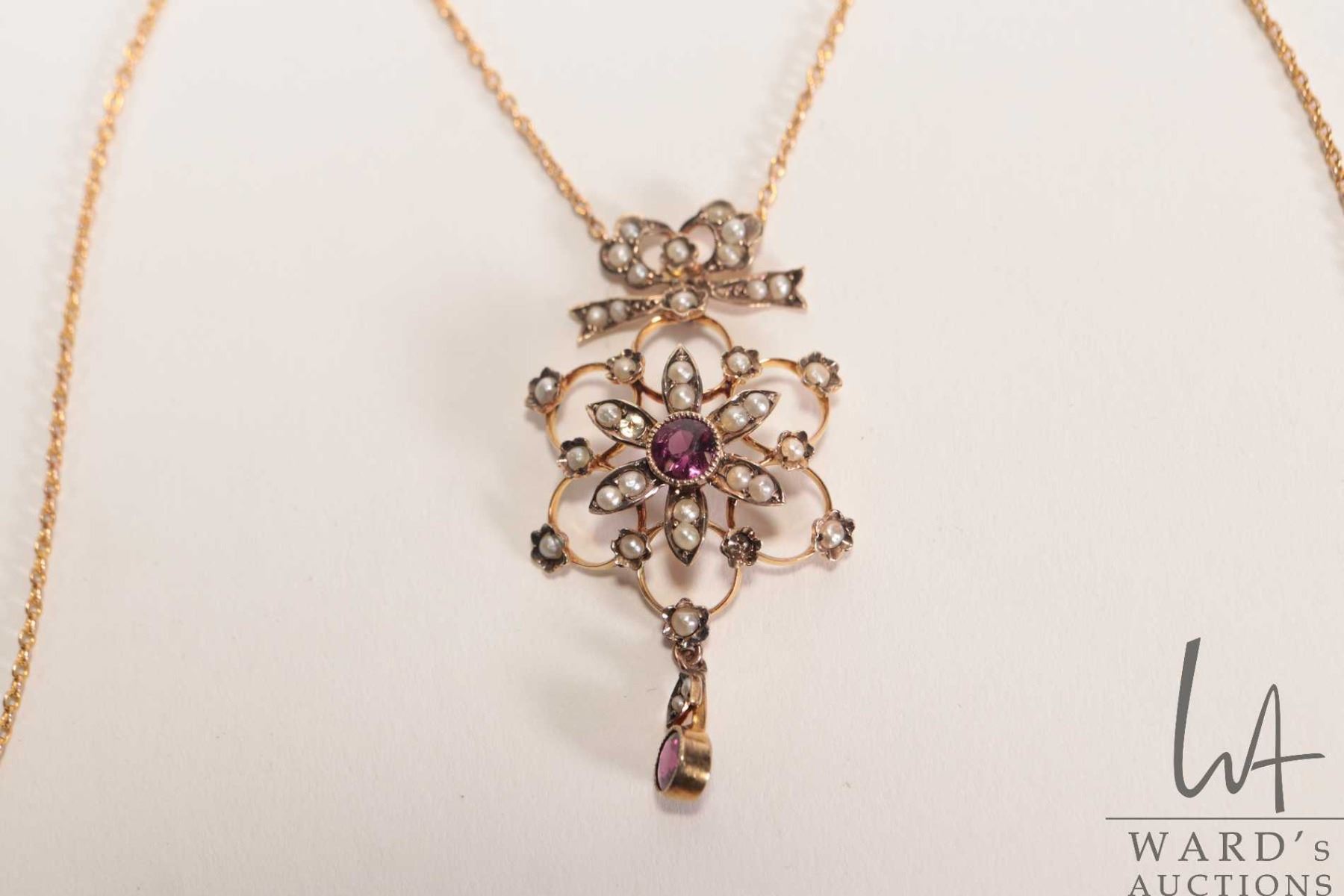Lot 42 Antique English pearl and amethyst Victorian lavaliere marked 9ct on attached 20" unmarked neck chai