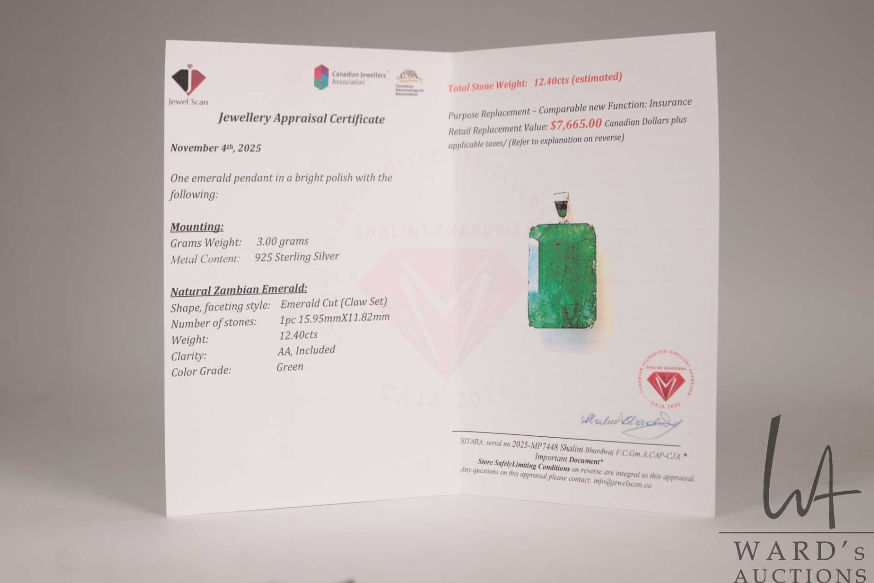 12.40 ct Zambian emerald, emerald cut gemstone in sterling silver mount with certificate provided by consignor
