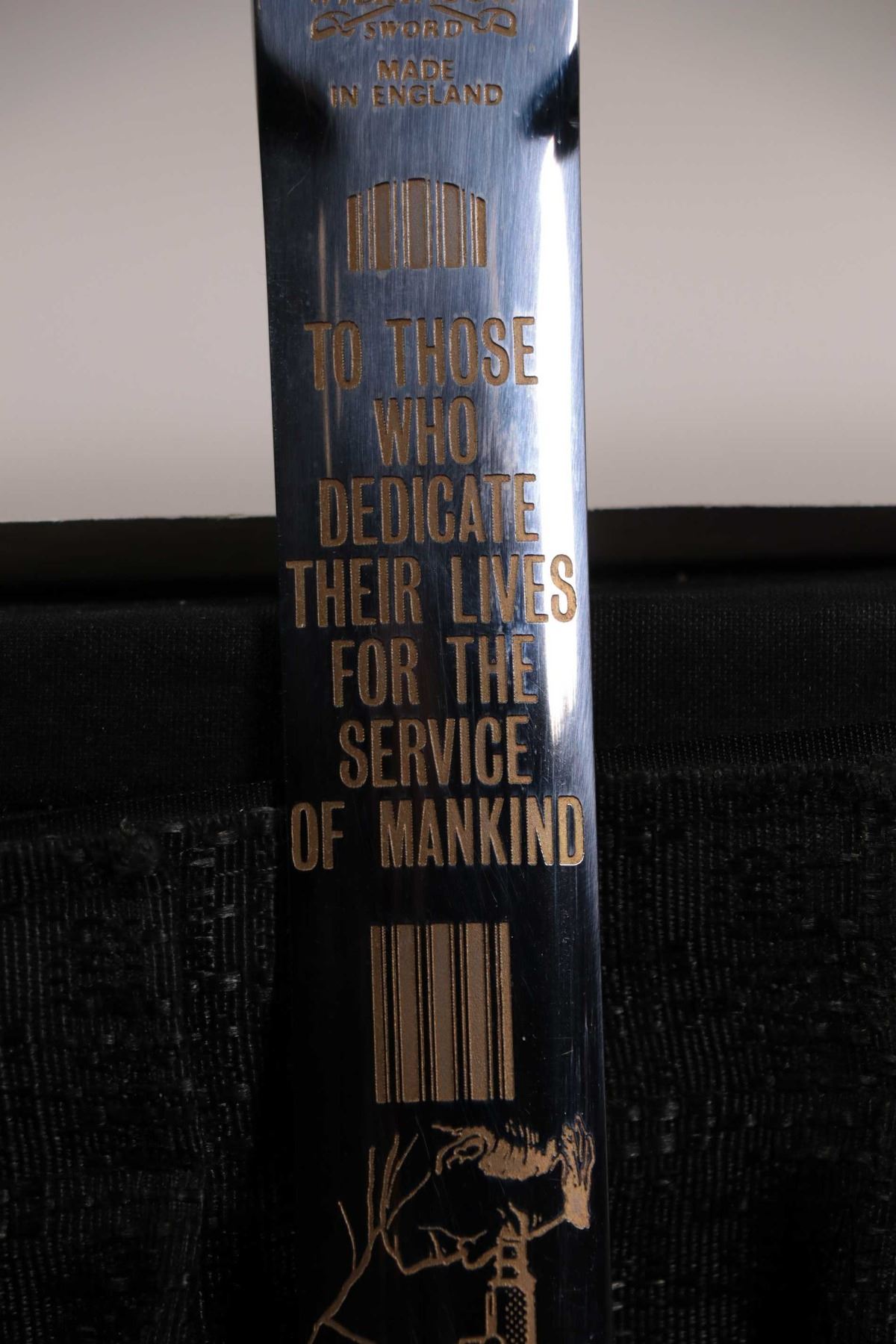Wilkinson Swords English made presentation sword "To Those Who Dedicate Their Lives for the Service of Mankind" with engraved blade, 44" in overall length