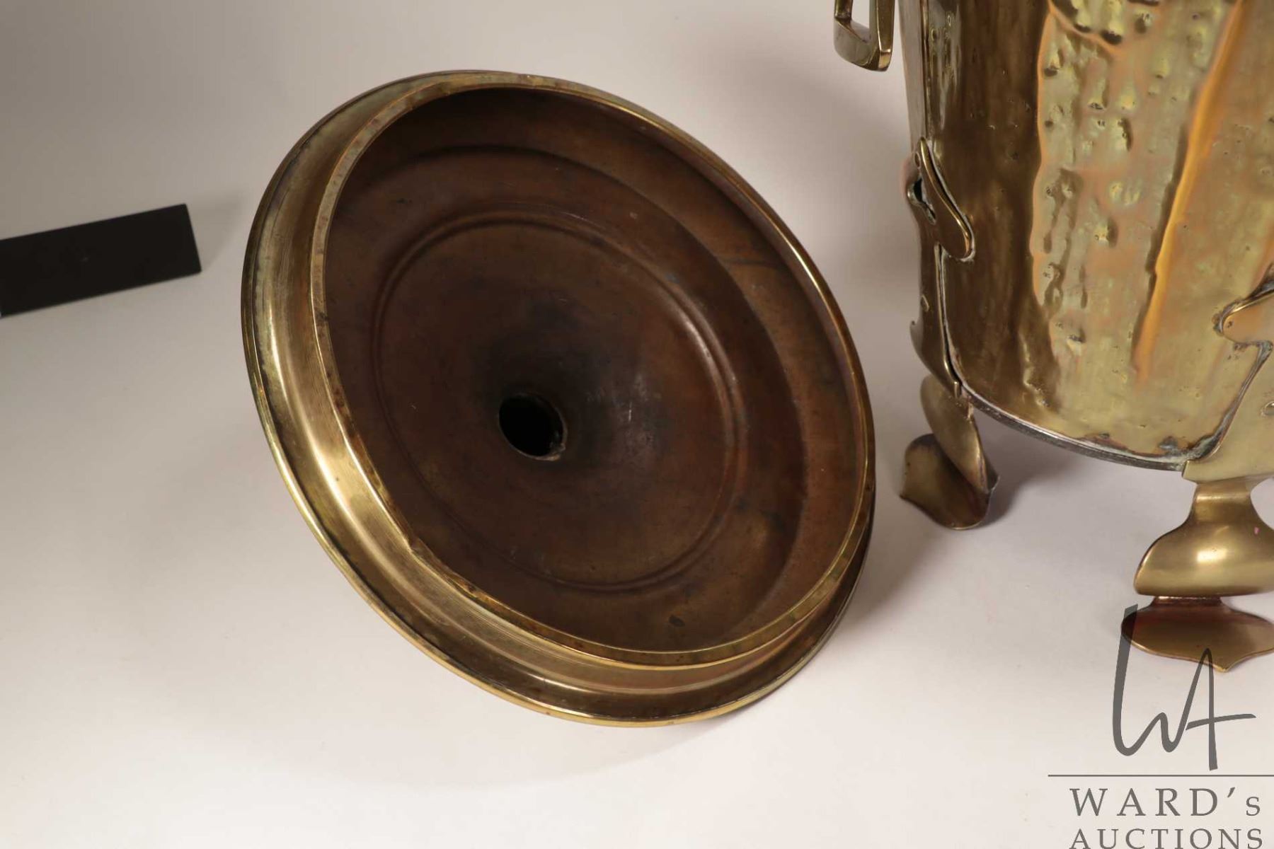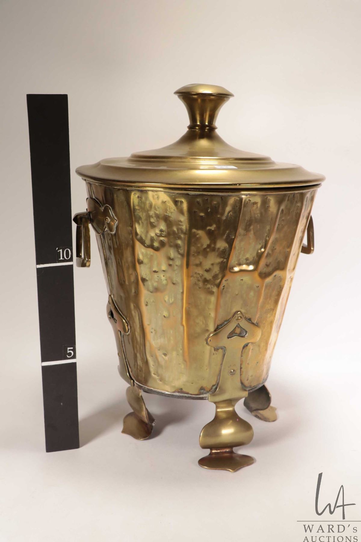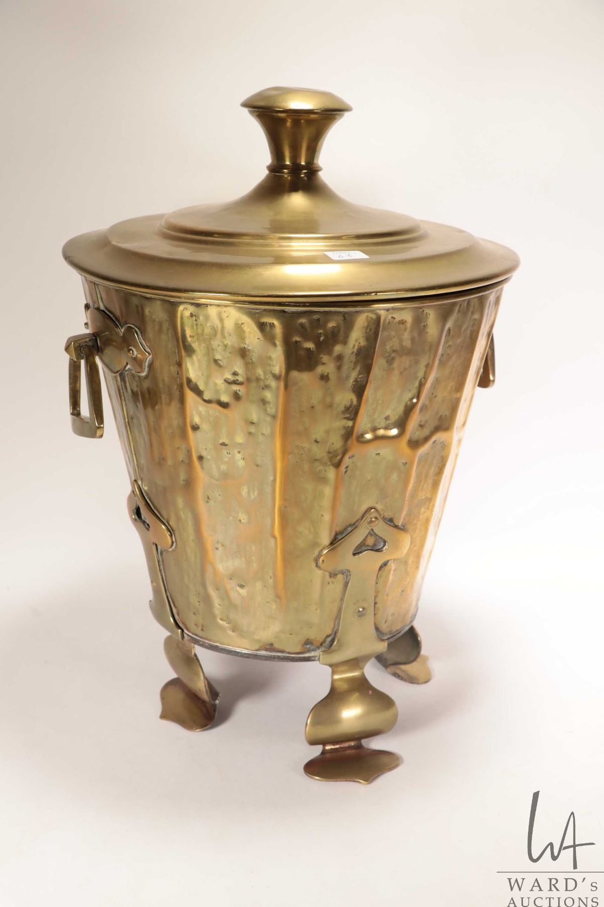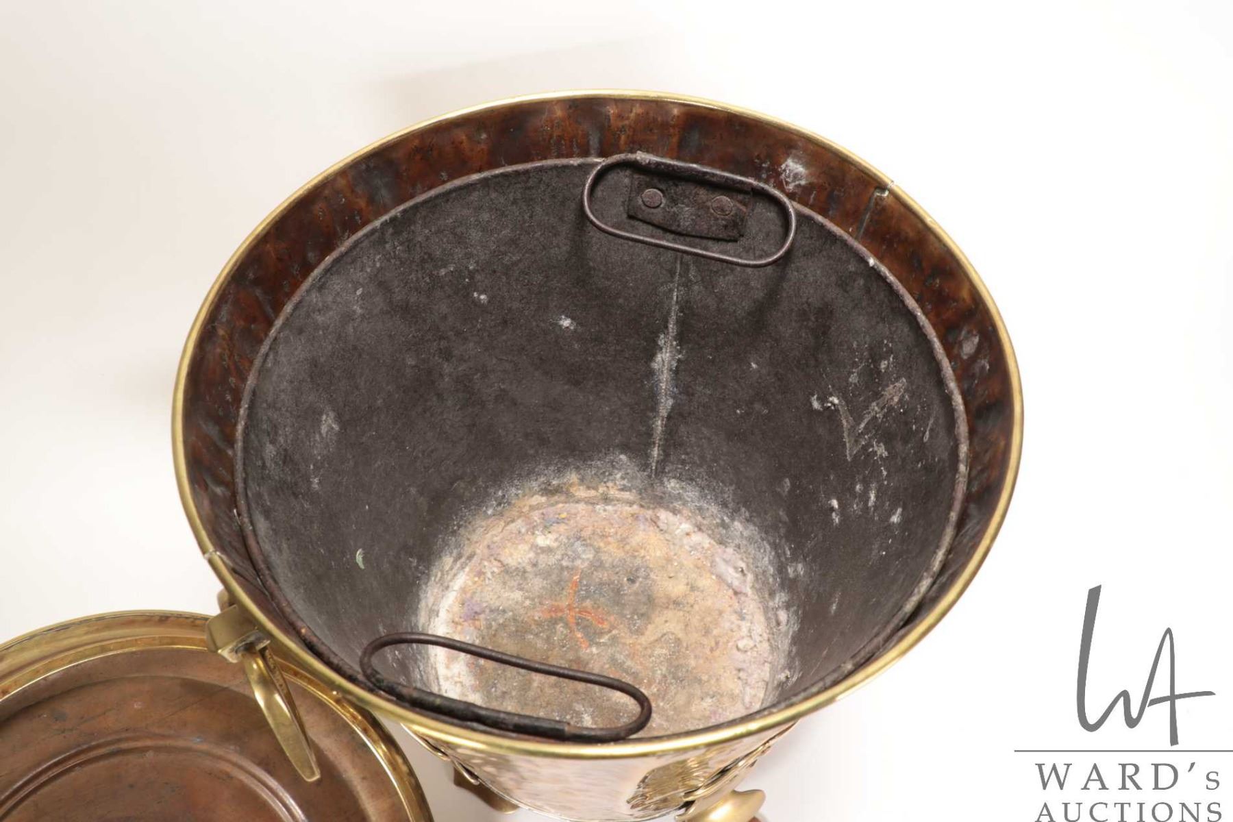 Lot 63 Antique Art Nouveau lidded hammered brass coal hod 18" in height X 12" in diameter and includes meta