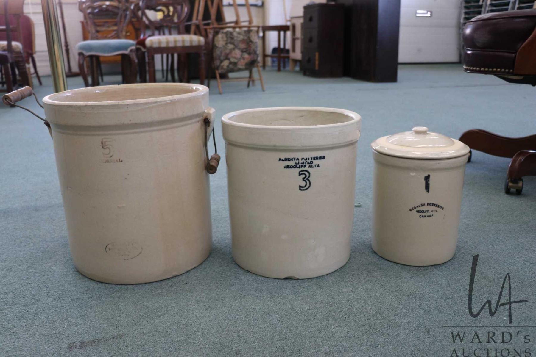 Three stoneware crocks including five gallon Medalta Potteries with handles, three gallon Alberta Potteries Ltd. and a one gallon Medalta Potteries with lid
