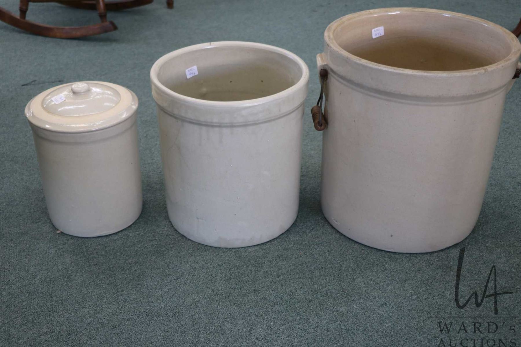 Lot 64 Three stoneware crocks including five gallon Medalta Potteries with handles, three gallon Alberta Po