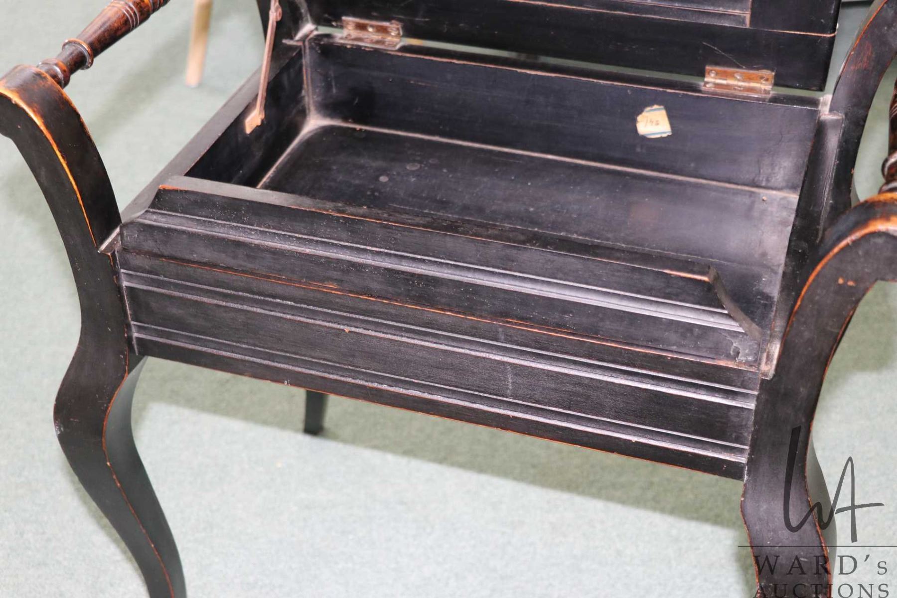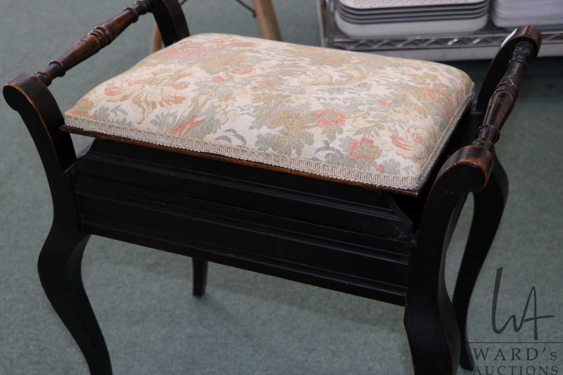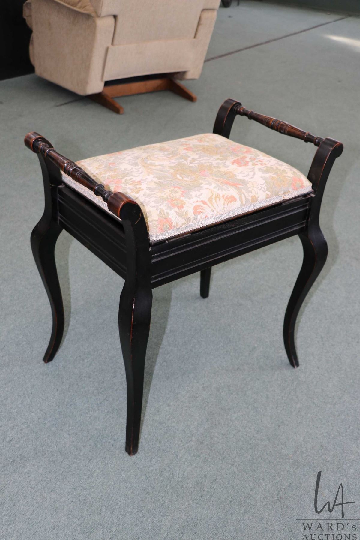 Vintage ebonized style flip lid piano stool with tapestry upholstered lid and flip up seat adjuster, 22" to top of seat