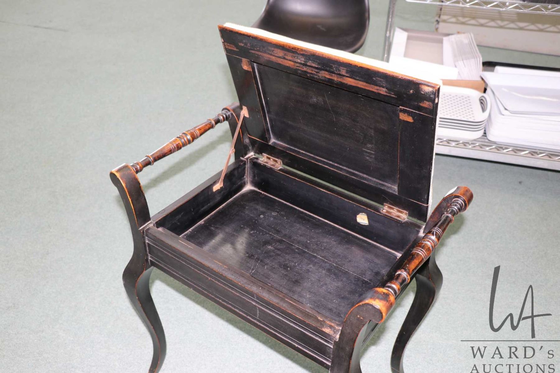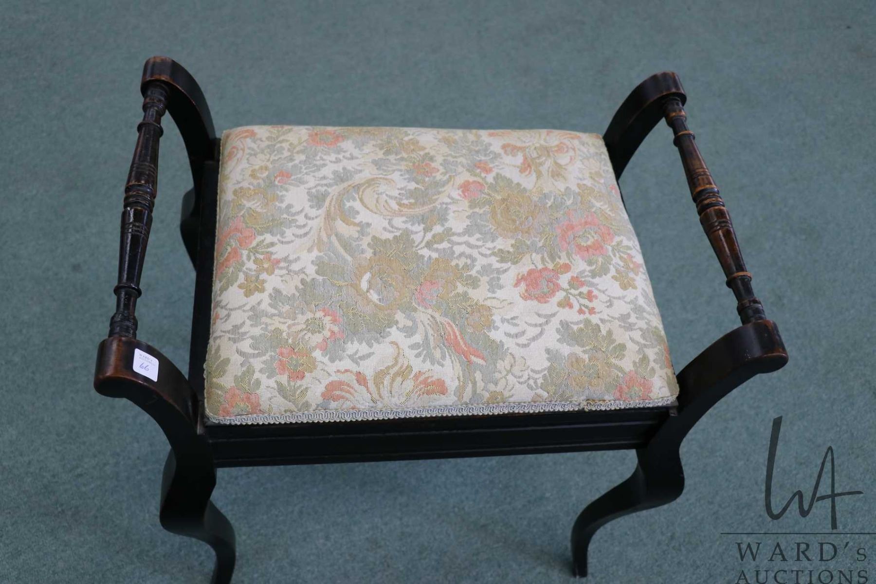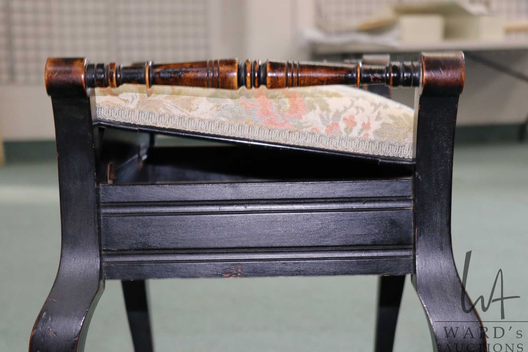Vintage ebonized style flip lid piano stool with tapestry upholstered lid and flip up seat adjuster, 22" to top of seat