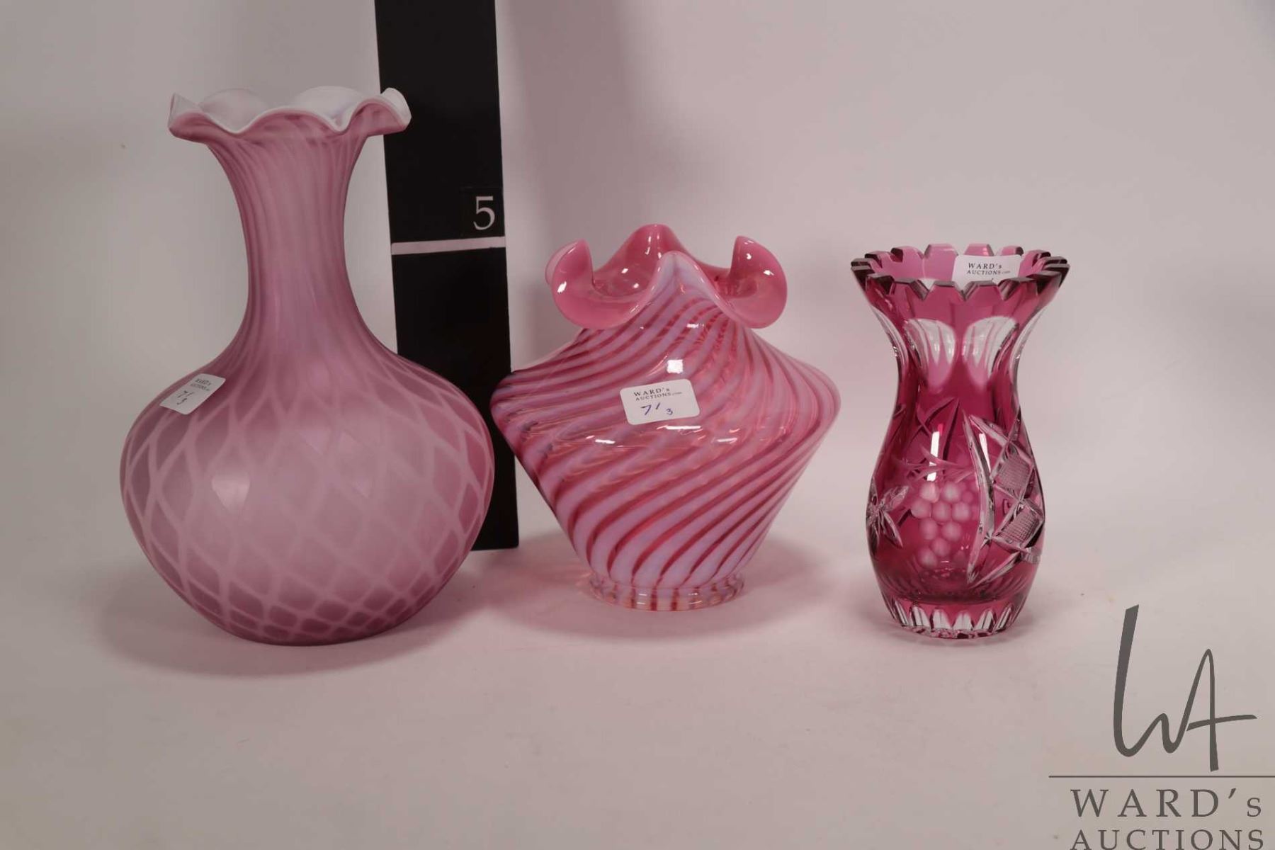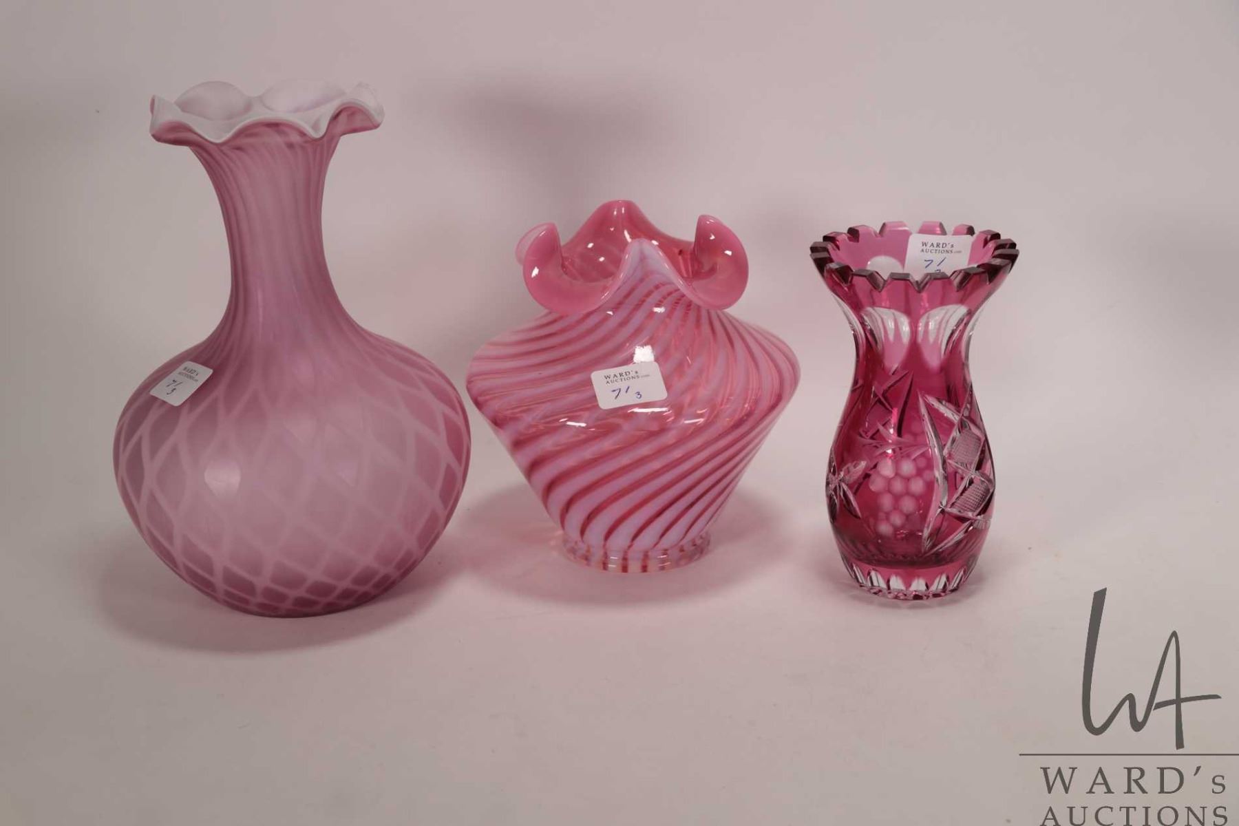 Lot 71 Three pieces of vintage collectible glass including Victorian style quilted cased satin glass 8" vas