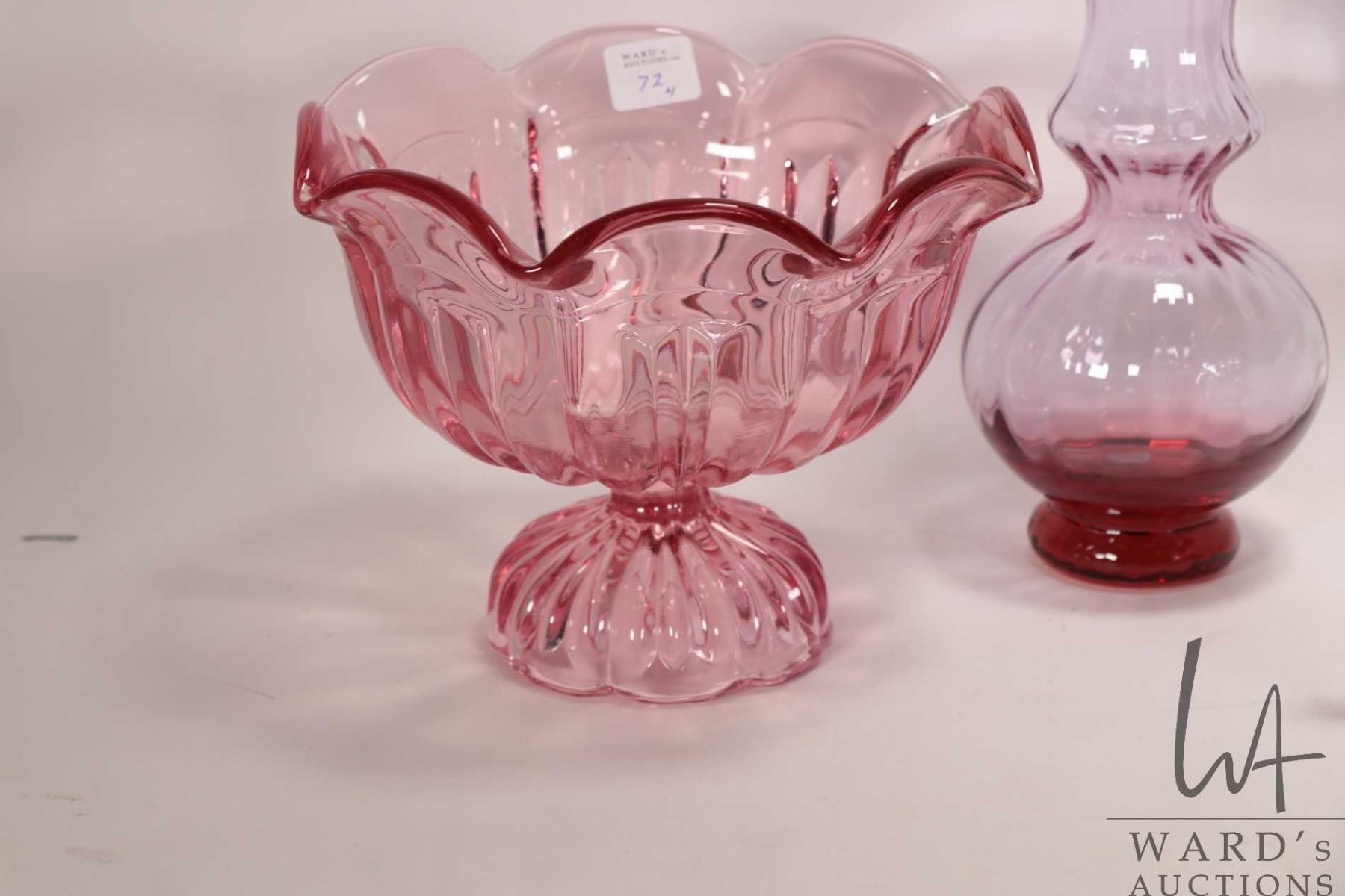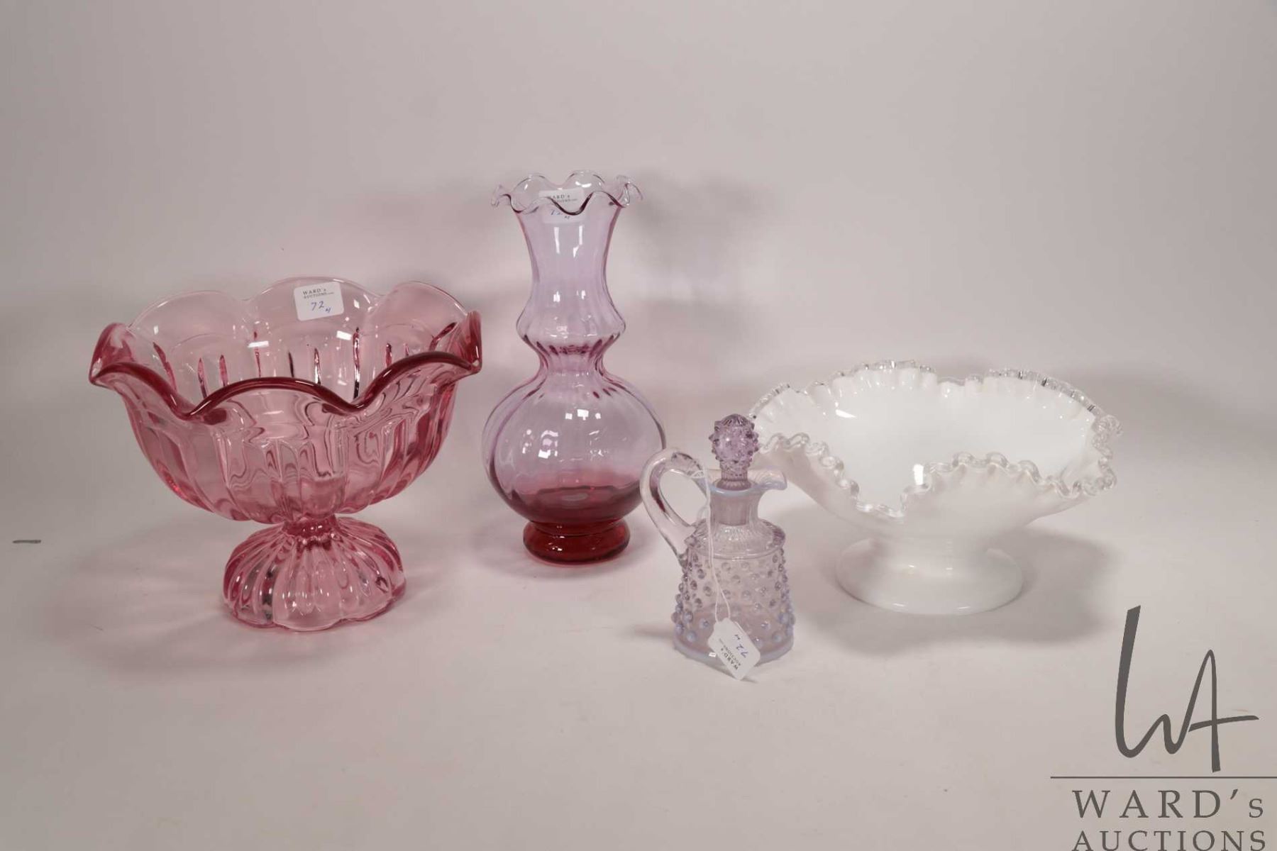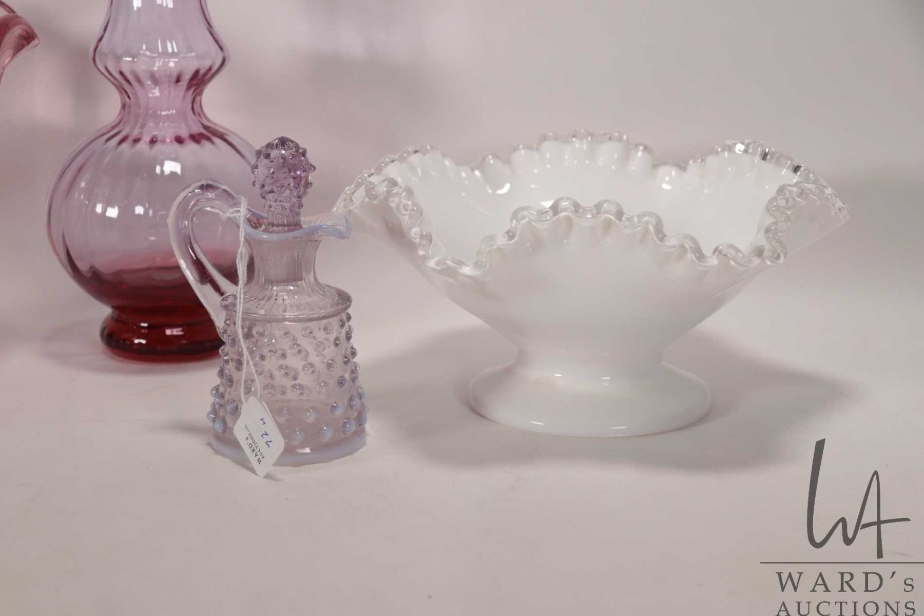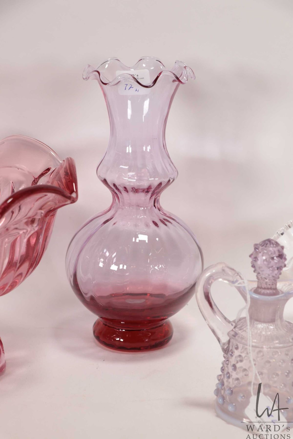 Selection of vintage collectible glass including milk glass comport with applied clear ruffled edge, pink pedestal bowl 6" in height, light purple melon vase with ruffled edge 8" in height and a purple opalescent hobnail lidded cruet