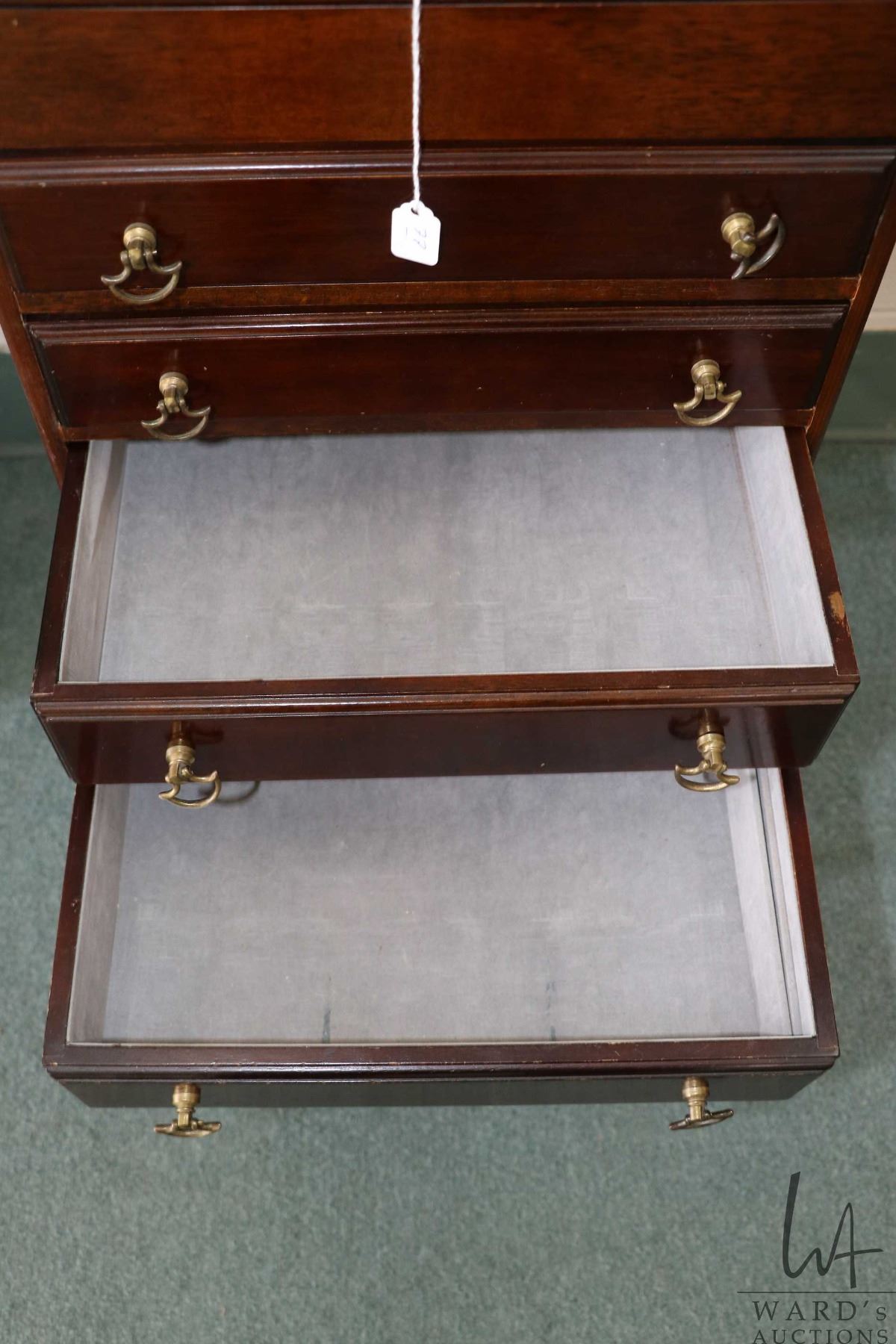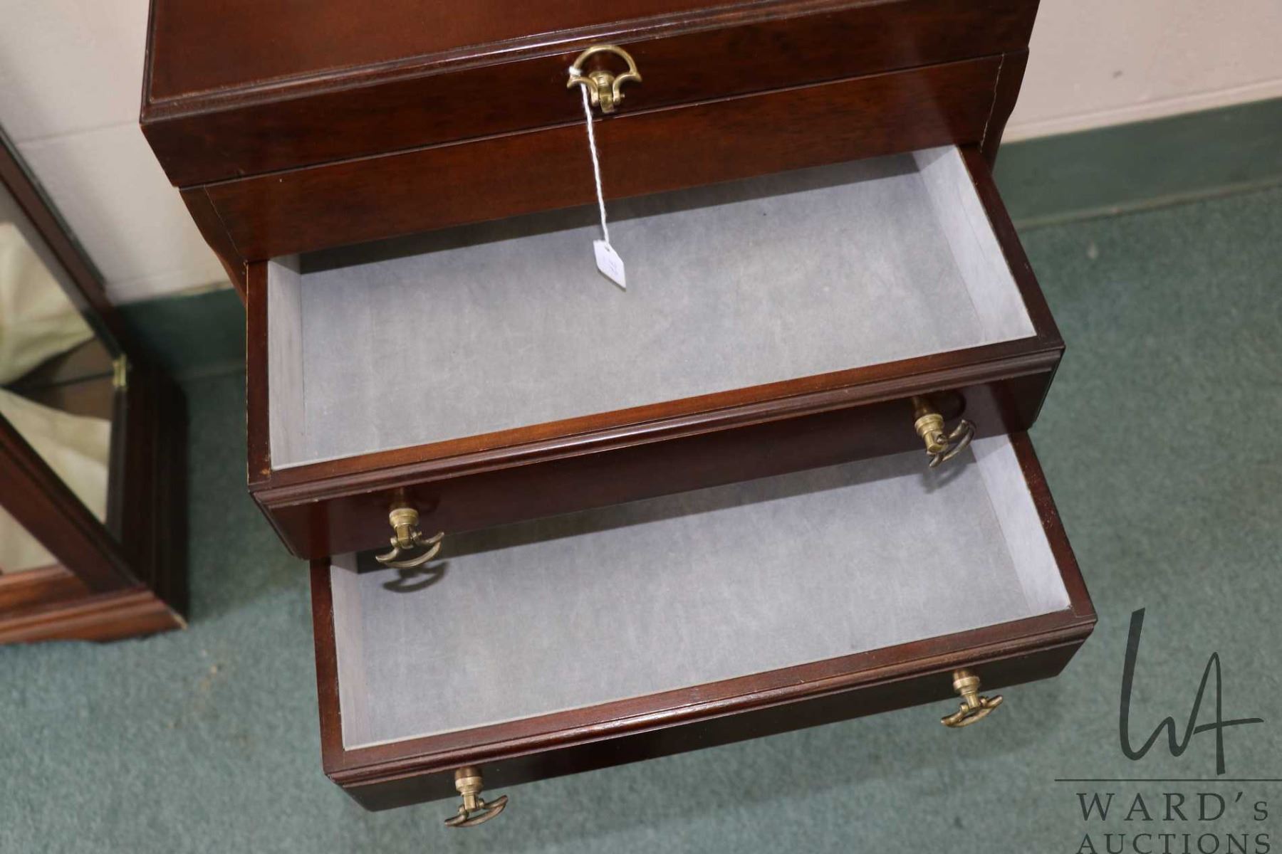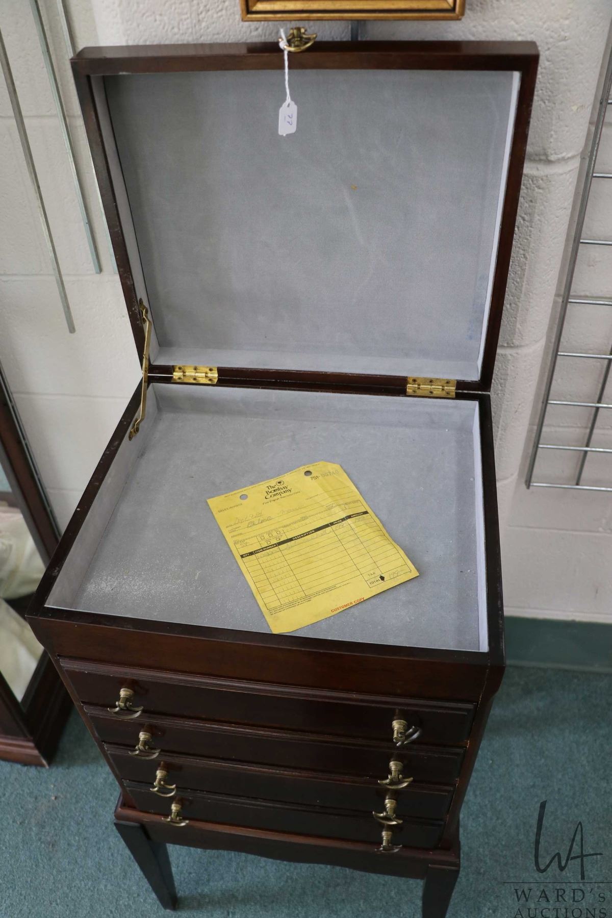 Lot 77 Four drawer, flip up lid flatware case made by the Bombay Company, note: chest is on separate stand,