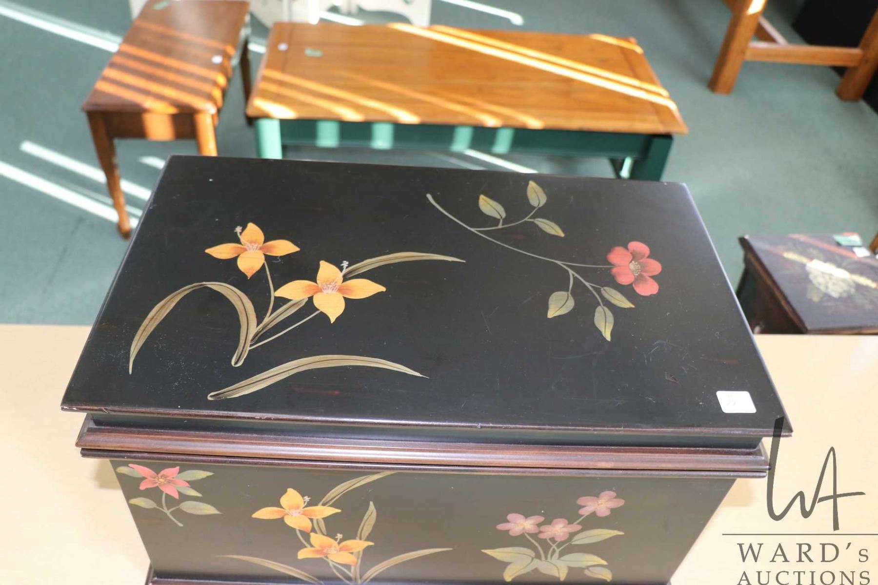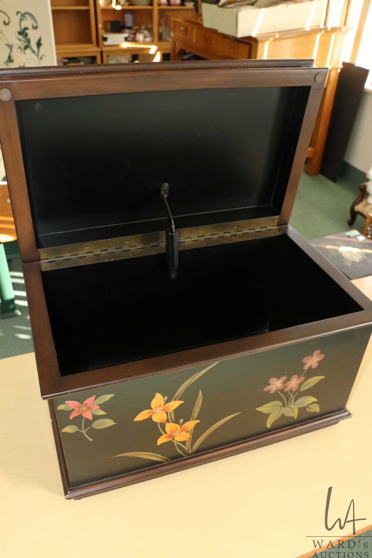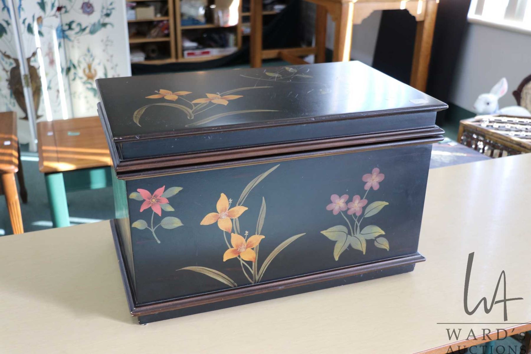 Lot 79 Vintage black lacquer style lidded chest with Chinoserie florals, 12 1/2" H X 20" L X 12" D