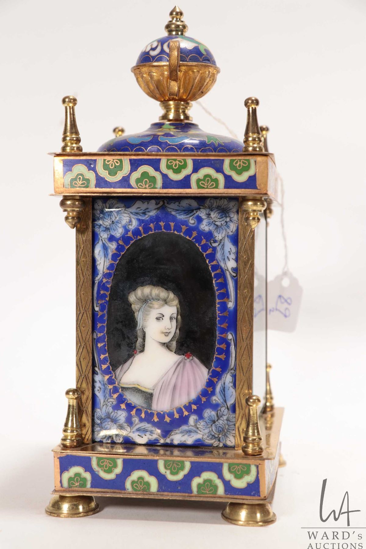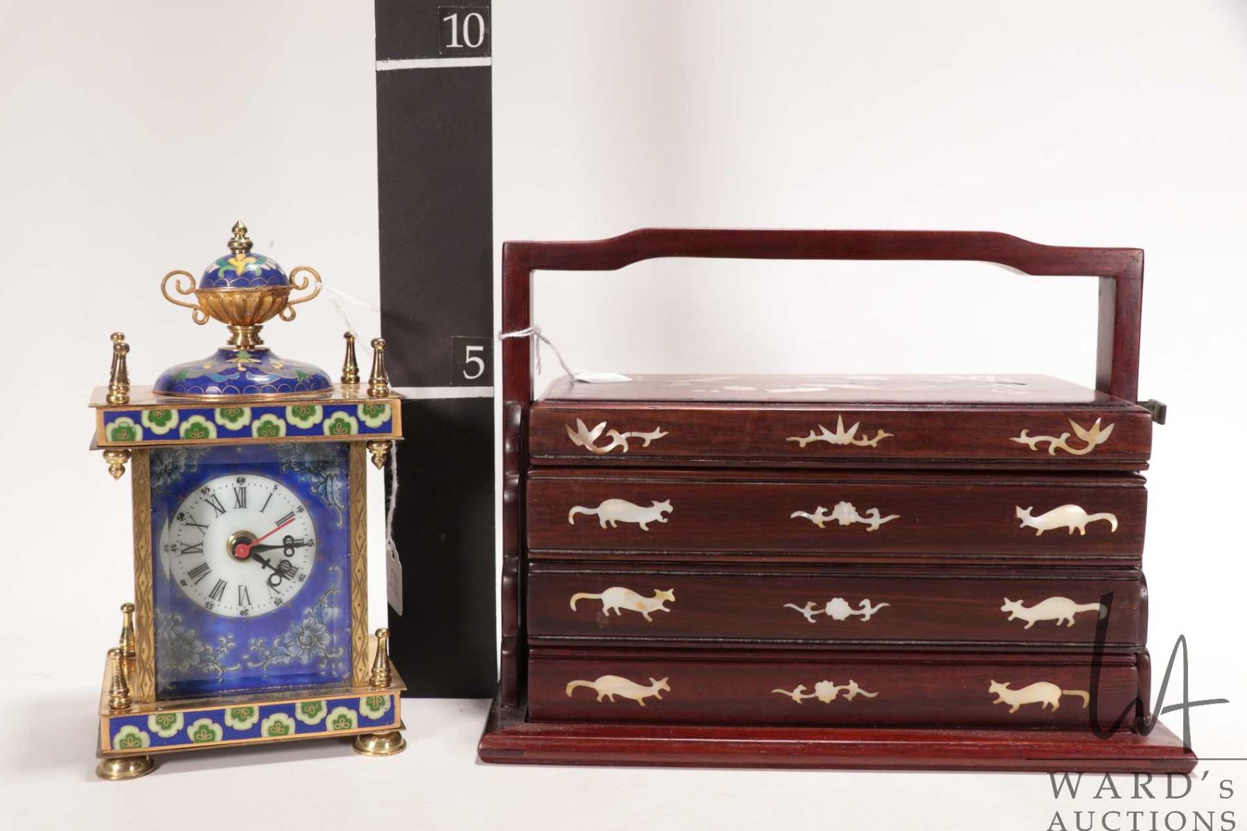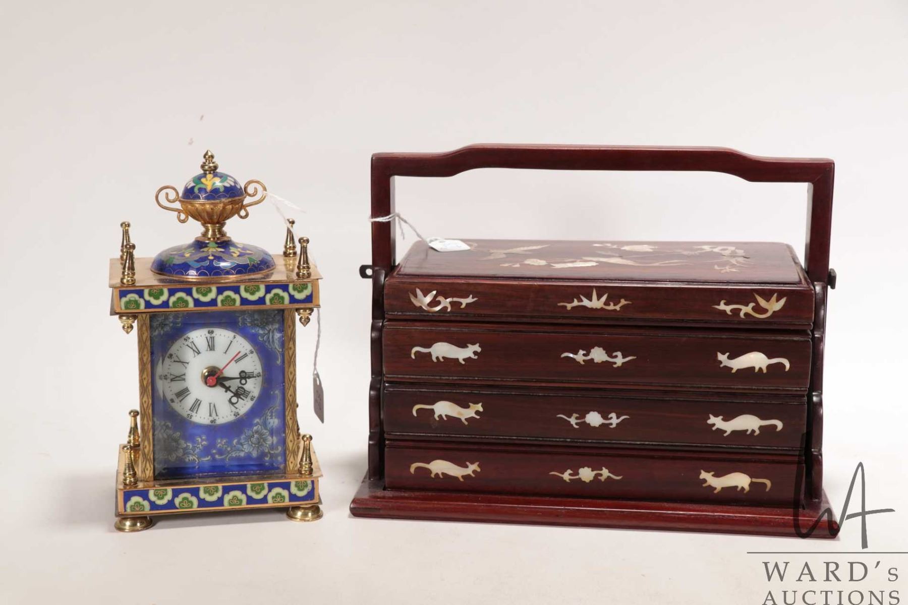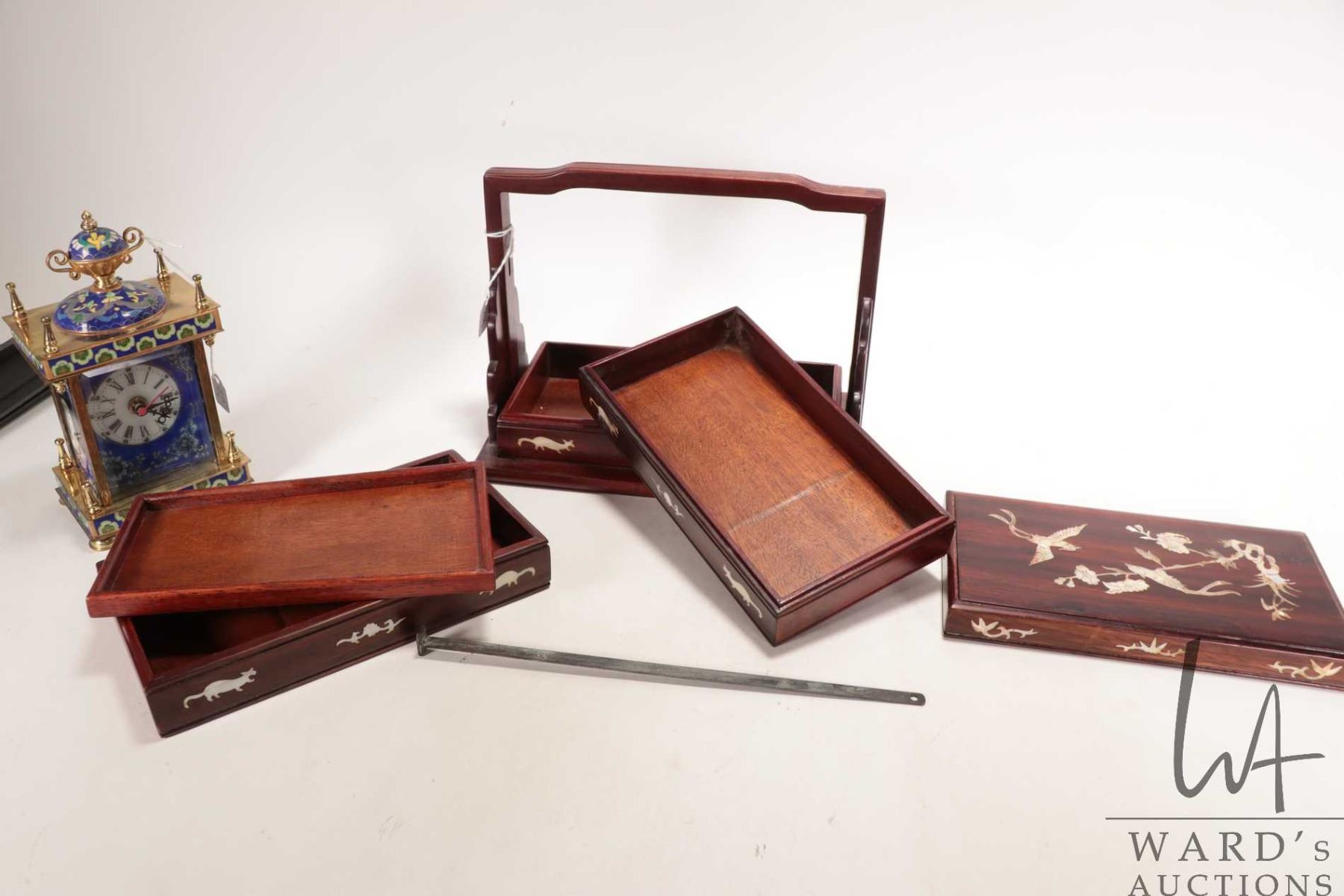 Vintage four layer rose wood storage box with mother of pearl inlay and a Cloisonne enamel and portrait mantle quartz clock, not working at time of cataloguing
