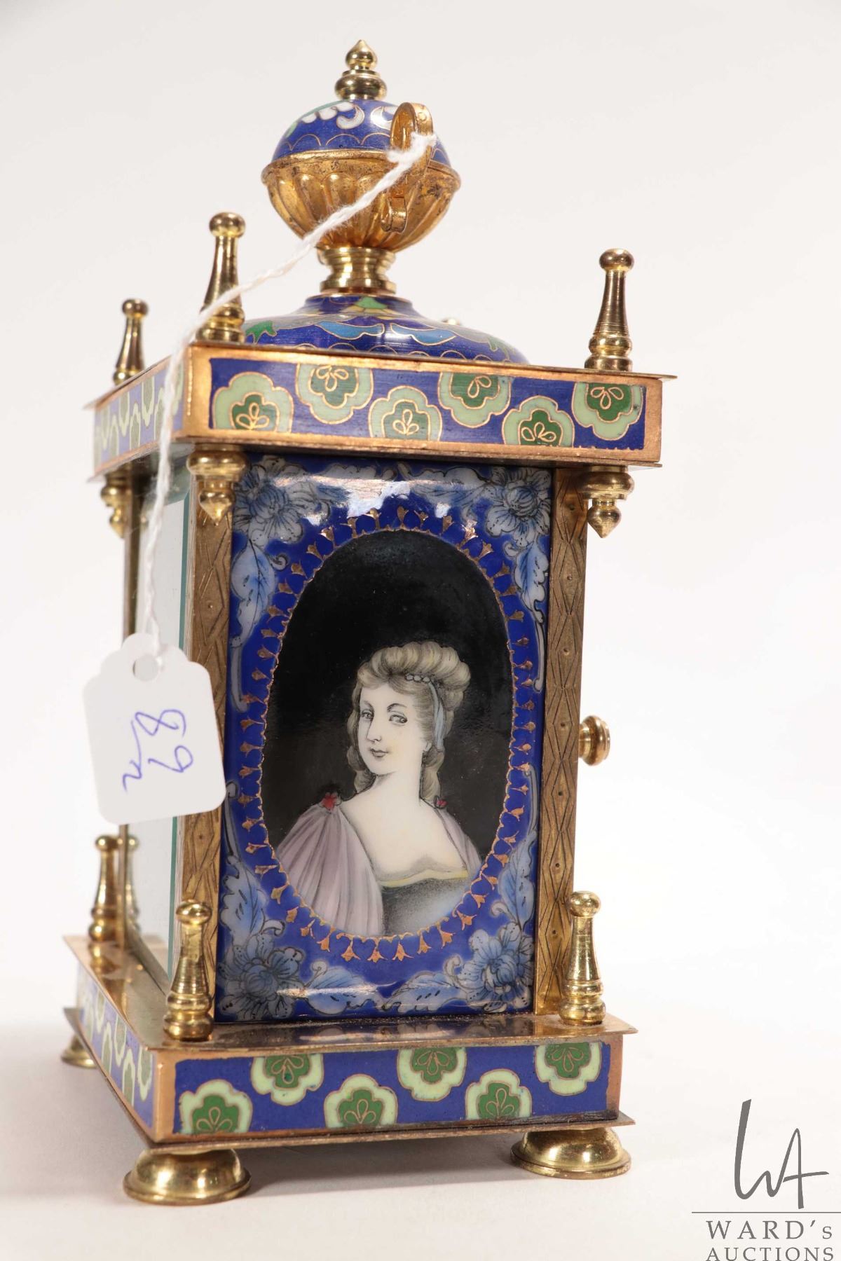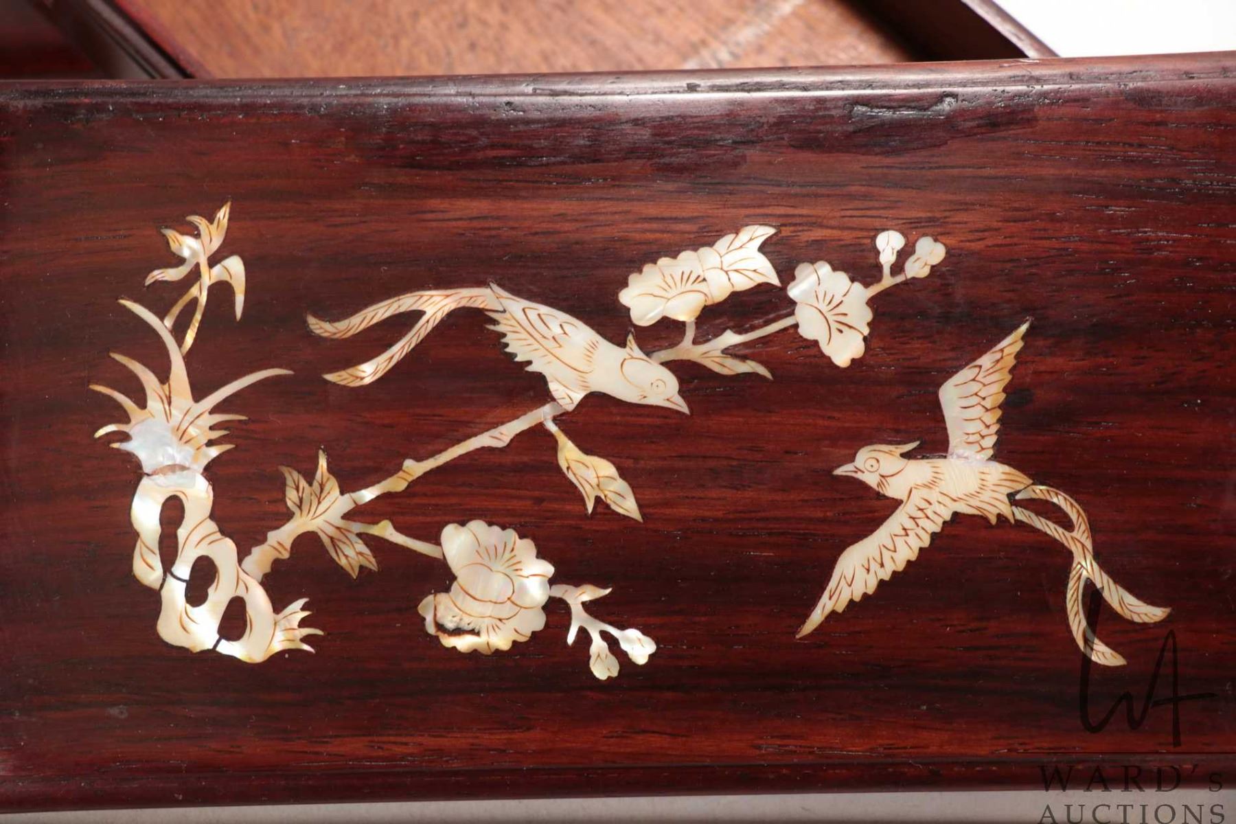 Lot 89 Vintage four layer rose wood storage box with mother of pearl inlay and a Cloisonne enamel and portr