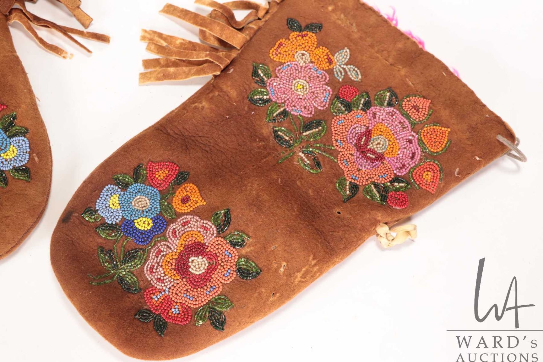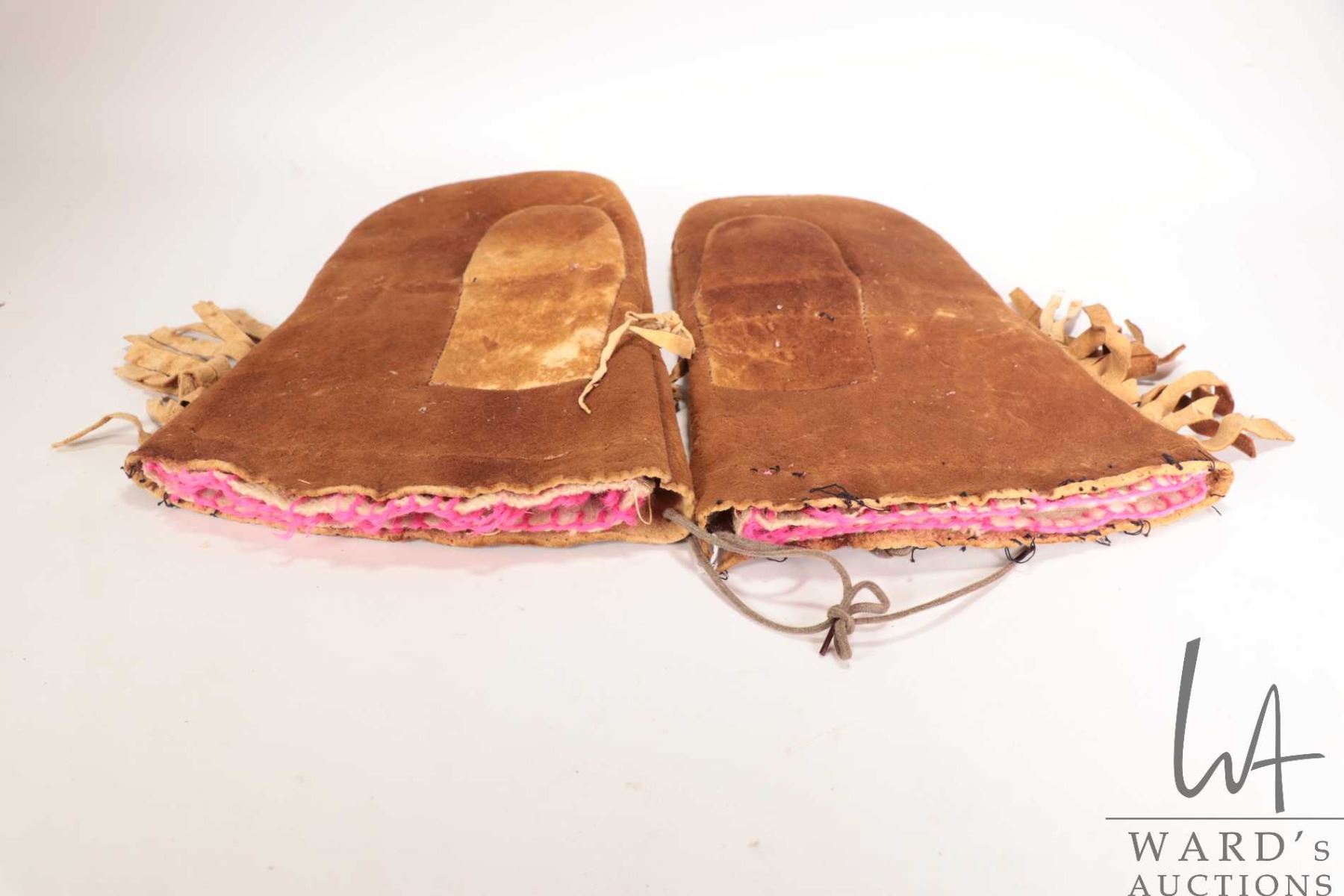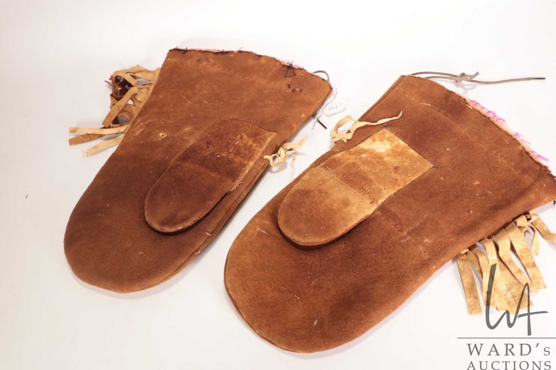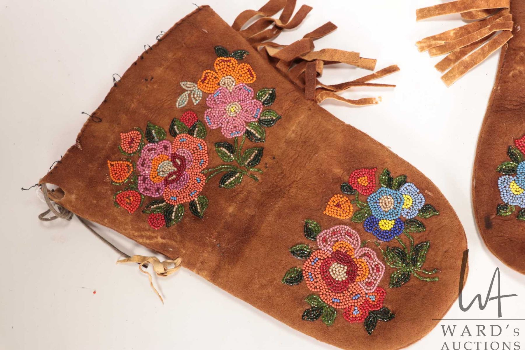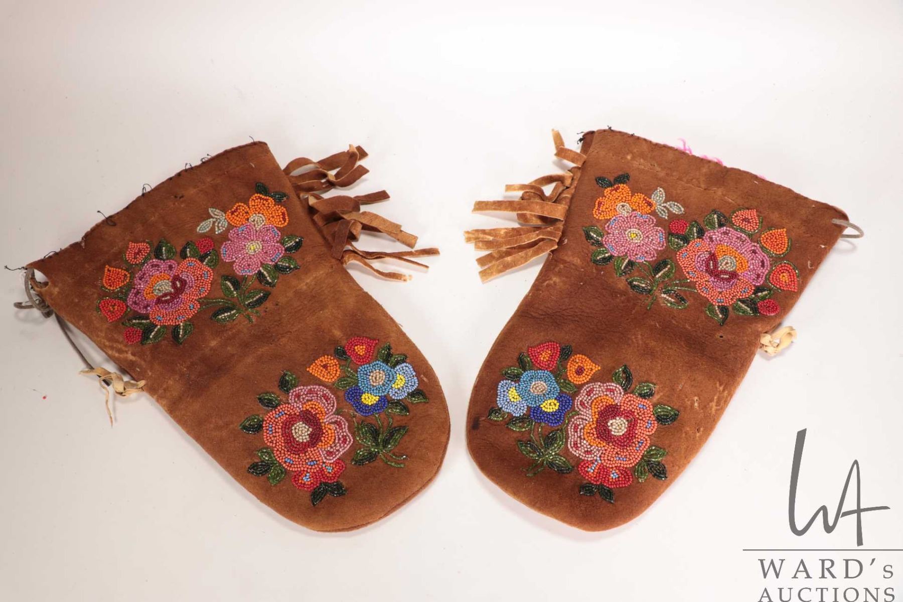 Lot 102 Pair of Canadian Indigenous gauntlet mittens with beaded Ojibway rose design and wool liners