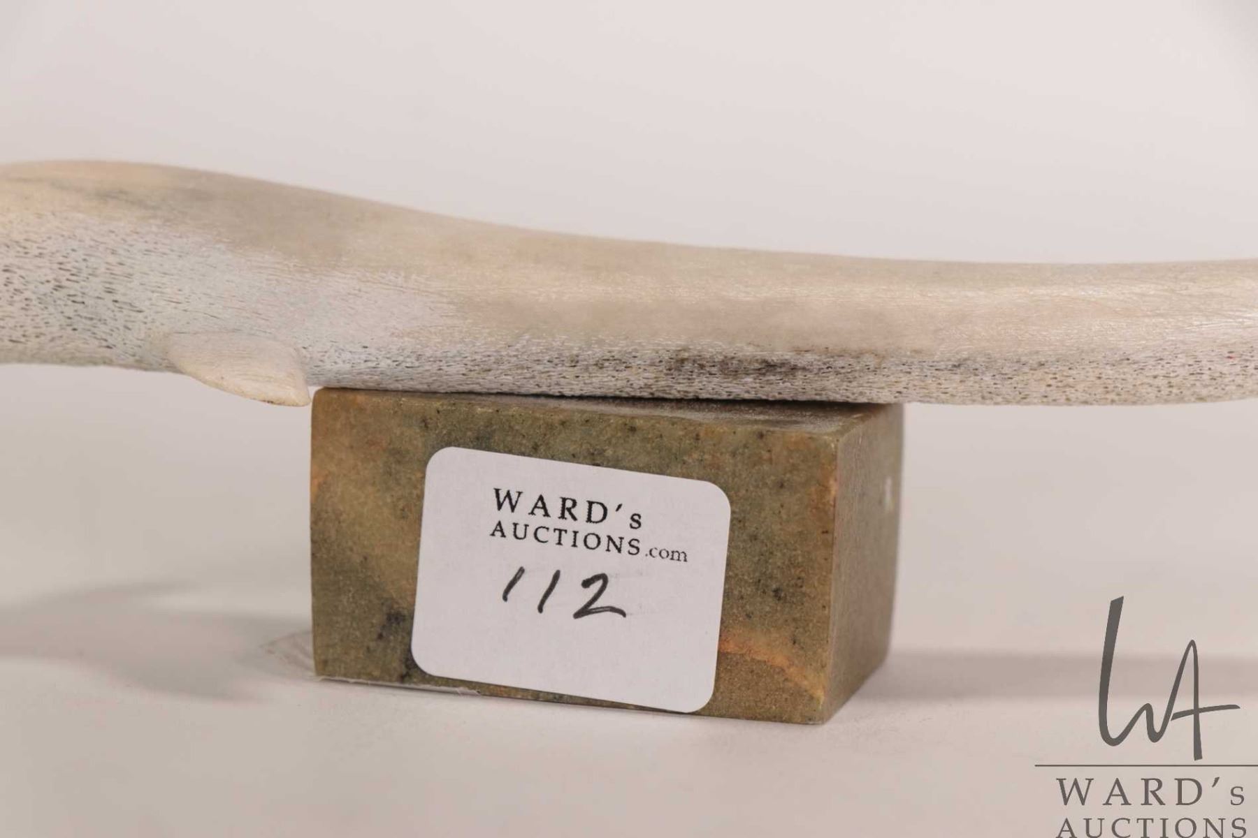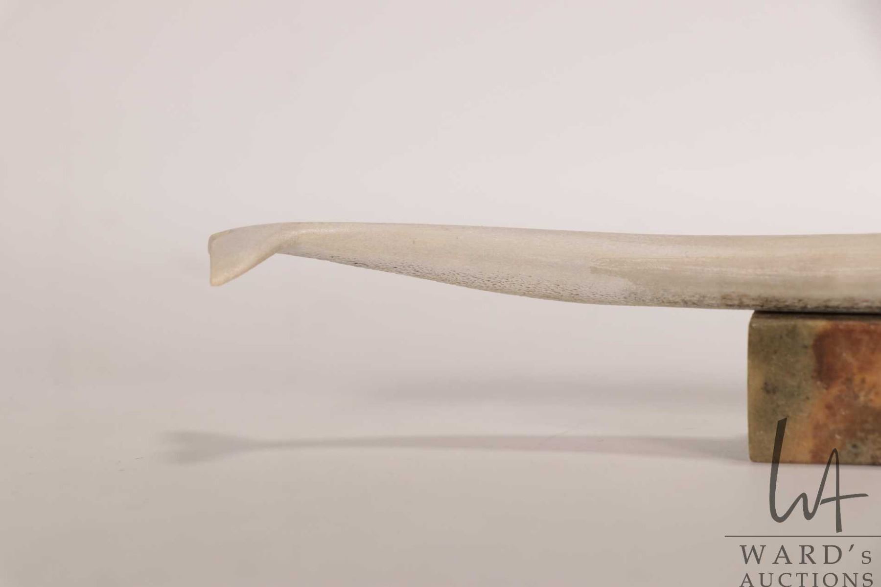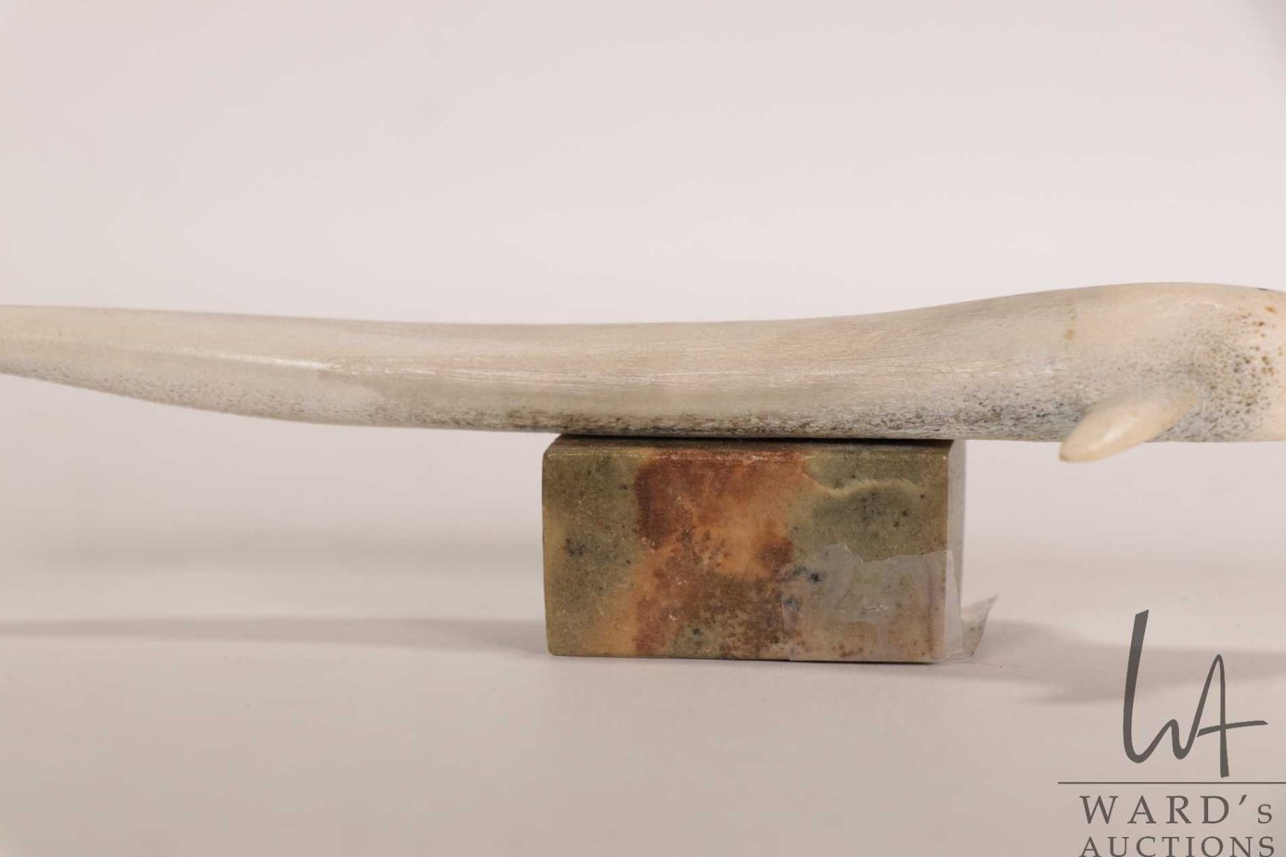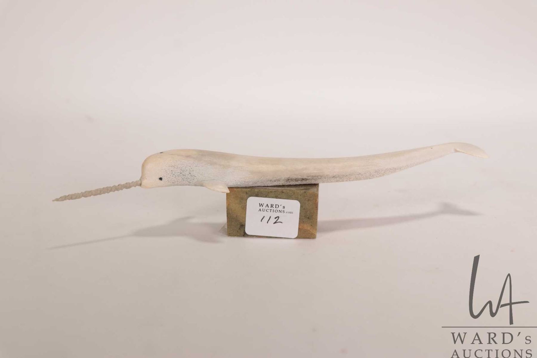 Lot 112 Inuit whalebone carved narwhal on soapstone plinth, retains part of it's original Eskimo Art label a