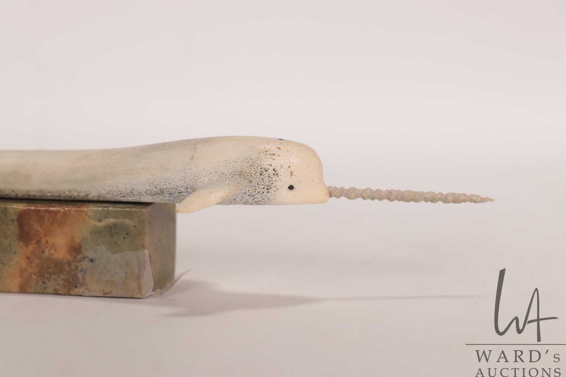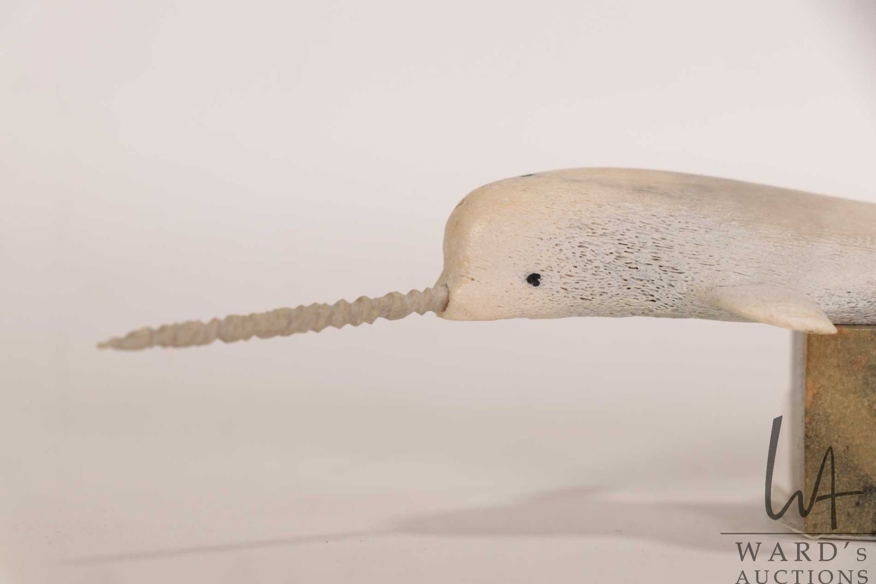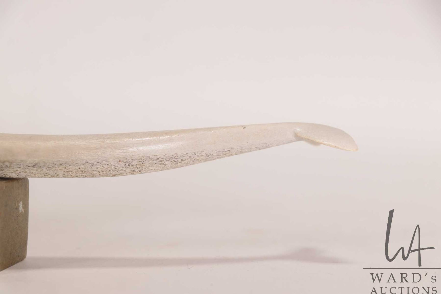 Inuit whalebone carved narwhal on soapstone plinth, retains part of it's original Eskimo Art label and is numbered 0533, 8 3/4" in length. Note: appears to have had one fin glued