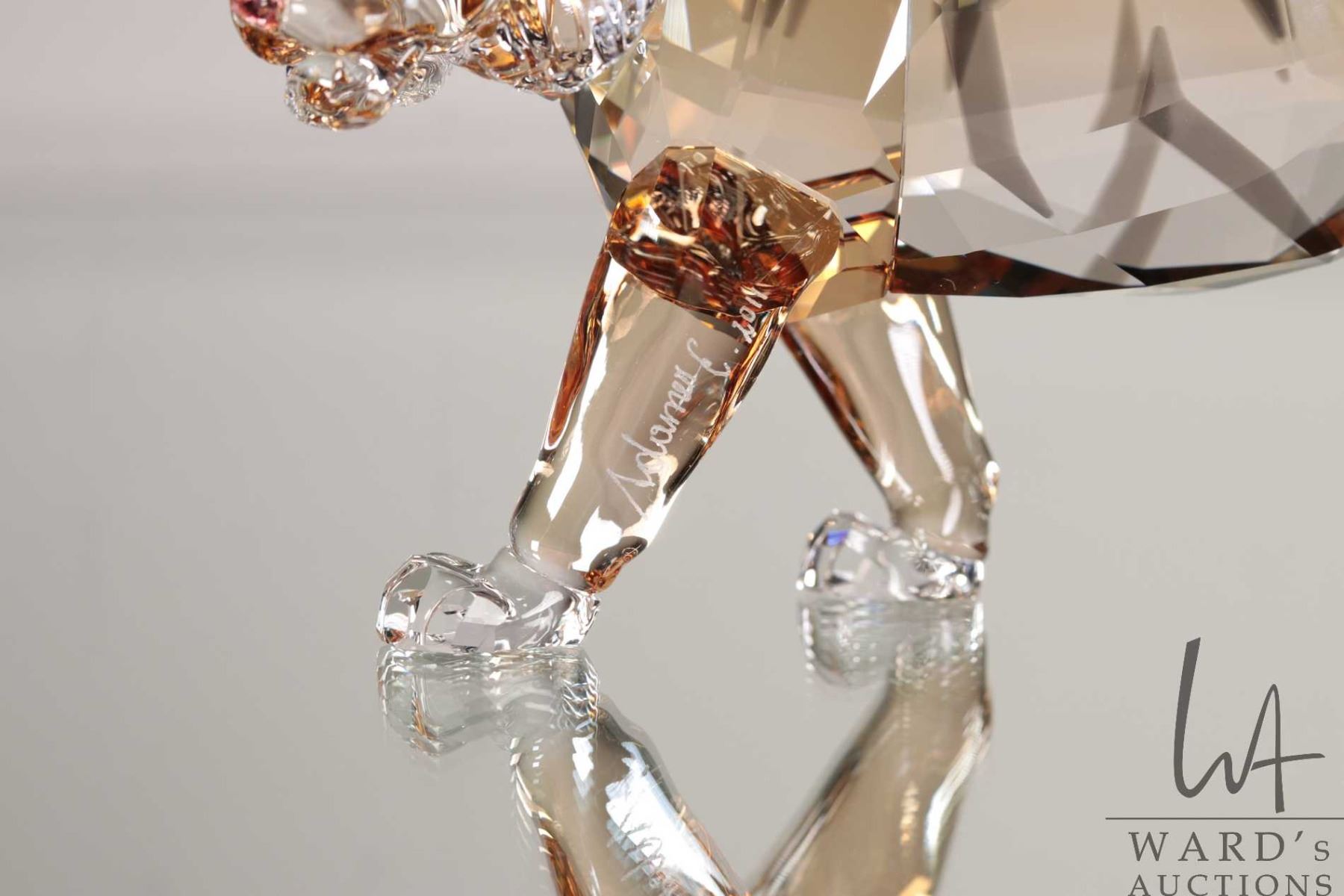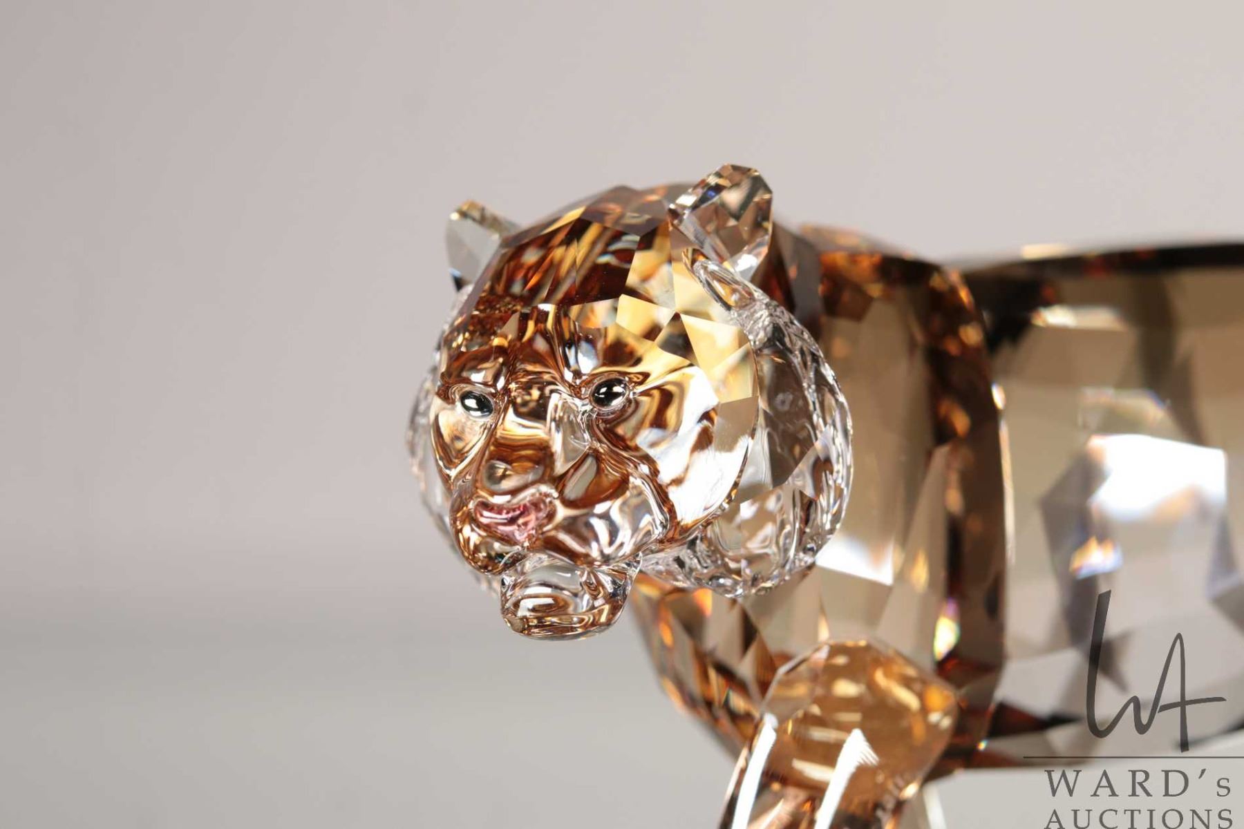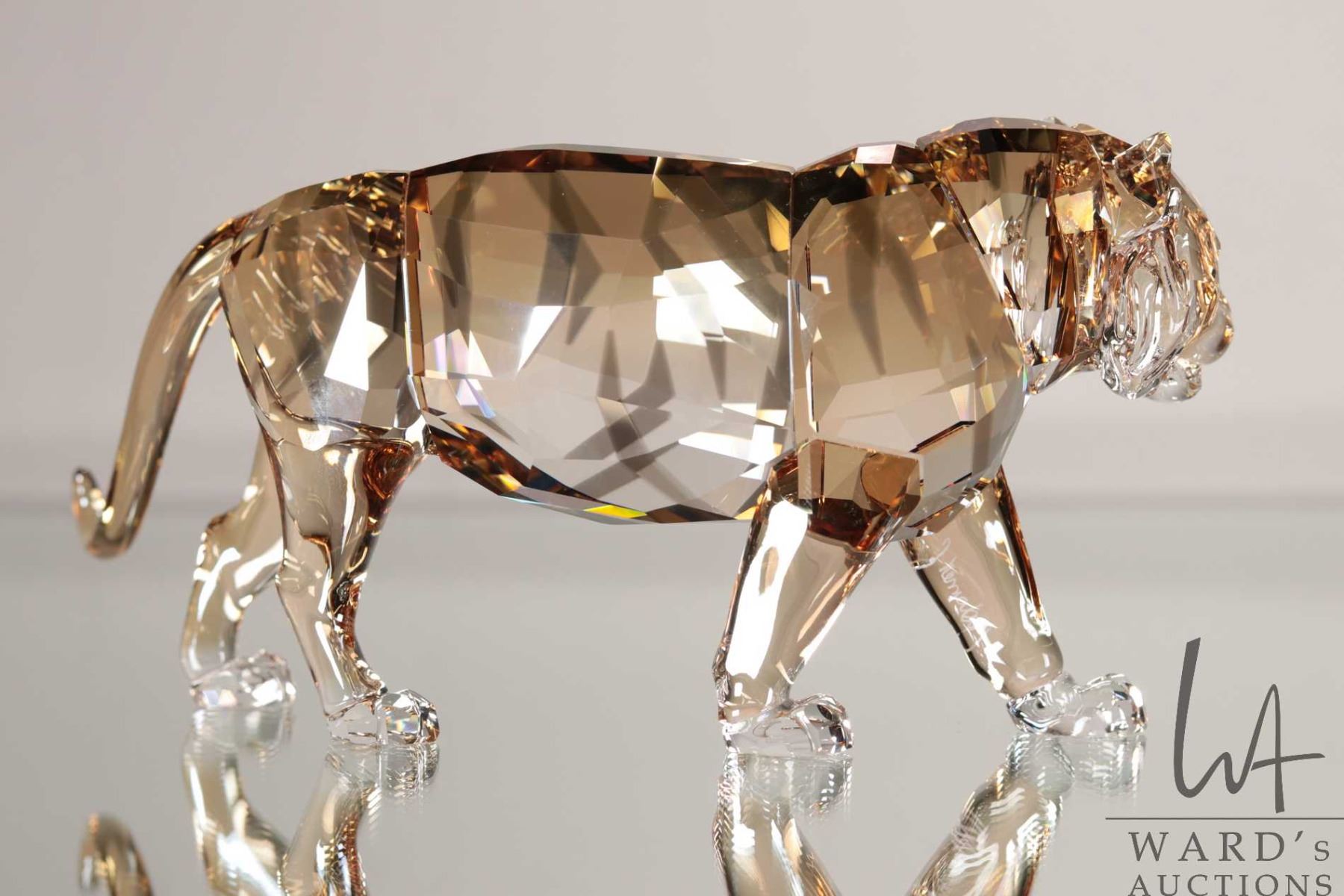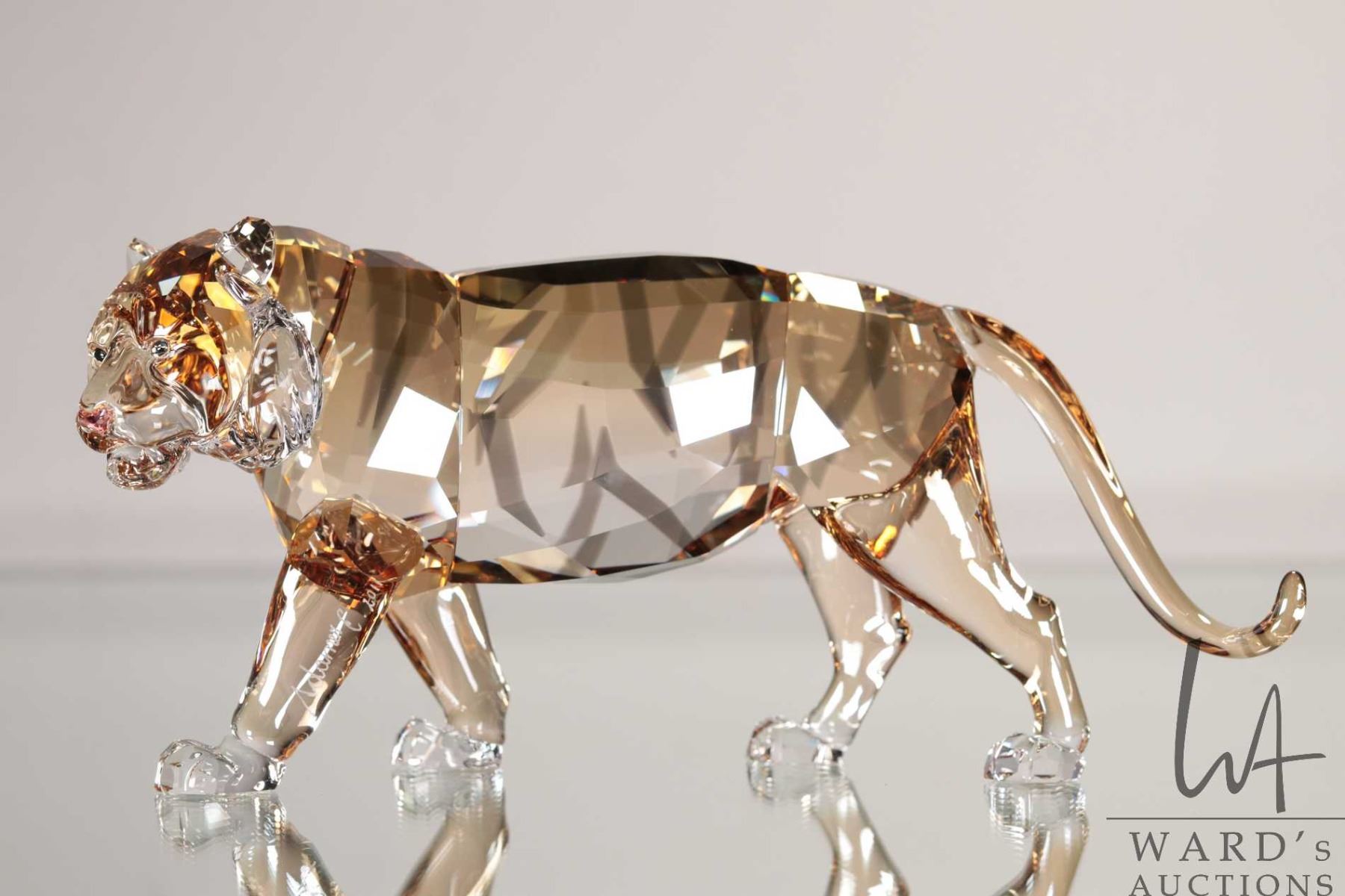 Lot 117 Swarovski amber crystal "Tiger" no. 1003148, 3 1/2" in height. Includes original box and a mirrored