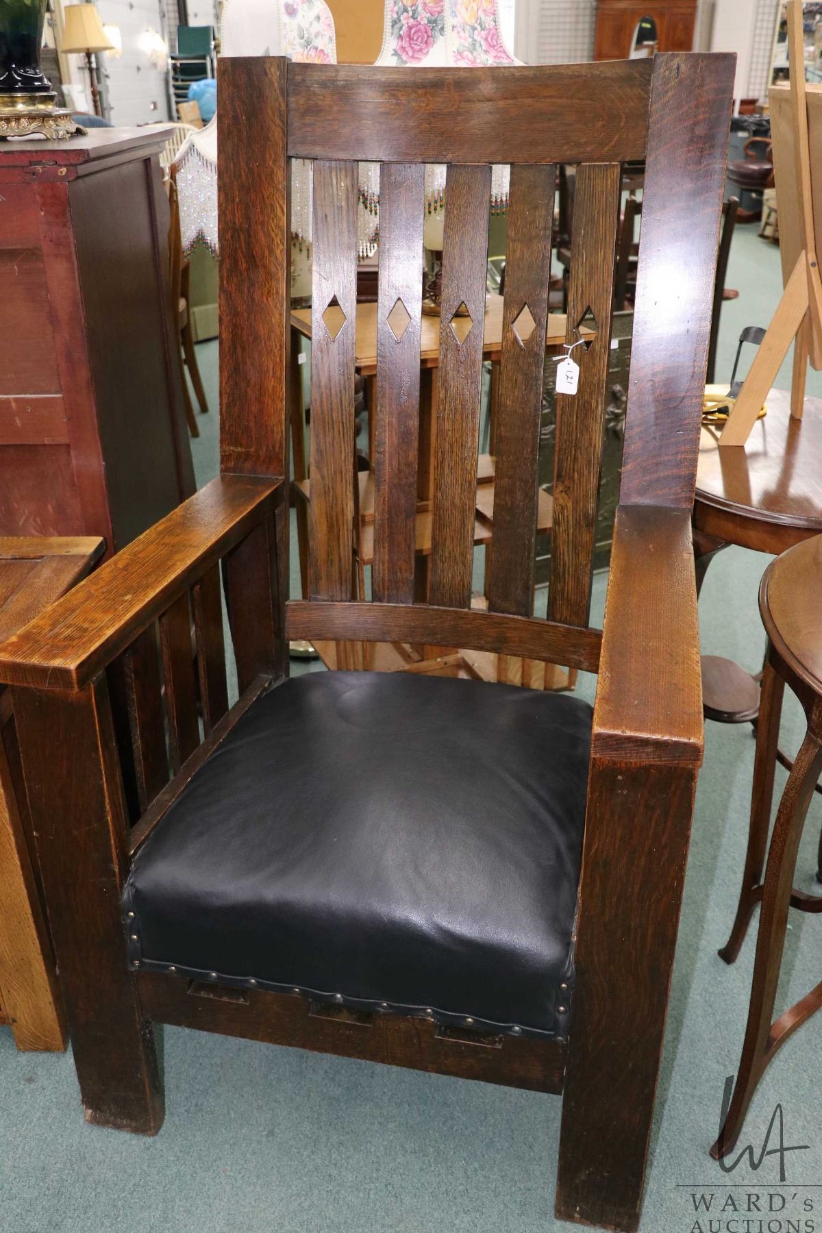 Lot 121 Antique Mission style quarter cut oak throne chair with upholstered seat and 50" tall back