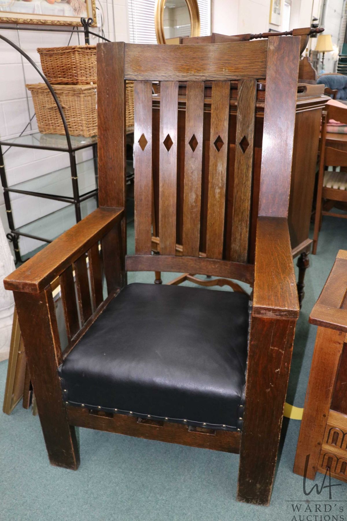 Lot 122 Antique Mission style quarter cut oak throne chair with upholstered seat and 50" tall back