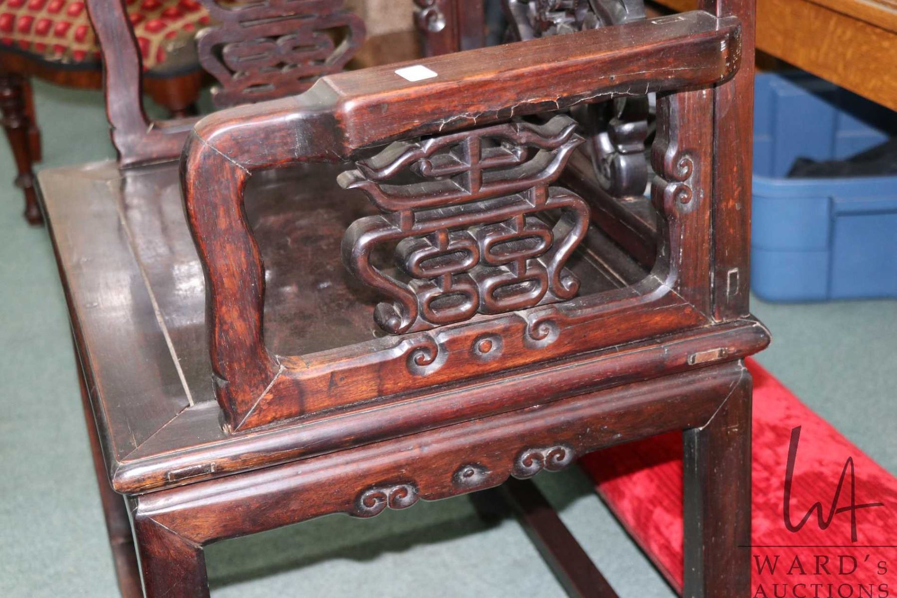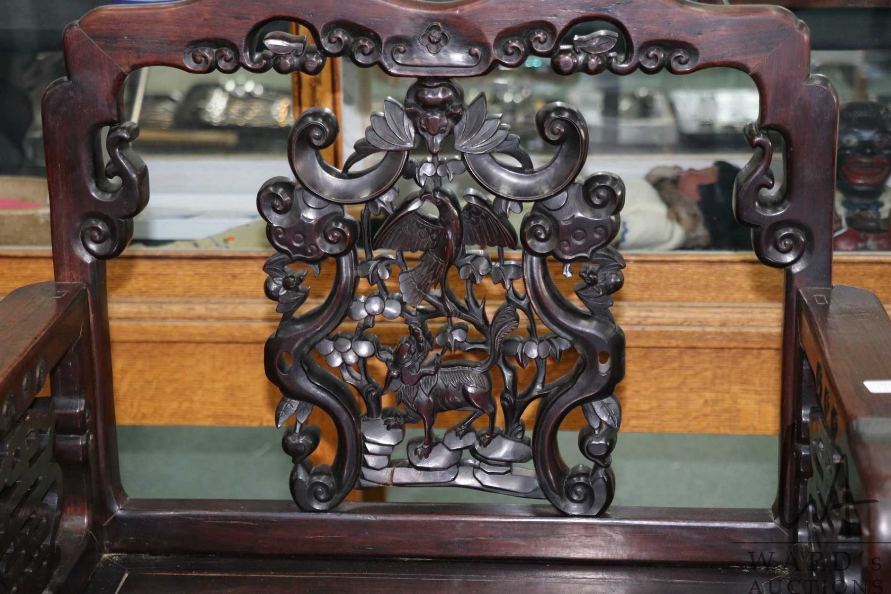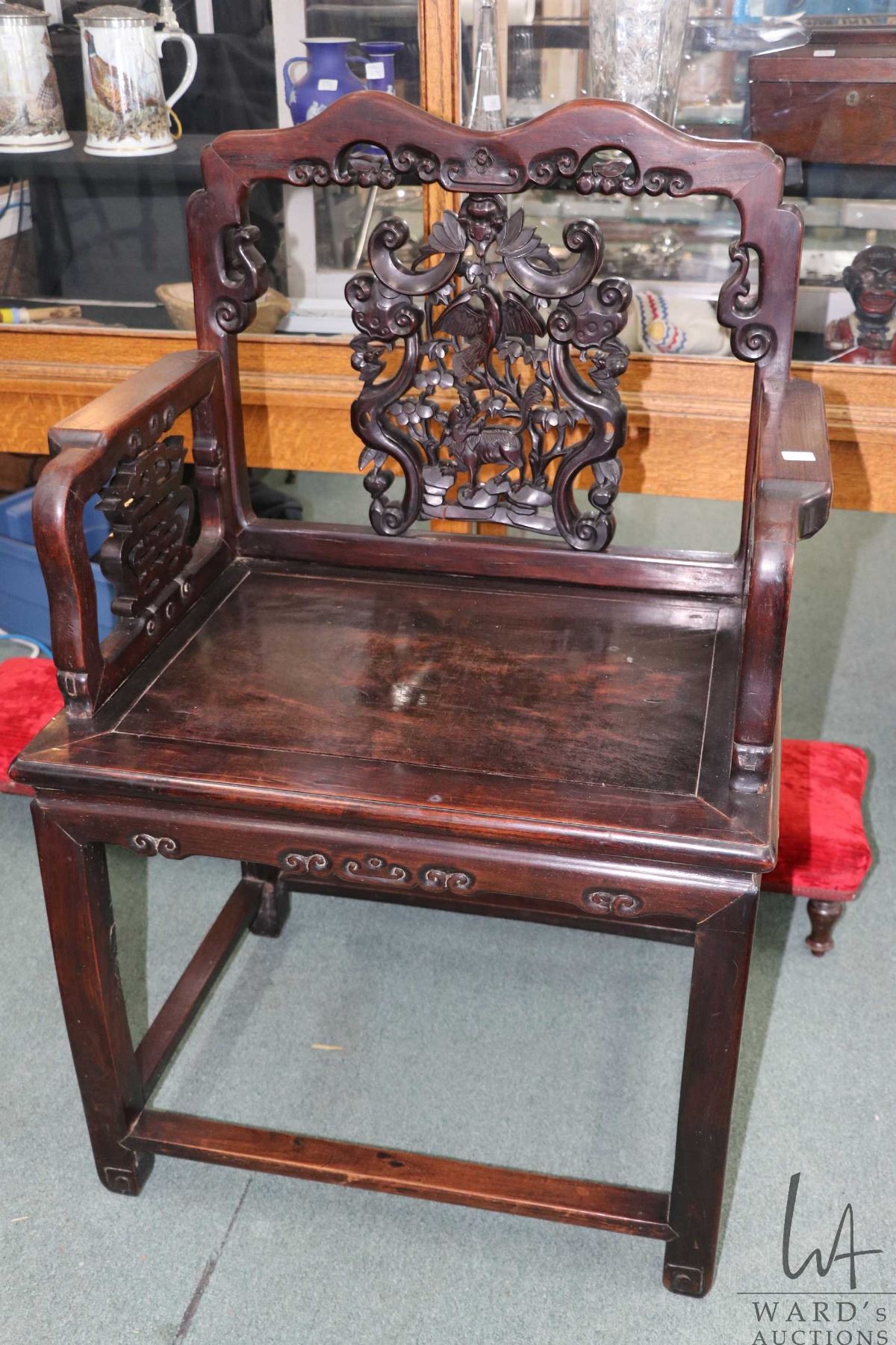 Lot 130 Antique Oriental rosewood chair with 21" H seat and delicately carved back panel