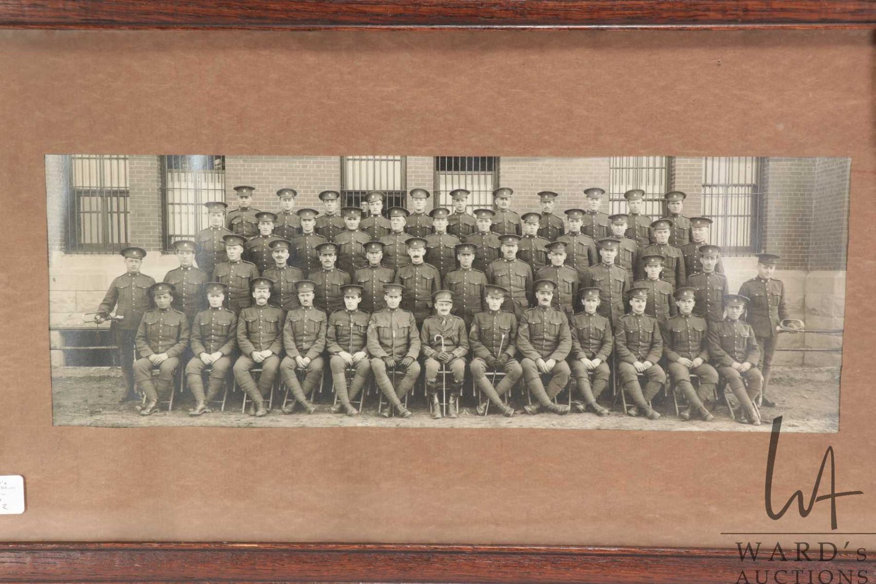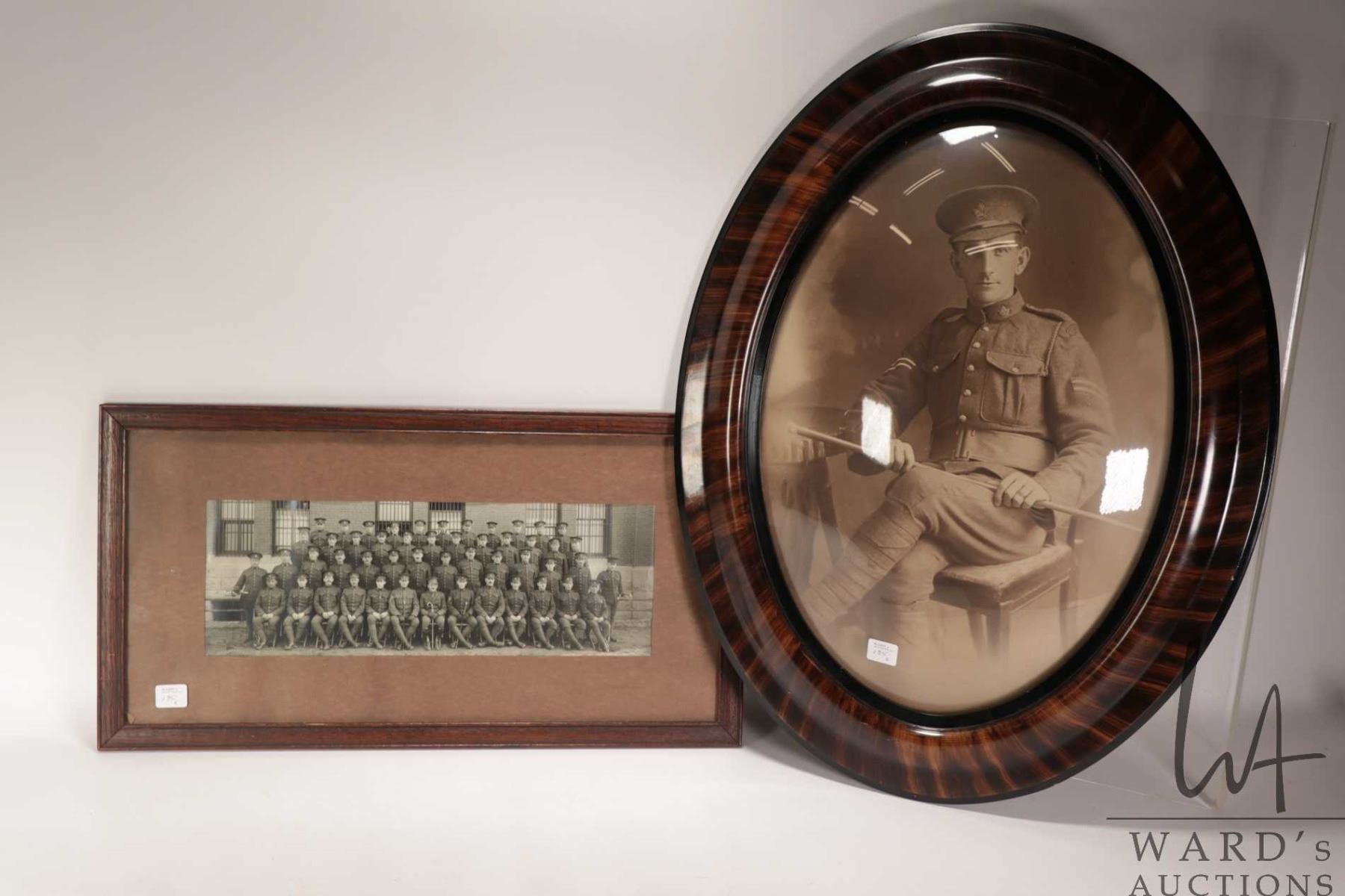 Two vintage framed photographs including oval convex featuring WWI soldier, overall framed dimension 25" X 19" and a photograph of the same soldier with his regiment, 11 1/2" X 21 1/2"