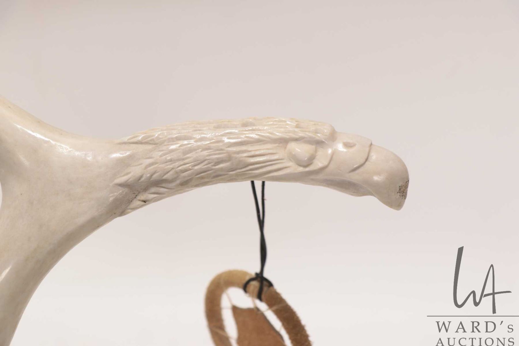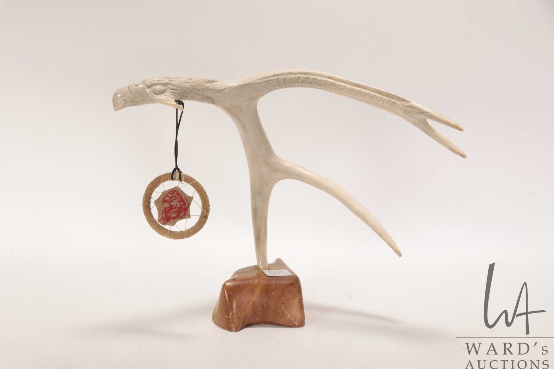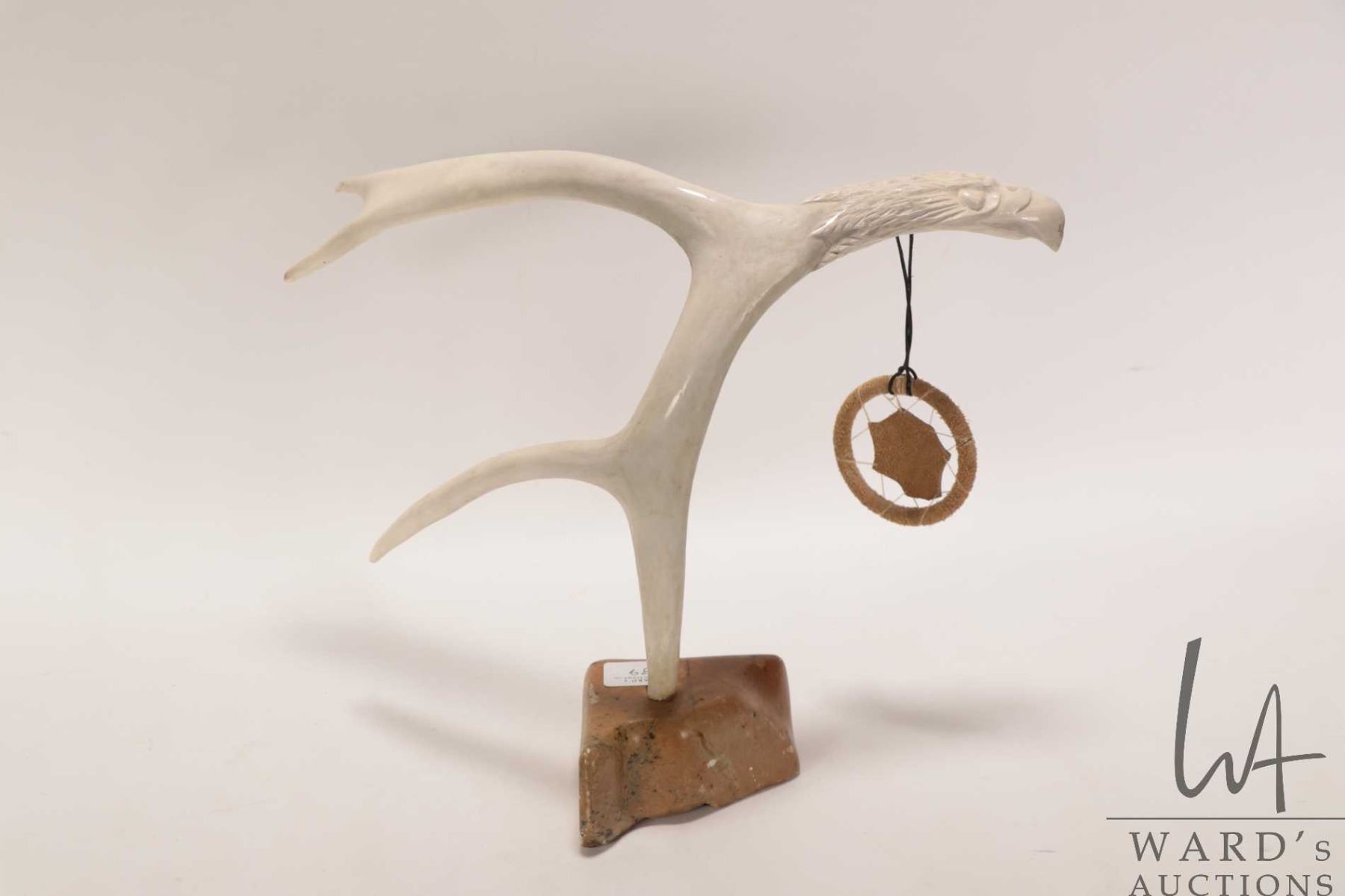 Lot 139 Indigenous hand carved antler eagle on stone base, signed by artist and 9 3/4" in height