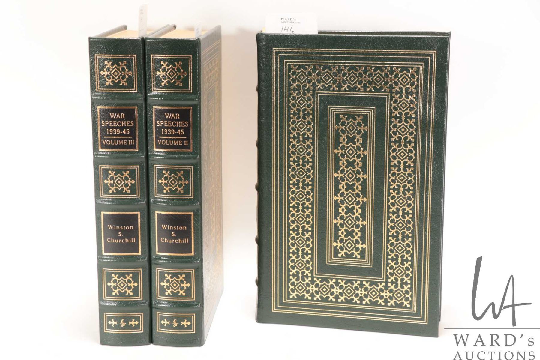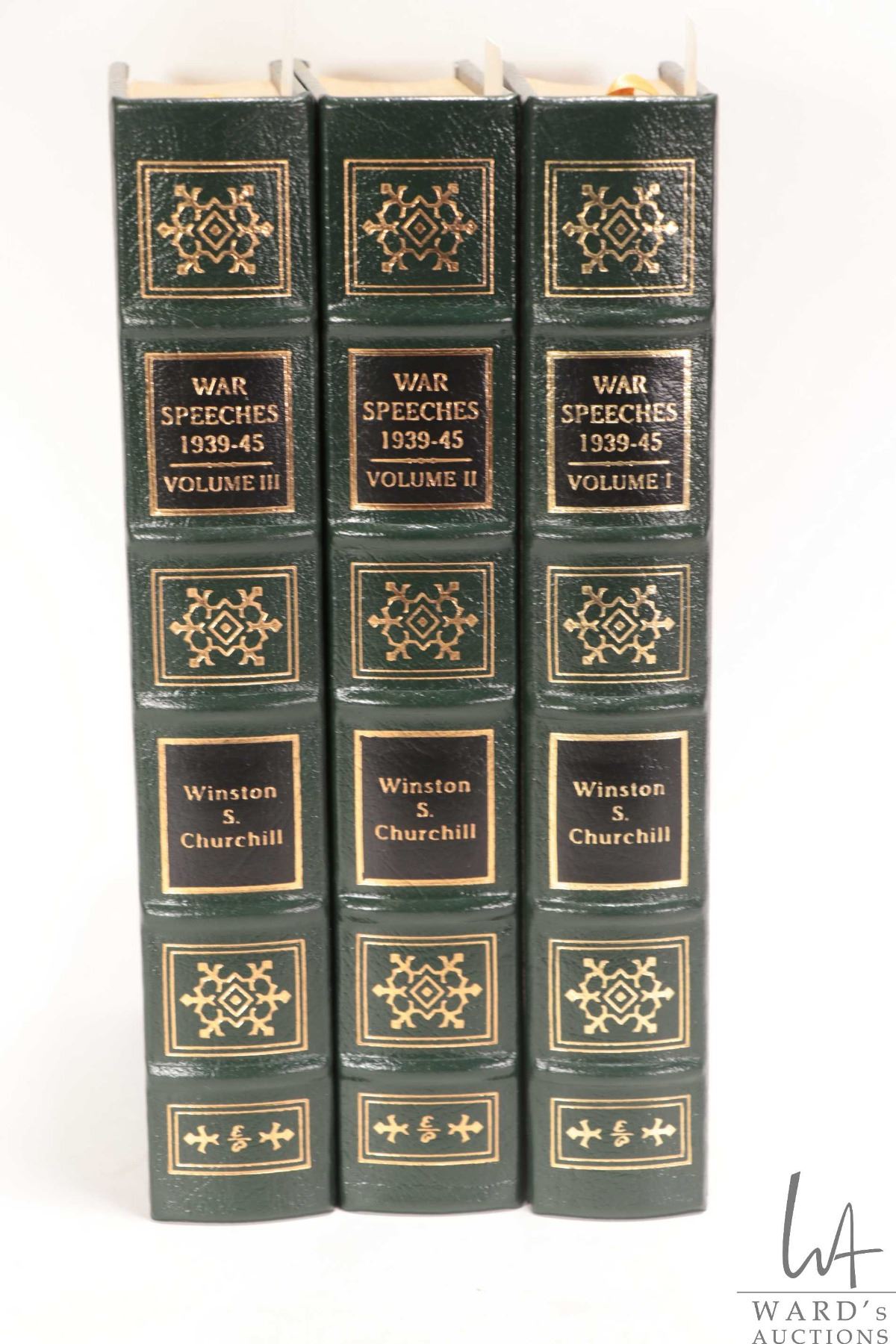 Three hardcover bound volumes including Vol I, Vol. II and Vol. IIL, titled "The War Speeches 1939-45" by William S. Churchill, complied by Charles Eade, each with embossed leather and gilt covers, silk end papers, gold tipped pages and silk books marks