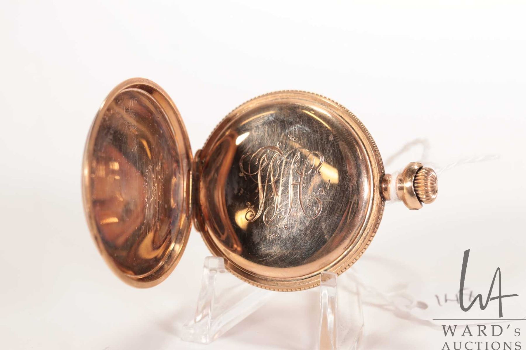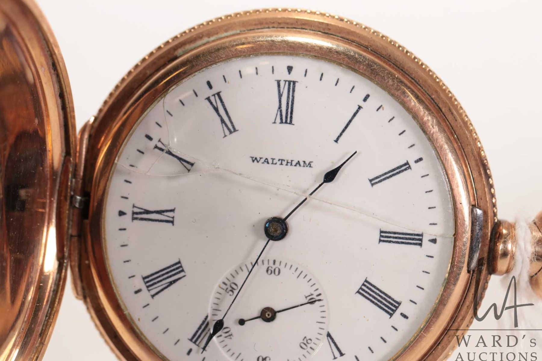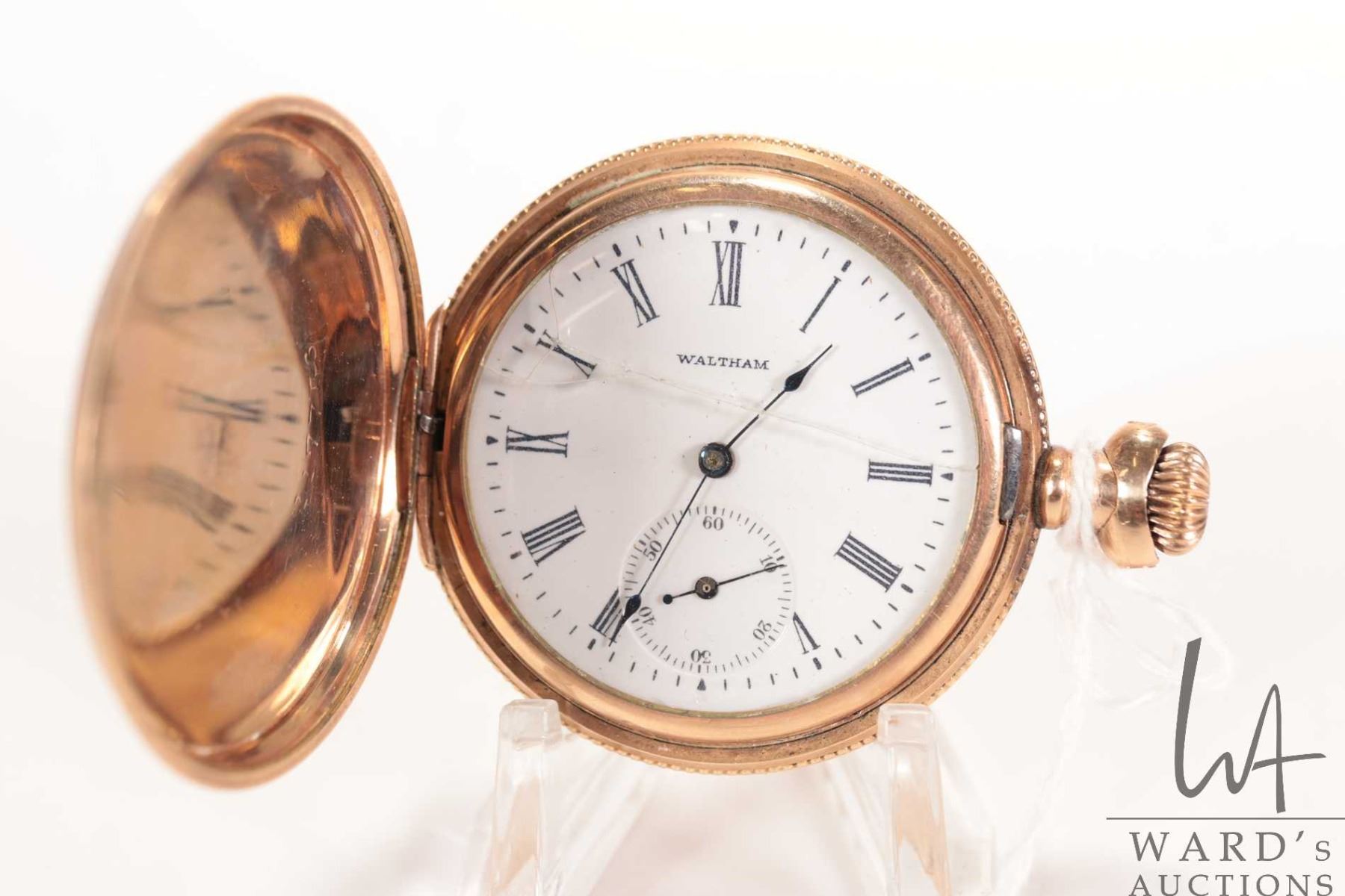 Lot 148 Waltham 7 jewel pocket watch model 1890 with white enamel double sunk dial, gold filled full hunter