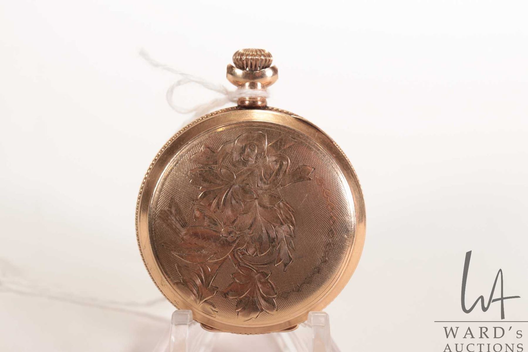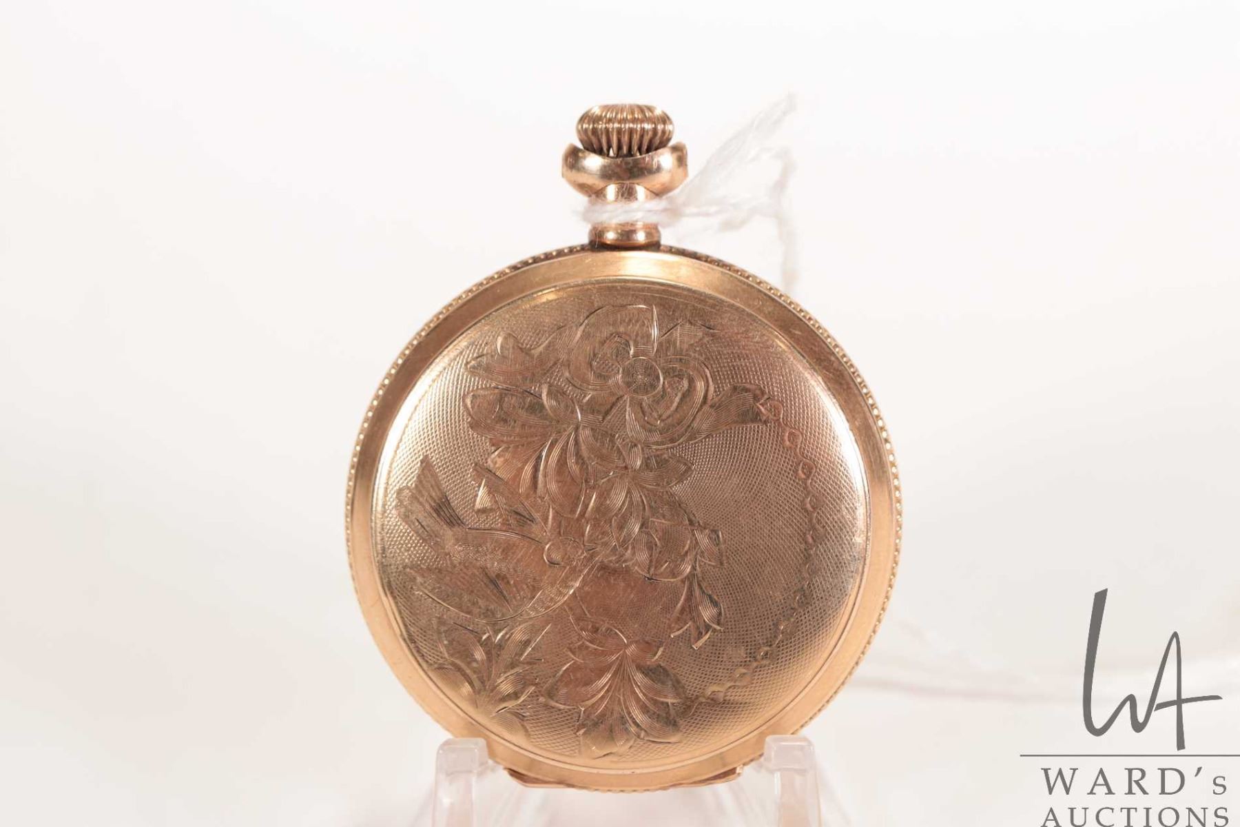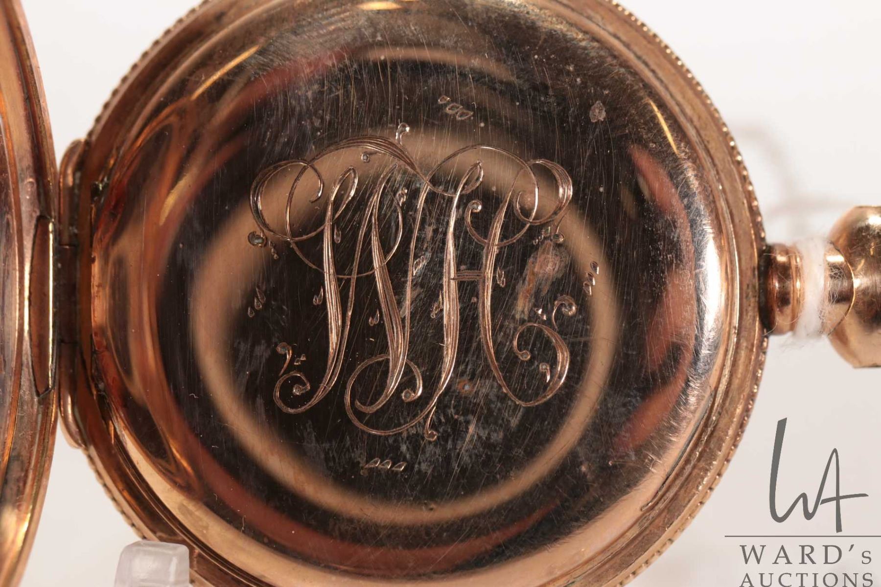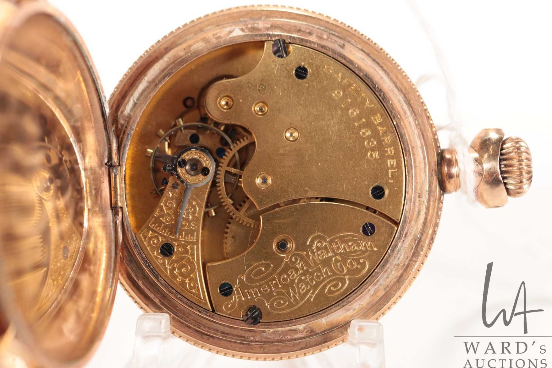 Lot 148 Waltham 7 jewel pocket watch model 1890 with white enamel double sunk dial, gold filled full hunter