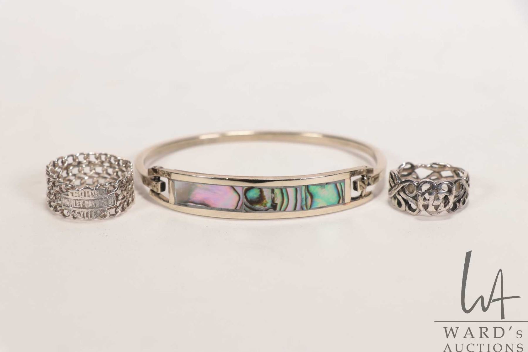 Two sterling silver Harley Davidson rings including size 7.75 and one size 6 plus a Mexican silver bangle