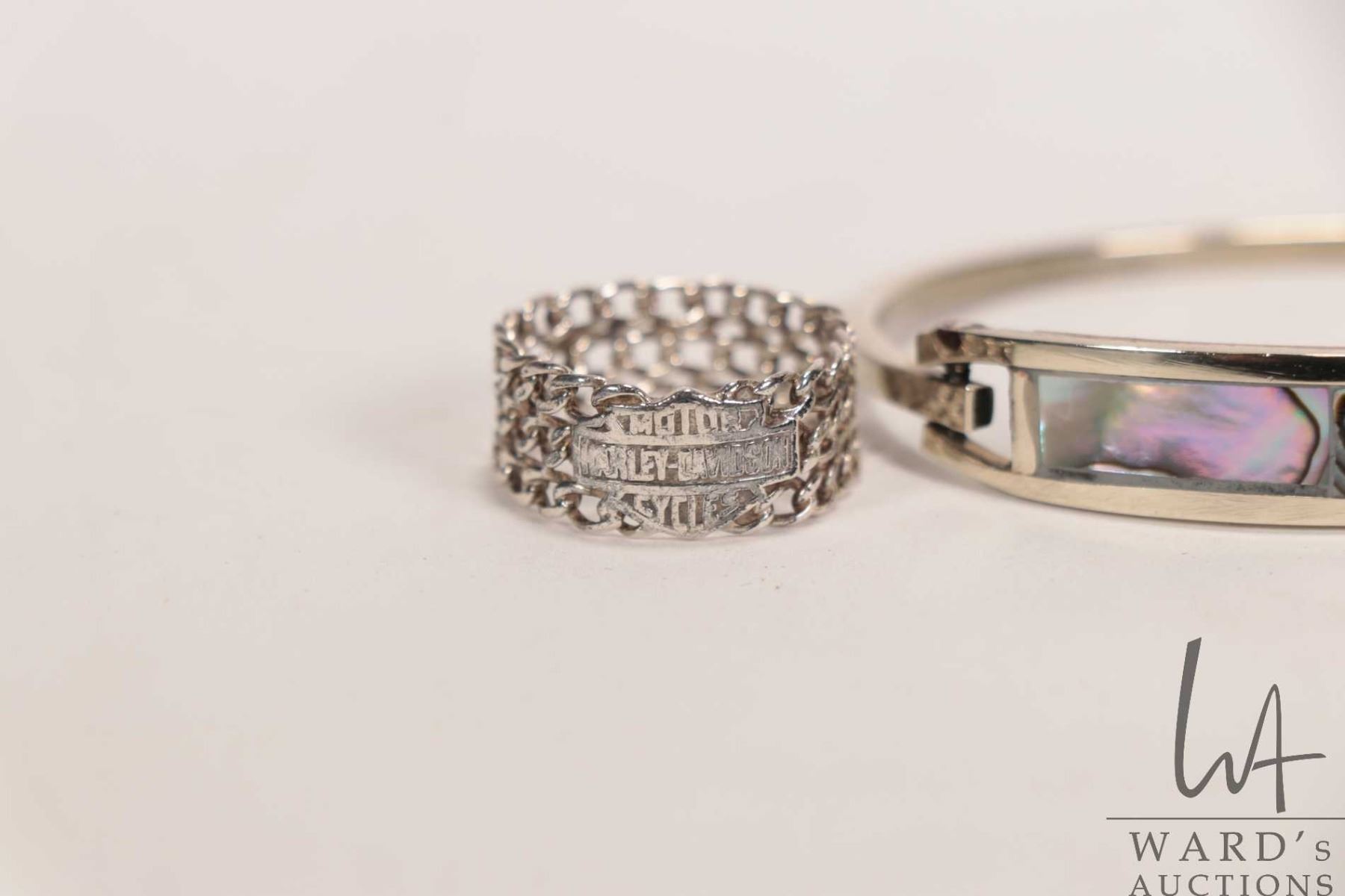 Lot 154 Two sterling silver Harley Davidson rings including size 7.75 and one size 6 plus a Mexican silver b