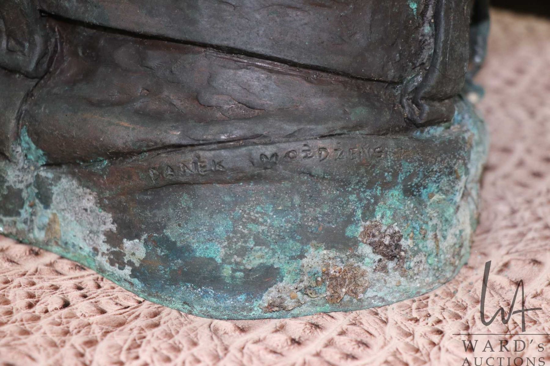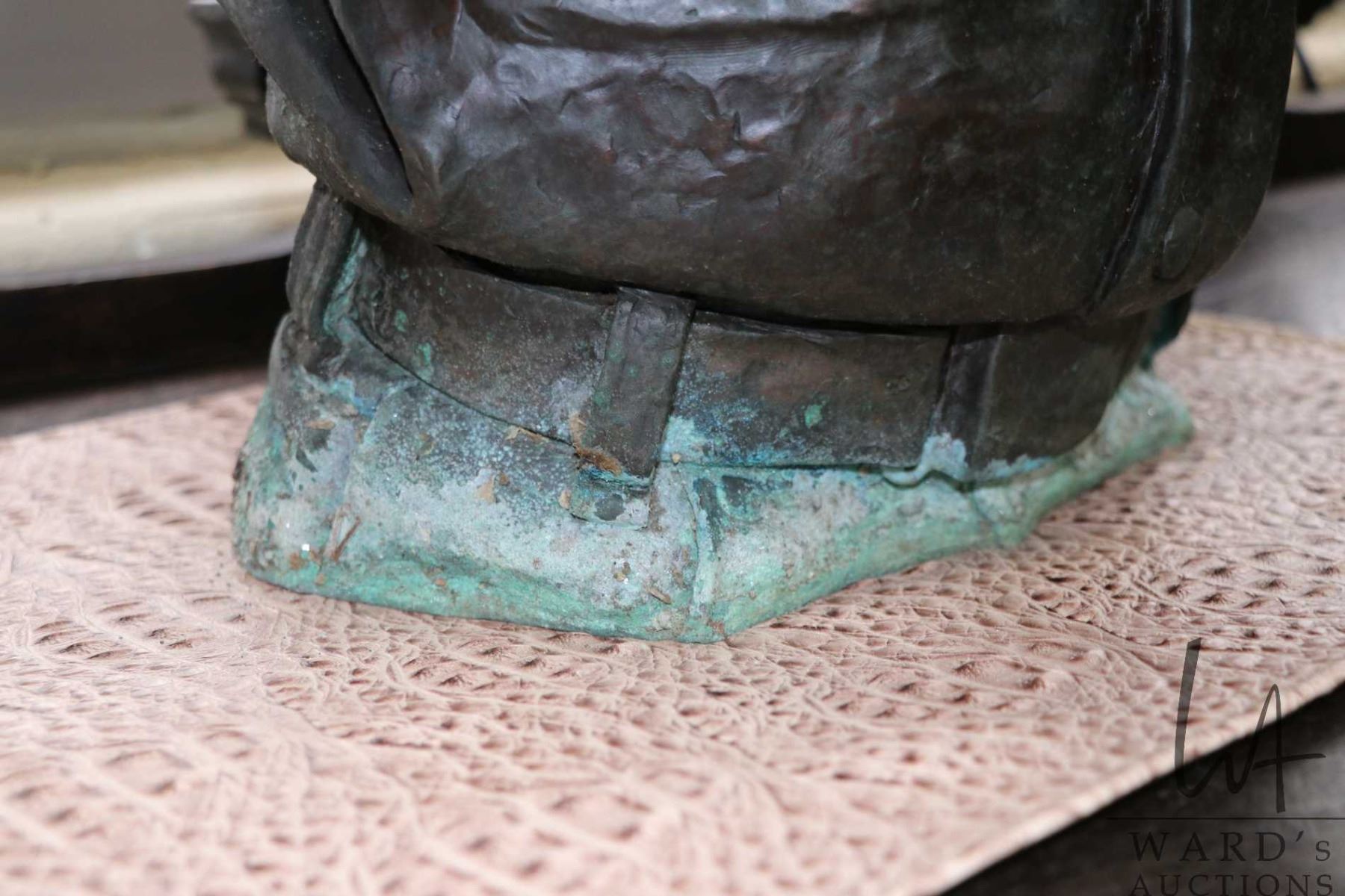 Bronze sculpture of a young boy with his toy train, possibly titled "Coleton Nickolas Landvand,Born June 1st. 1990", by artist Danek Mozdzenski 24" H, note: distressing at the bottom from being used in a garden