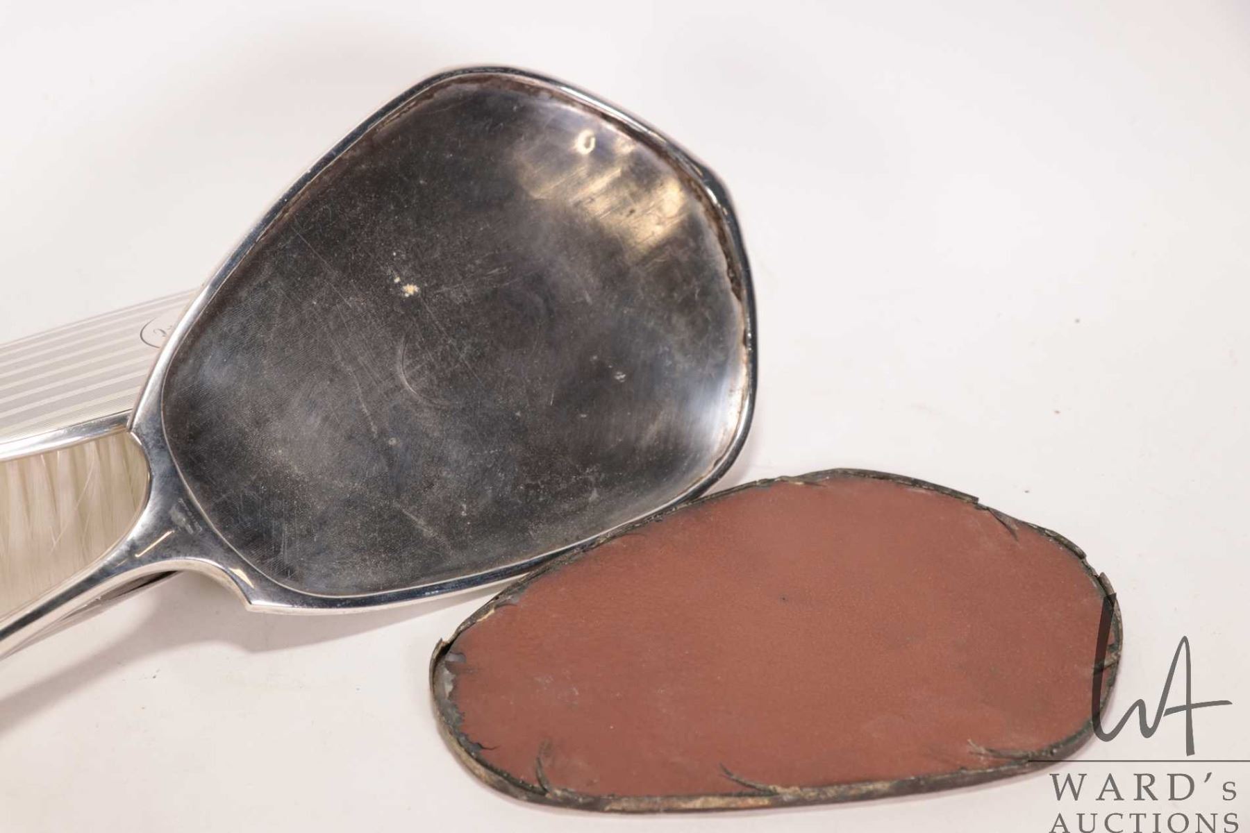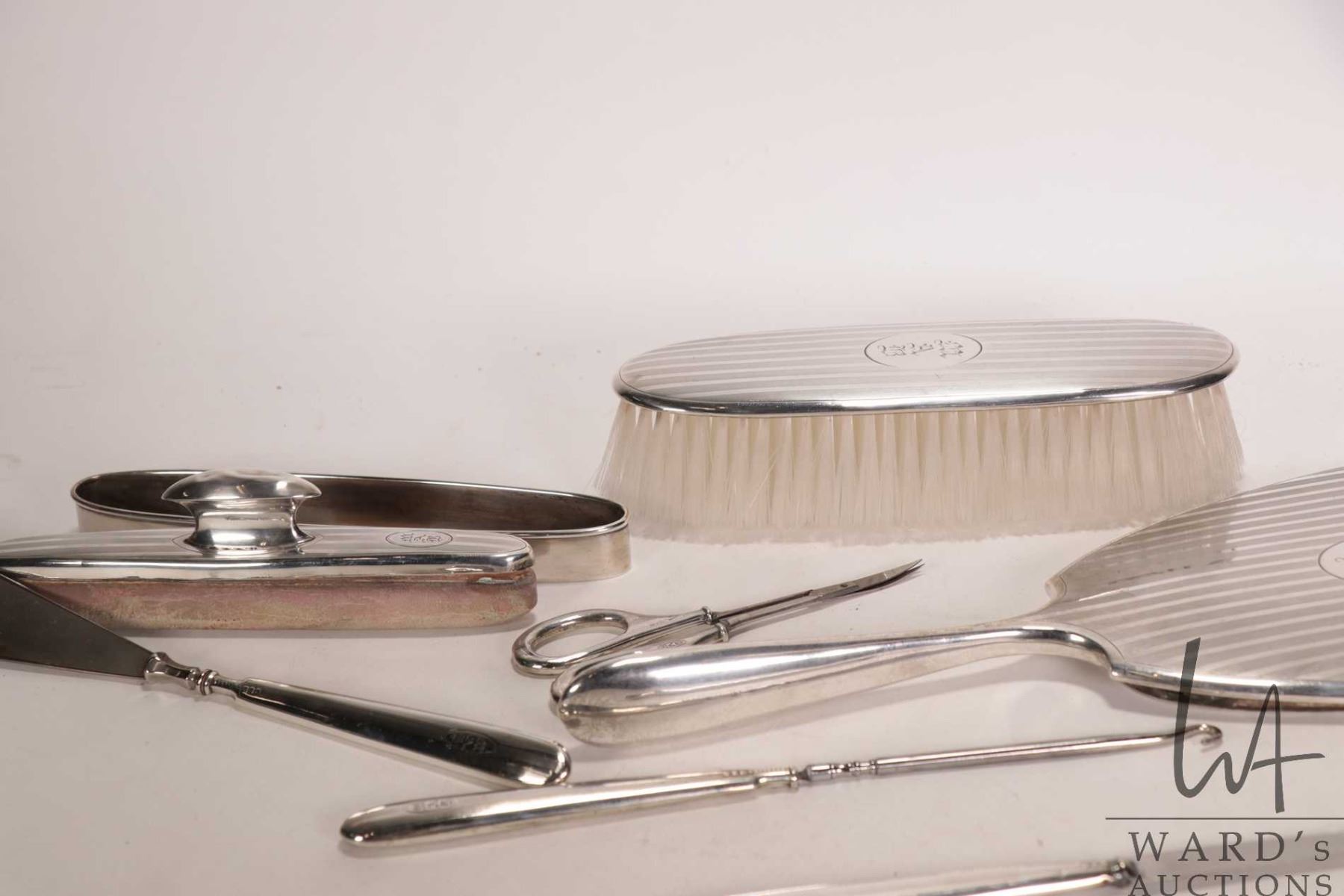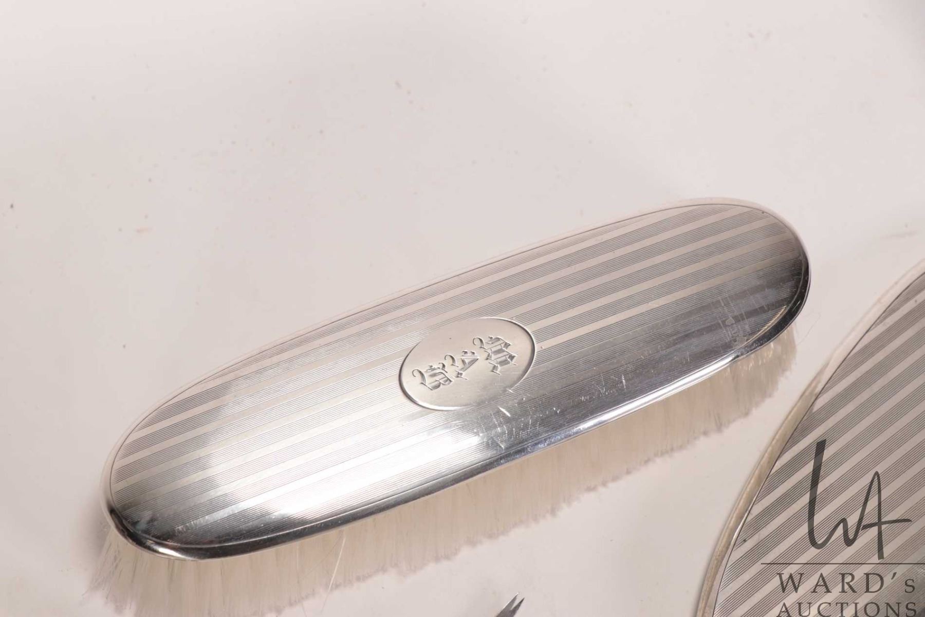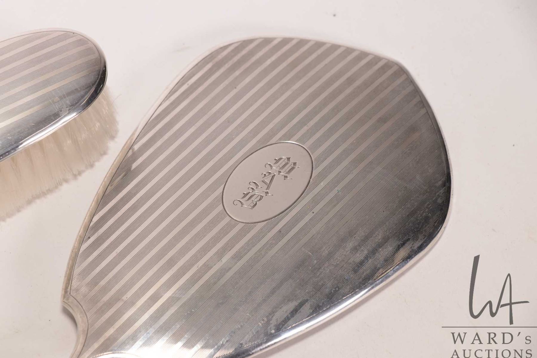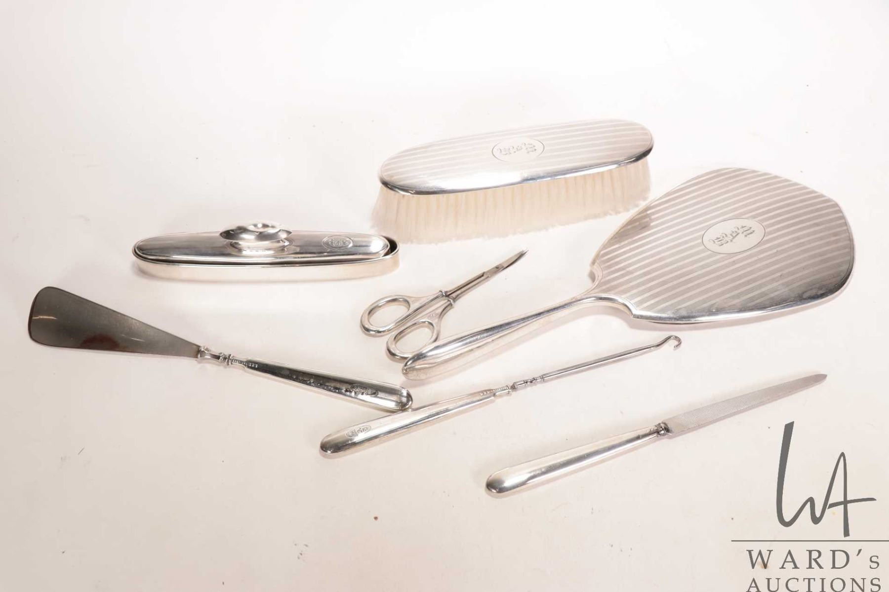 Lot 176 Sterling silver dresser set including brush, hand mirror, nail buffer and tray, shoe horn, button ho