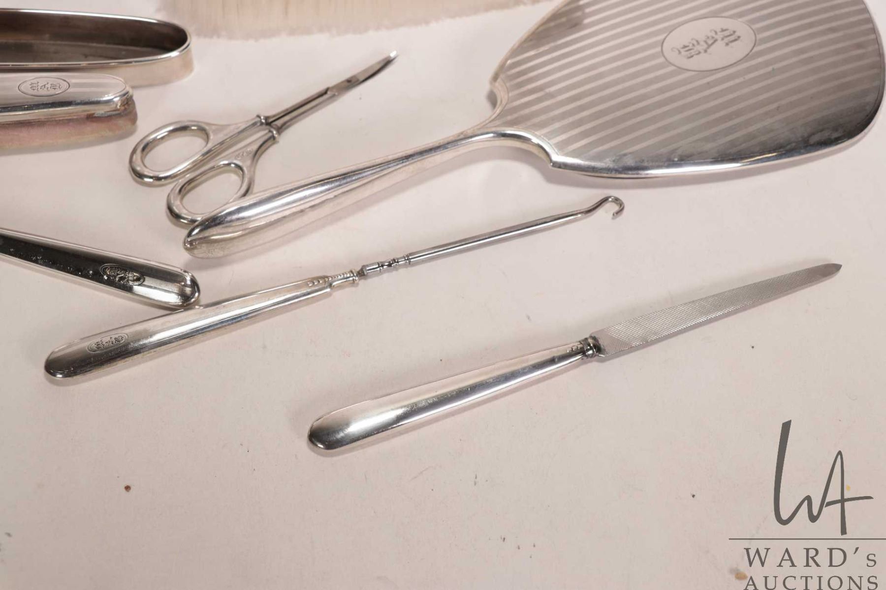 Sterling silver dresser set including brush, hand mirror, nail buffer and tray, shoe horn, button hook, nail file and scissors, note: mirror is loose in frame and button hook is loose