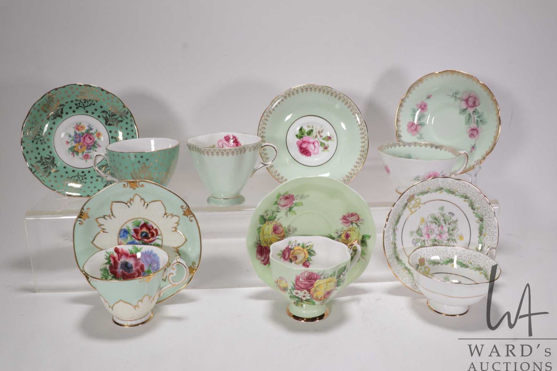 Six china teacups and saucers including Paragon, Queen Anne, Royal Grafton, Windsor and Colclough