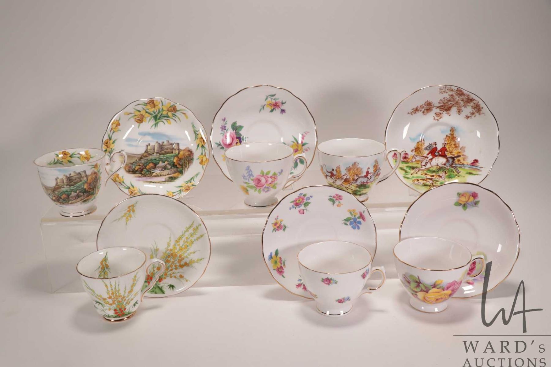 Six china teacups and saucers including Royal Kent, Roslyn, Royal Stafford, Royal Albert and Royal Vale