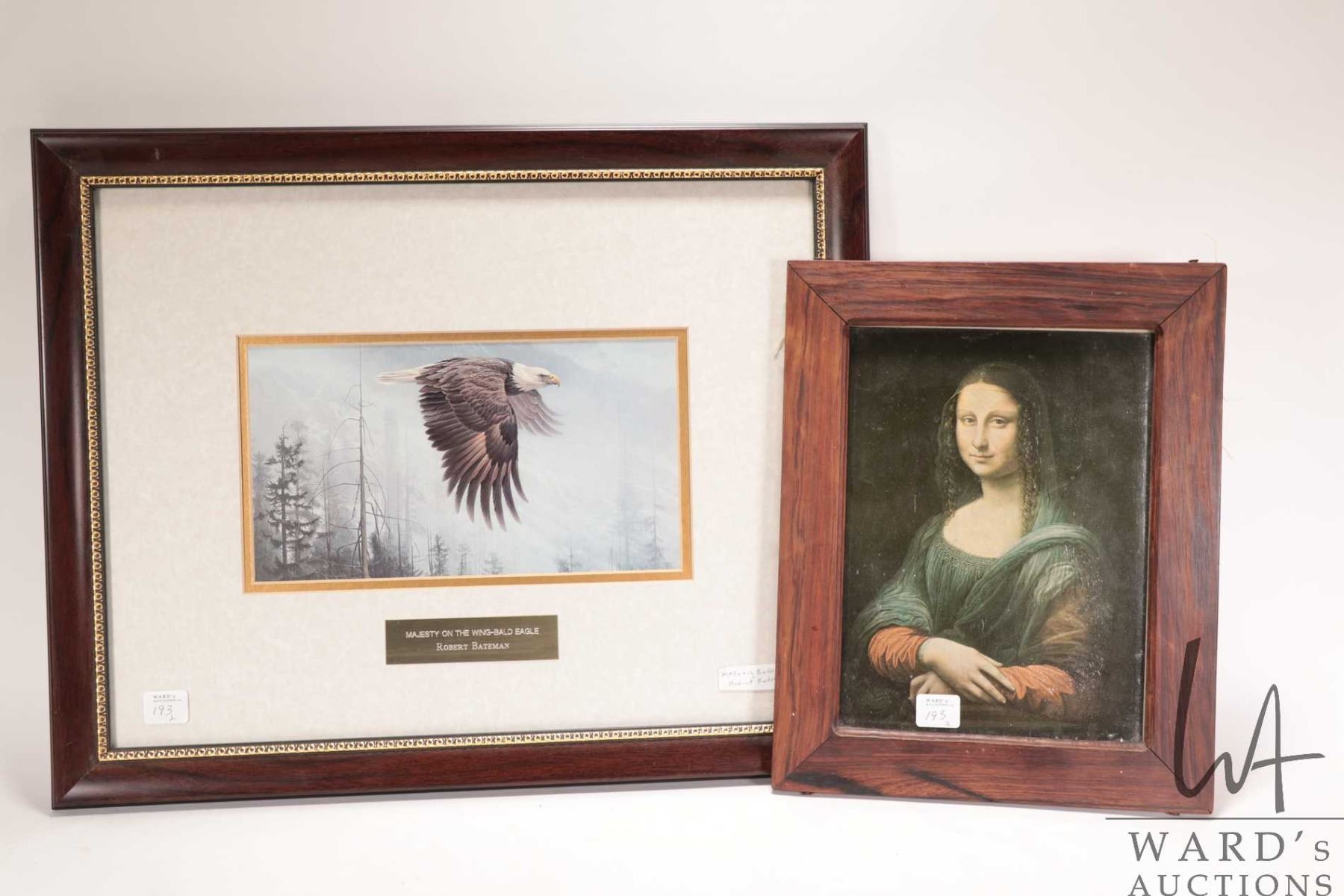 Two framed pictures including "Majesty on the Wing-Bald Eagle" by Robert Bateman, overall dimensions including frame 15 1/2" X 19" and a vintage oilette of the Mona Lisa, 12 1/2" X 10" overall including frame
