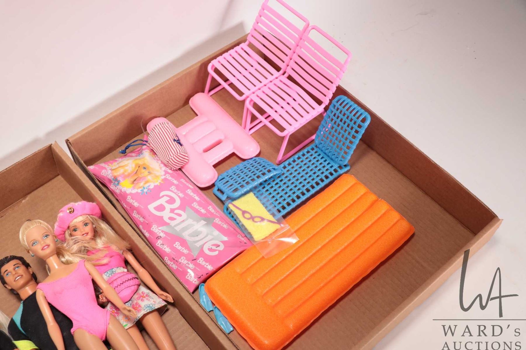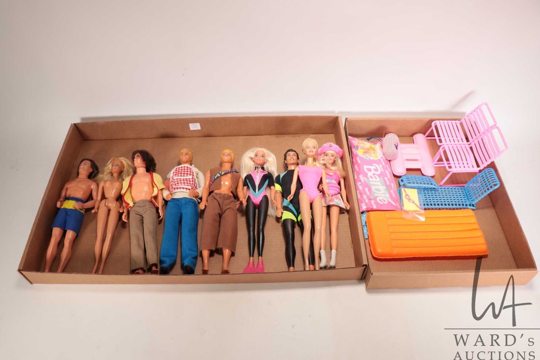 Selection of vintage Mattel Barbie dolls including Malibu Barbie and Ken, Seaworld Barbie and Ken and a selection of beach furniture. Note: all in played with condition