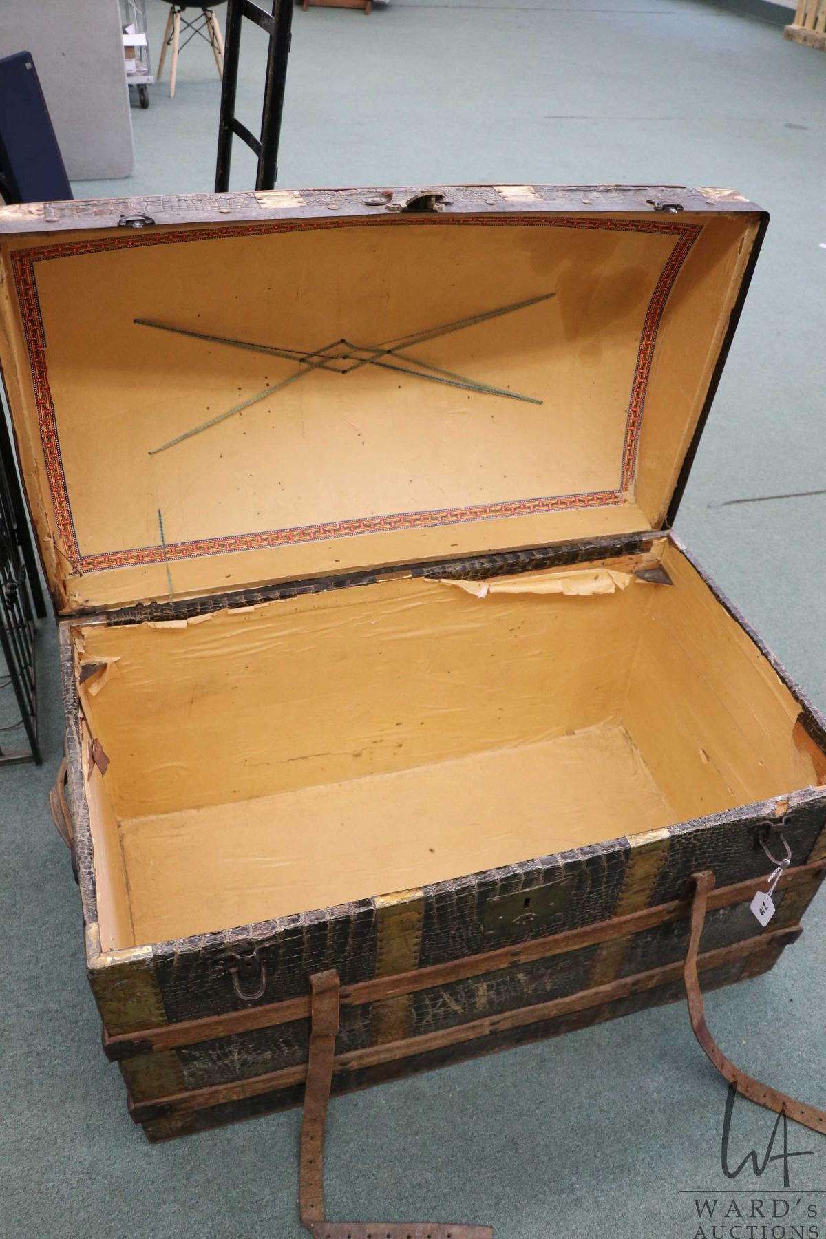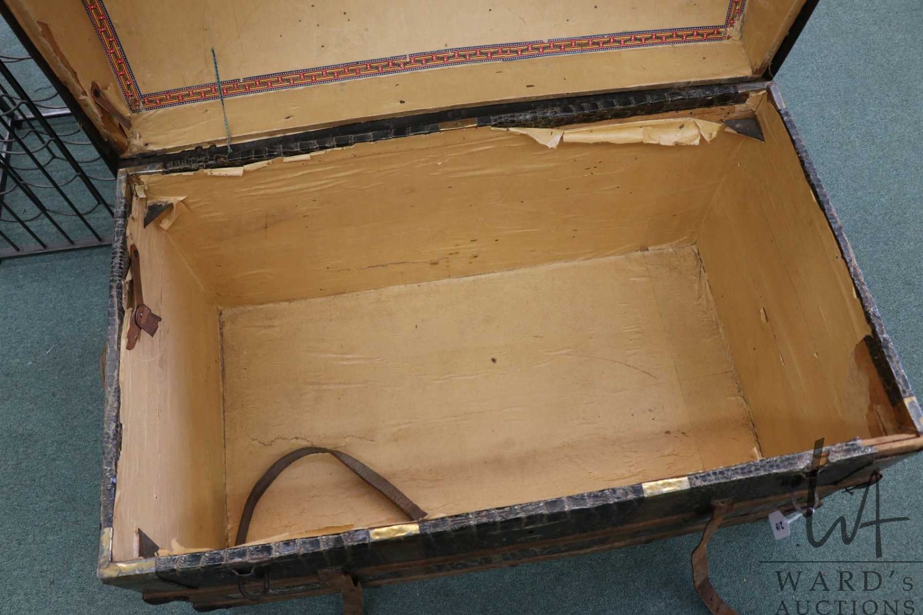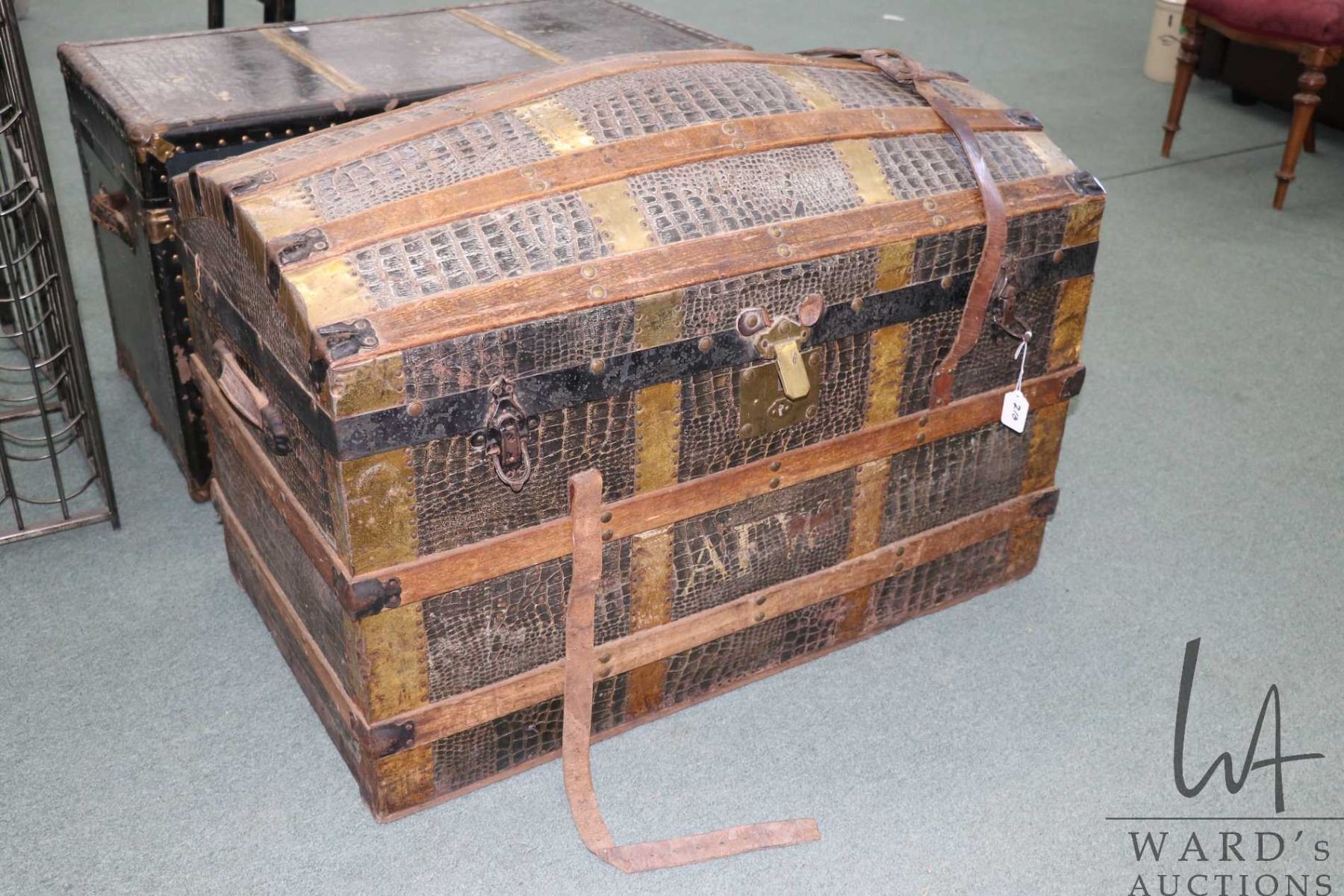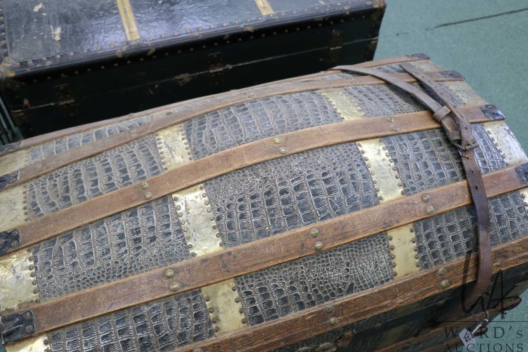 Lot 210 Antique oak and leather bound metal wrapped dome top steamer trunk, note: part of leather strap is i