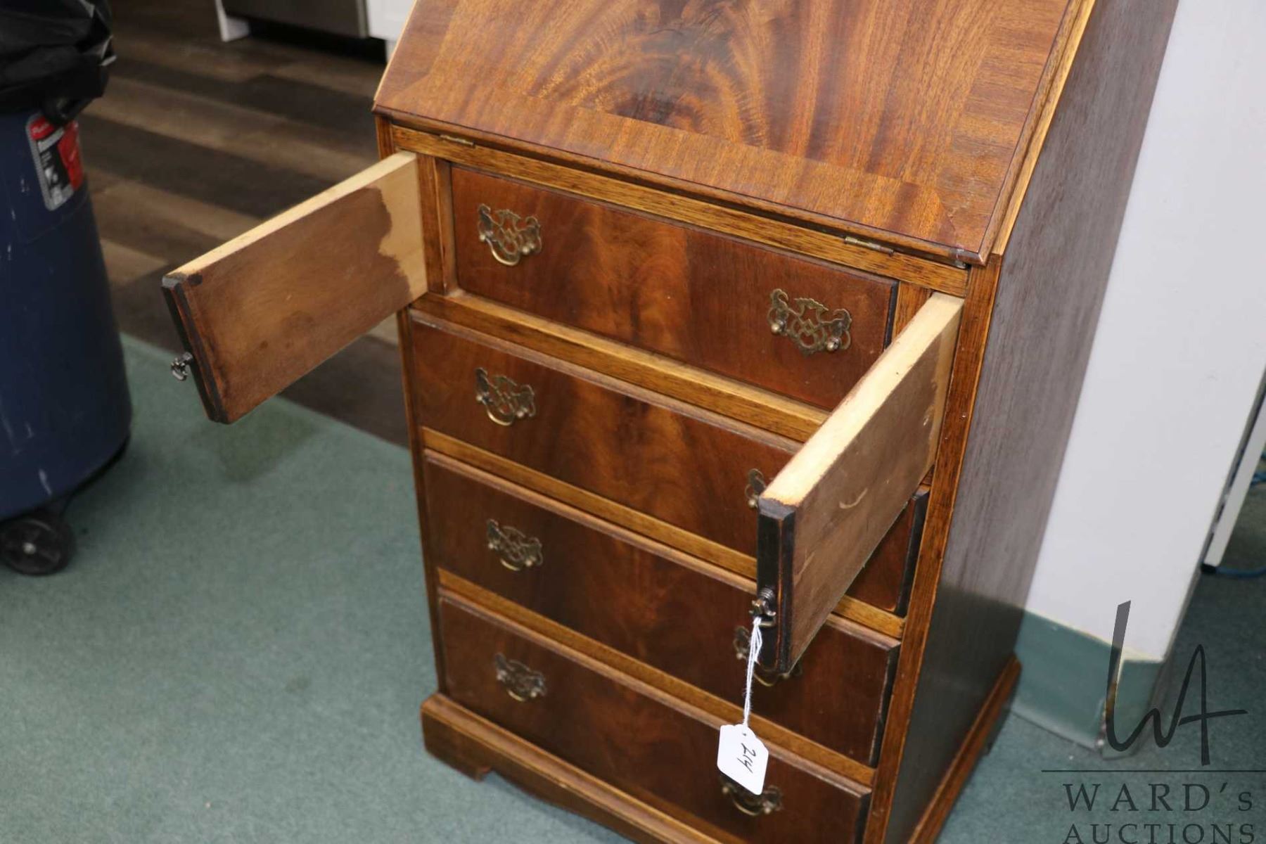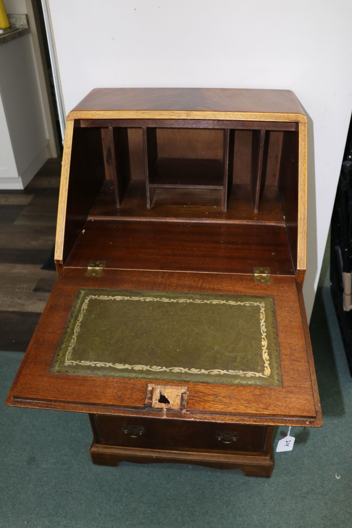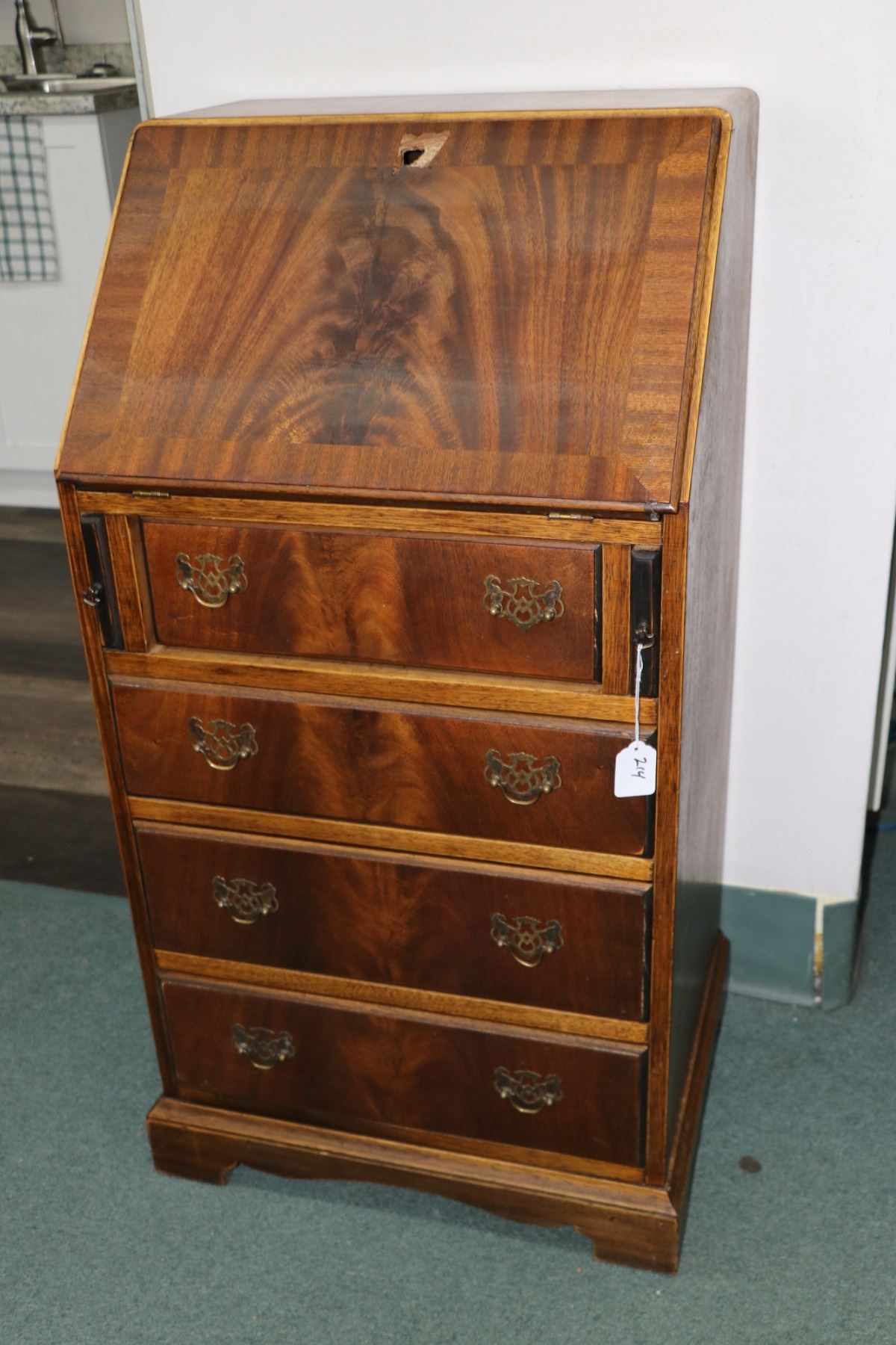 Lot 214 Small matched grain mahogany, fall front bureau with four drawers and fitted interior. Note: fall fr