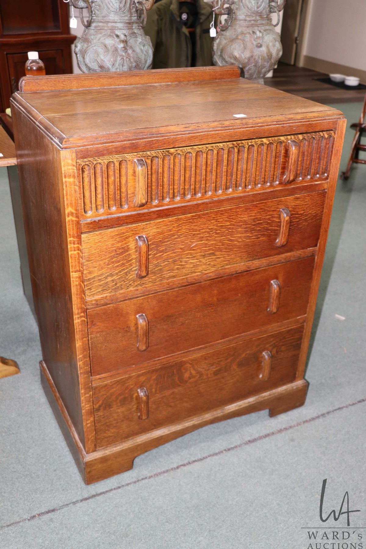 Lot 220 Antique English quarter cut oak, four drawer Tudor style lowboy with small backboard, 37"H X 27" X 1