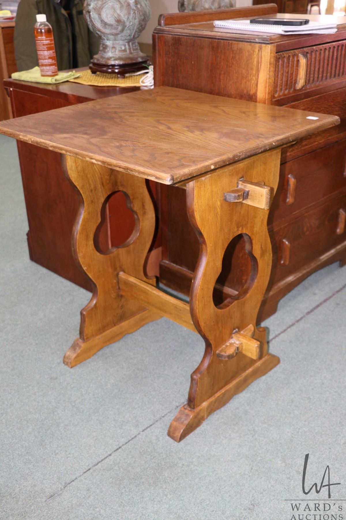 Lot 221 Antique occasional table with fretwork pedestals and stretchers held in place by wedges, note: one w