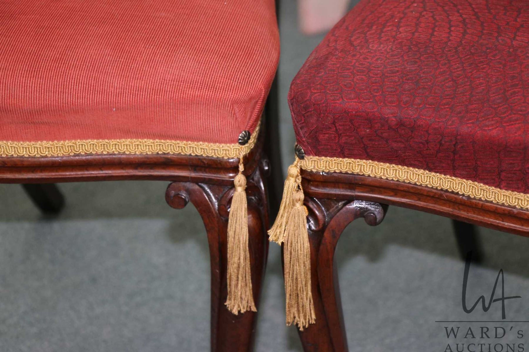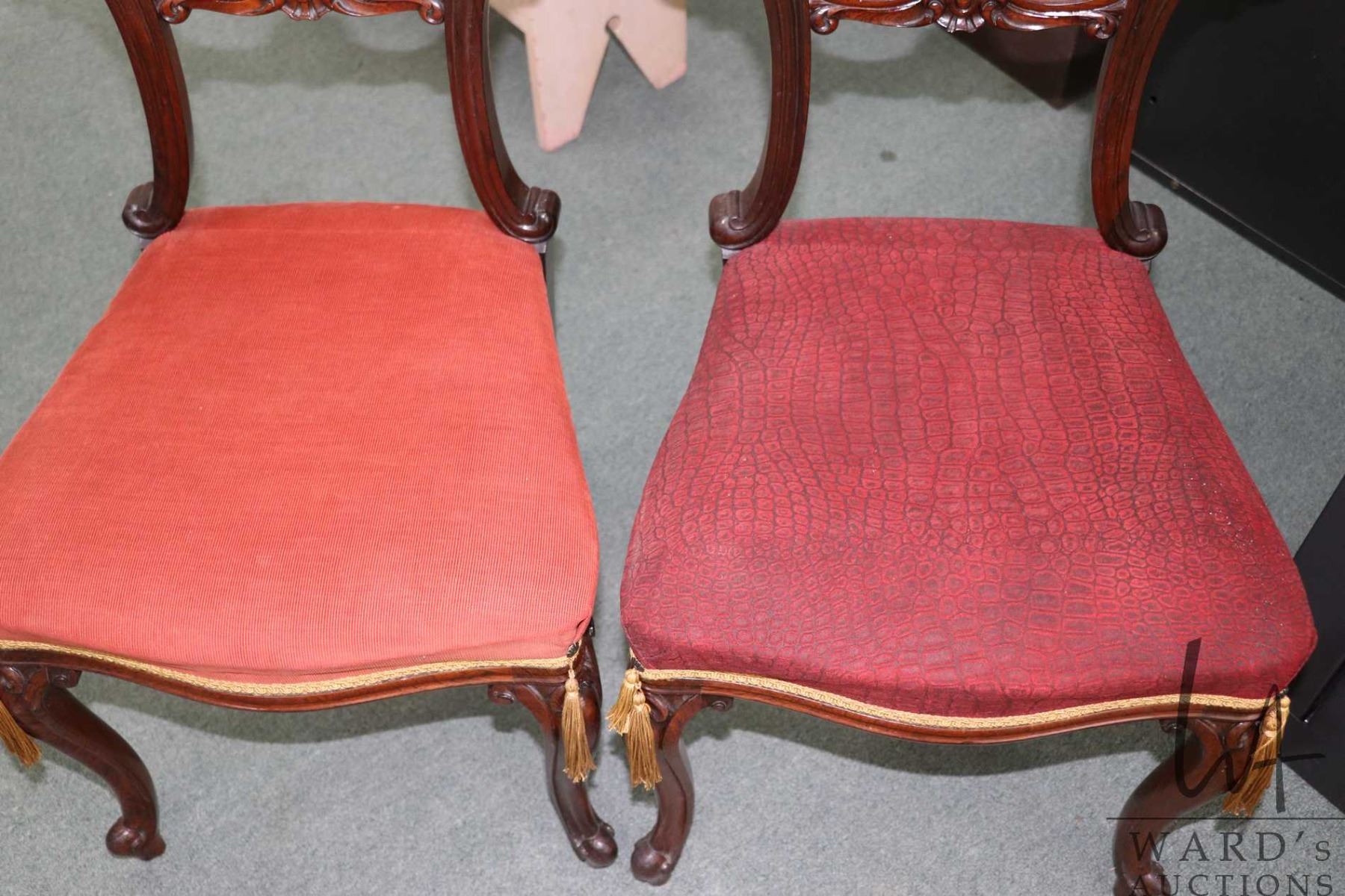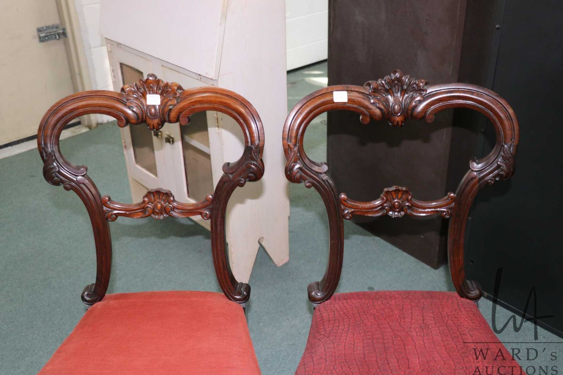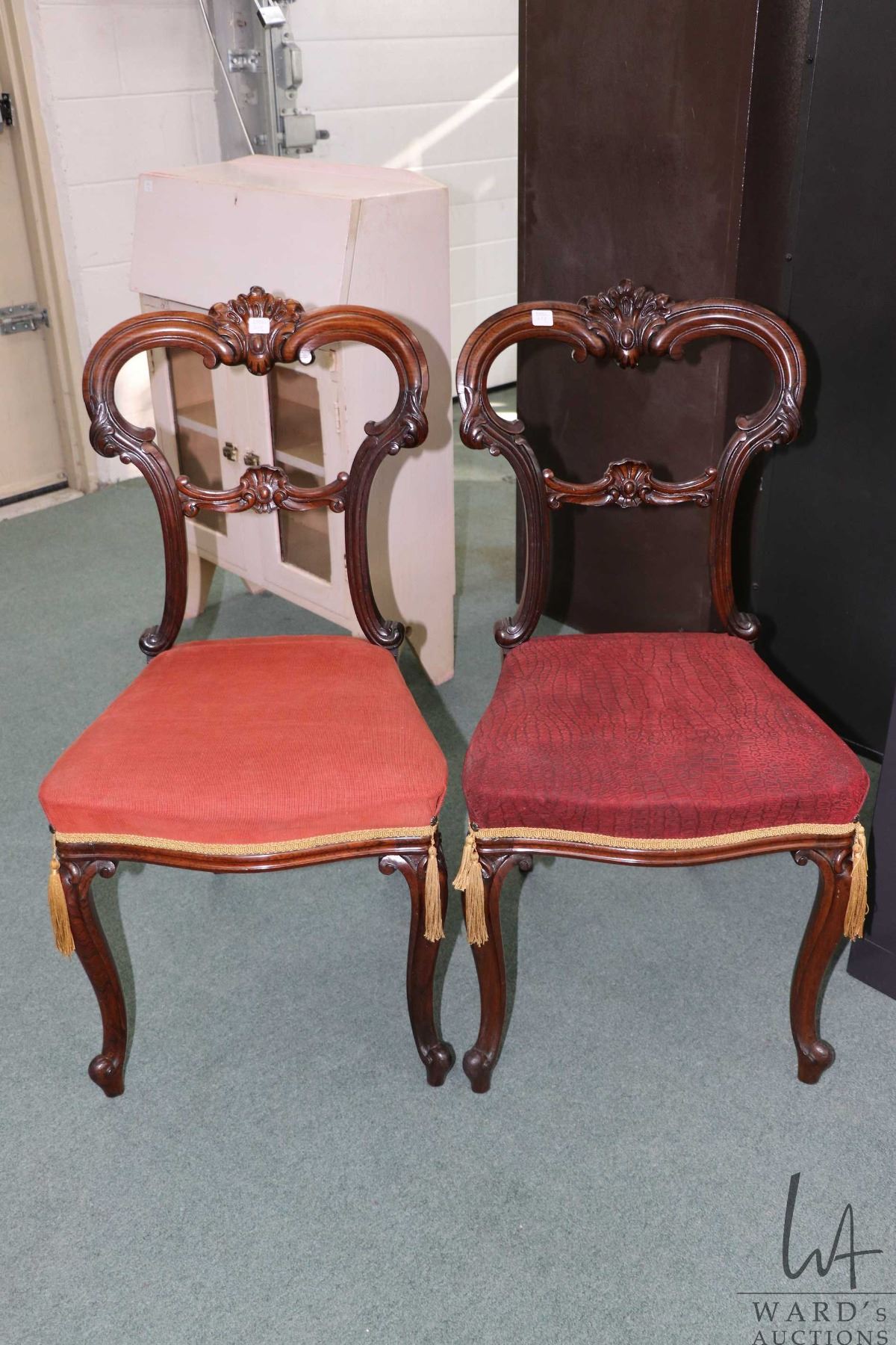 Lot 228 Pair of matching antique Victorian balloon back chairs with scroll supports, carved backs and uphols