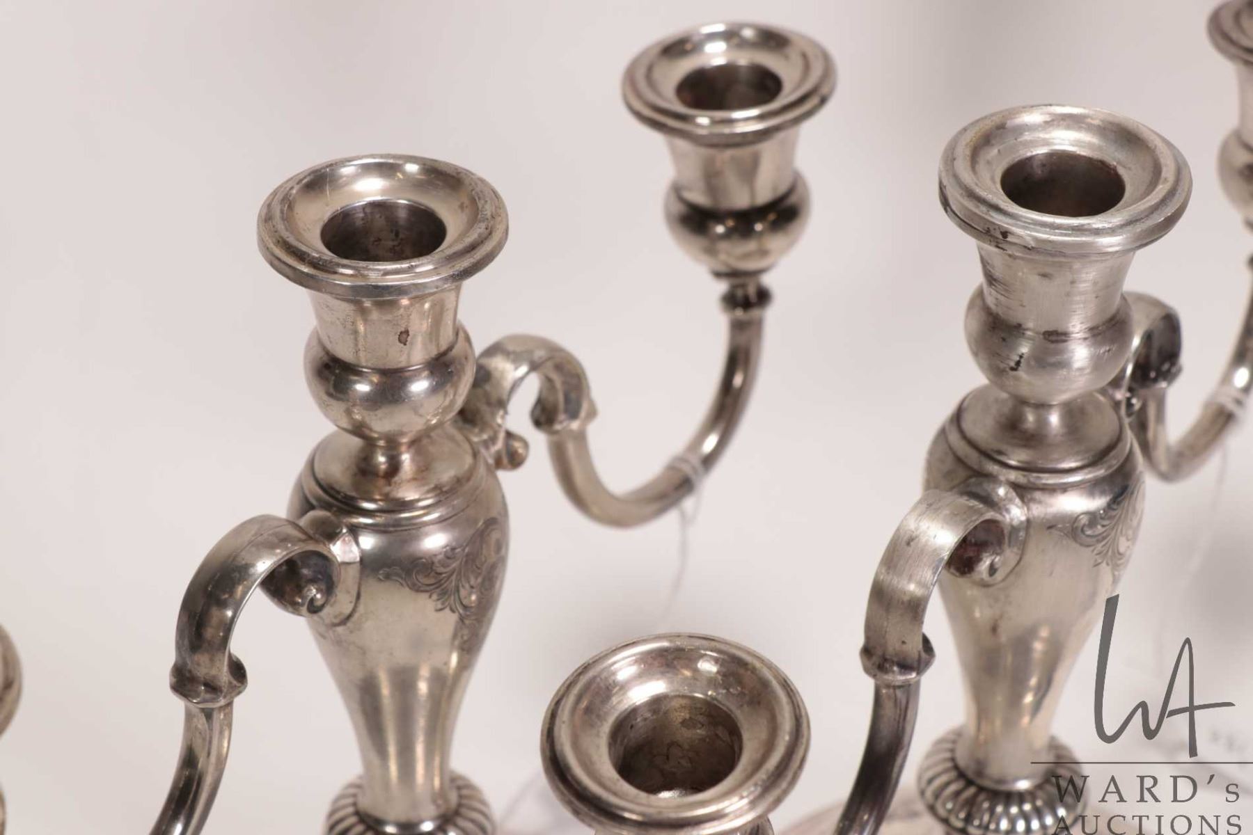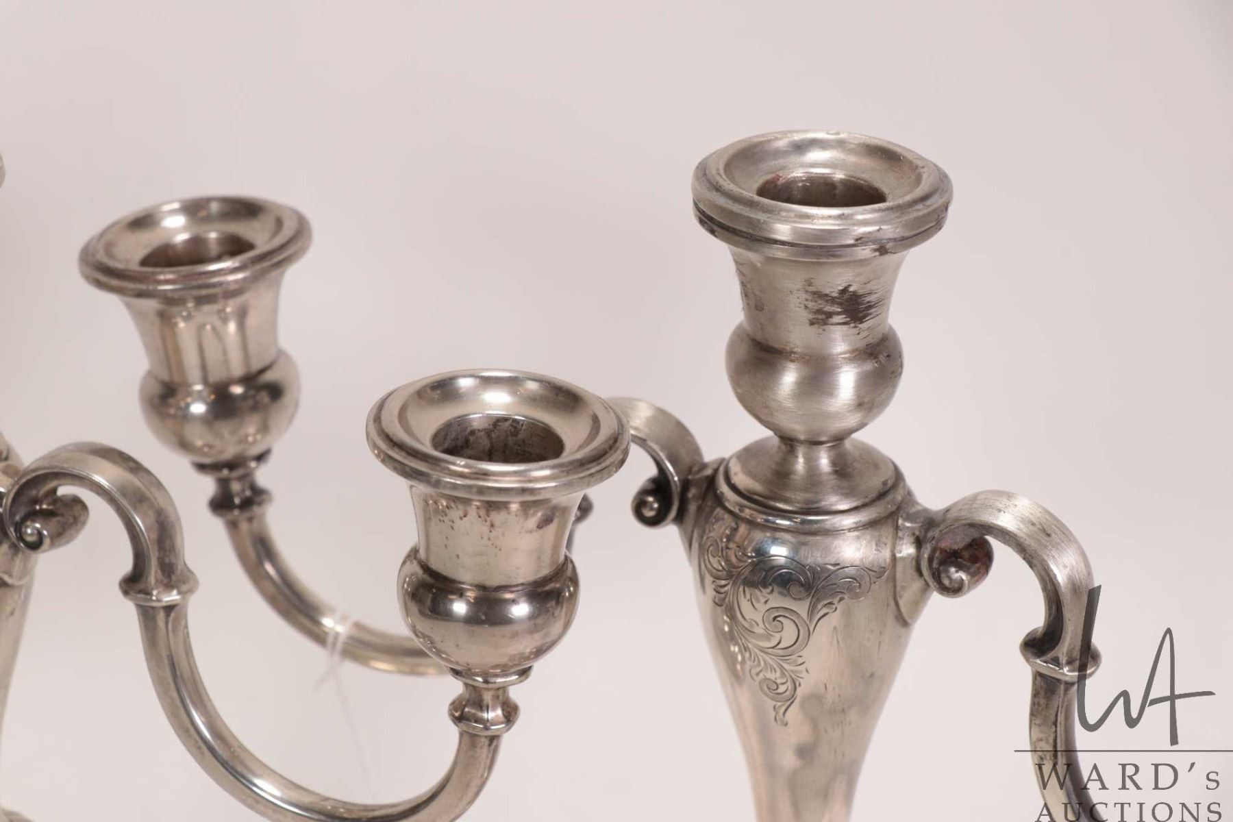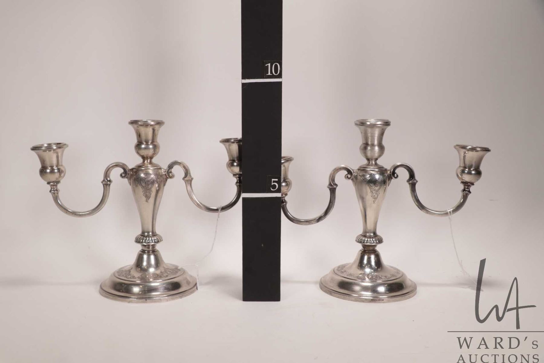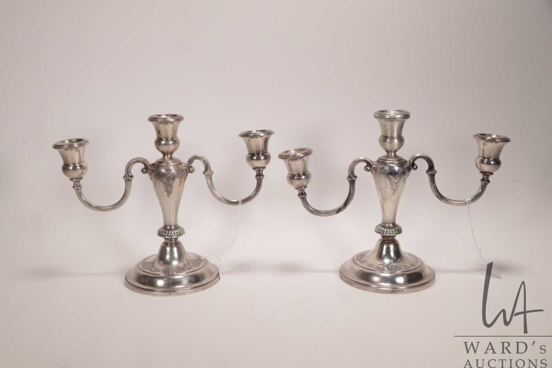 Lot 231 A pair of Birks Sterling weighted two branch candelabras, note damage to finish and arms