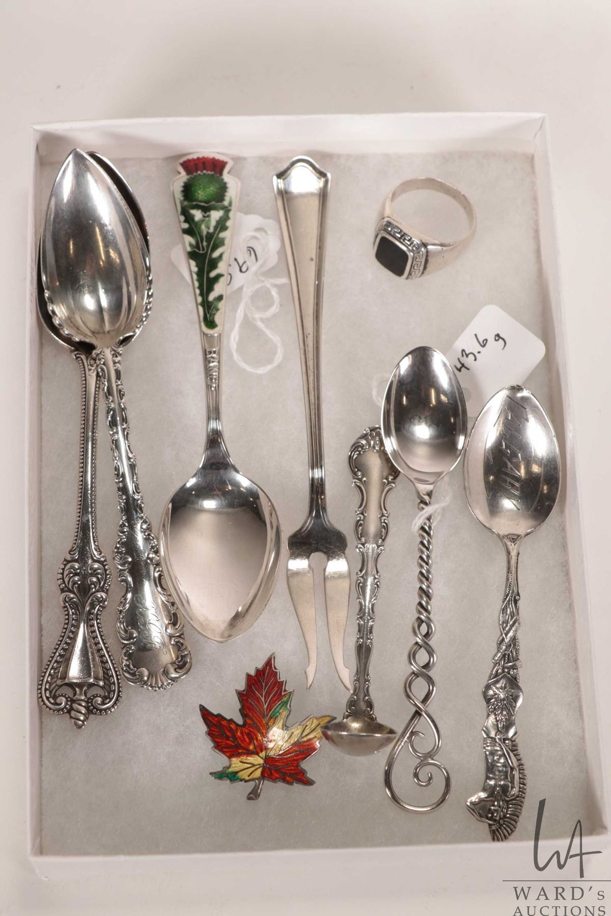 Selection of sterling silver including collector spoons, tea spoons, small ladle, pickle fork, gents size 12 ring and an enameled leaf pin