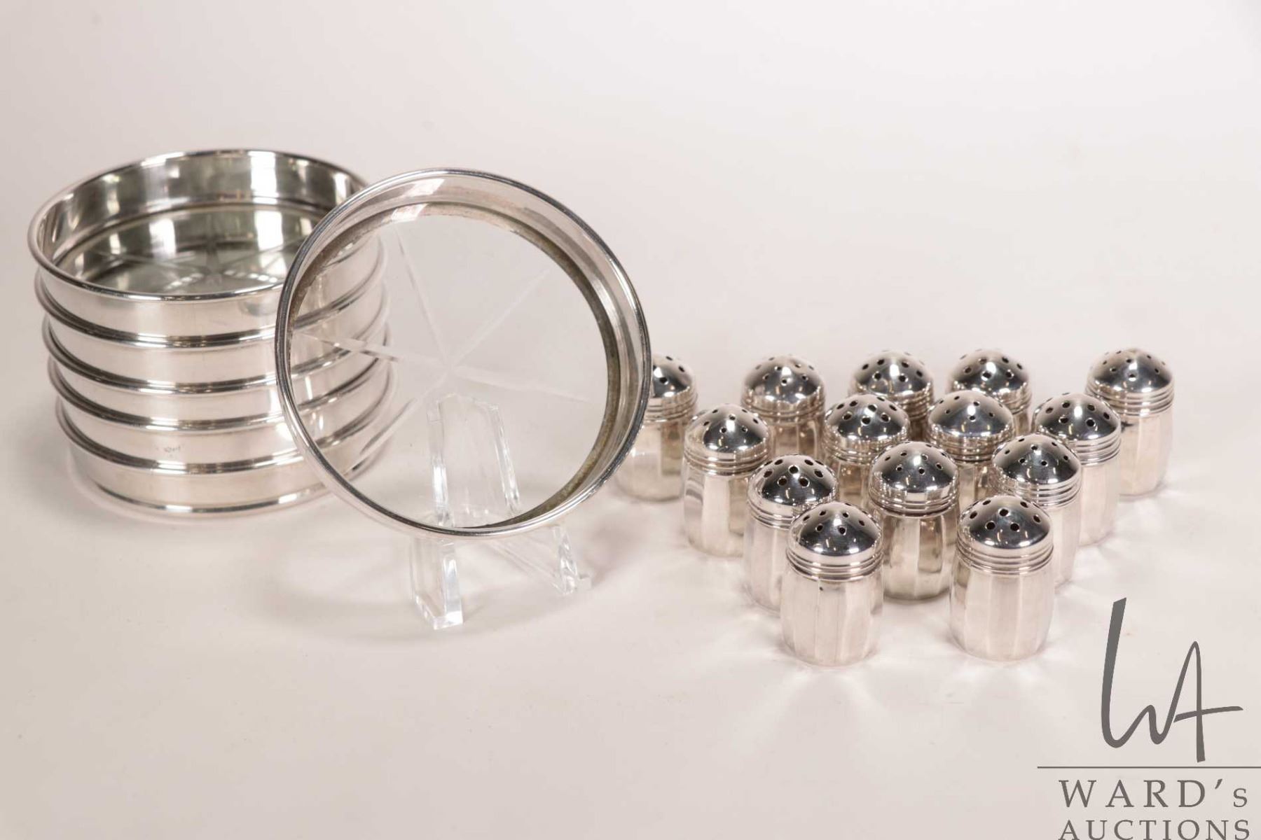 Lot 234 6 Birks Sterling silver and glass coaster and 7 sets of sterling silver salt and pepper shakers