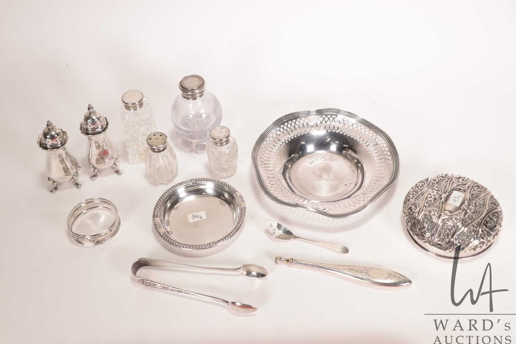 Selection of sterling including 5-1/2" pierced edge dish, a 3-1/4" dish marked "Ottawa 1950", a dresser jar topper, a salt spoon, a Birks Sterling handle, 4 salt and pepper shakers with silver and mother of pearl toppers, plus silver plate salt and pepper shakers and tongs