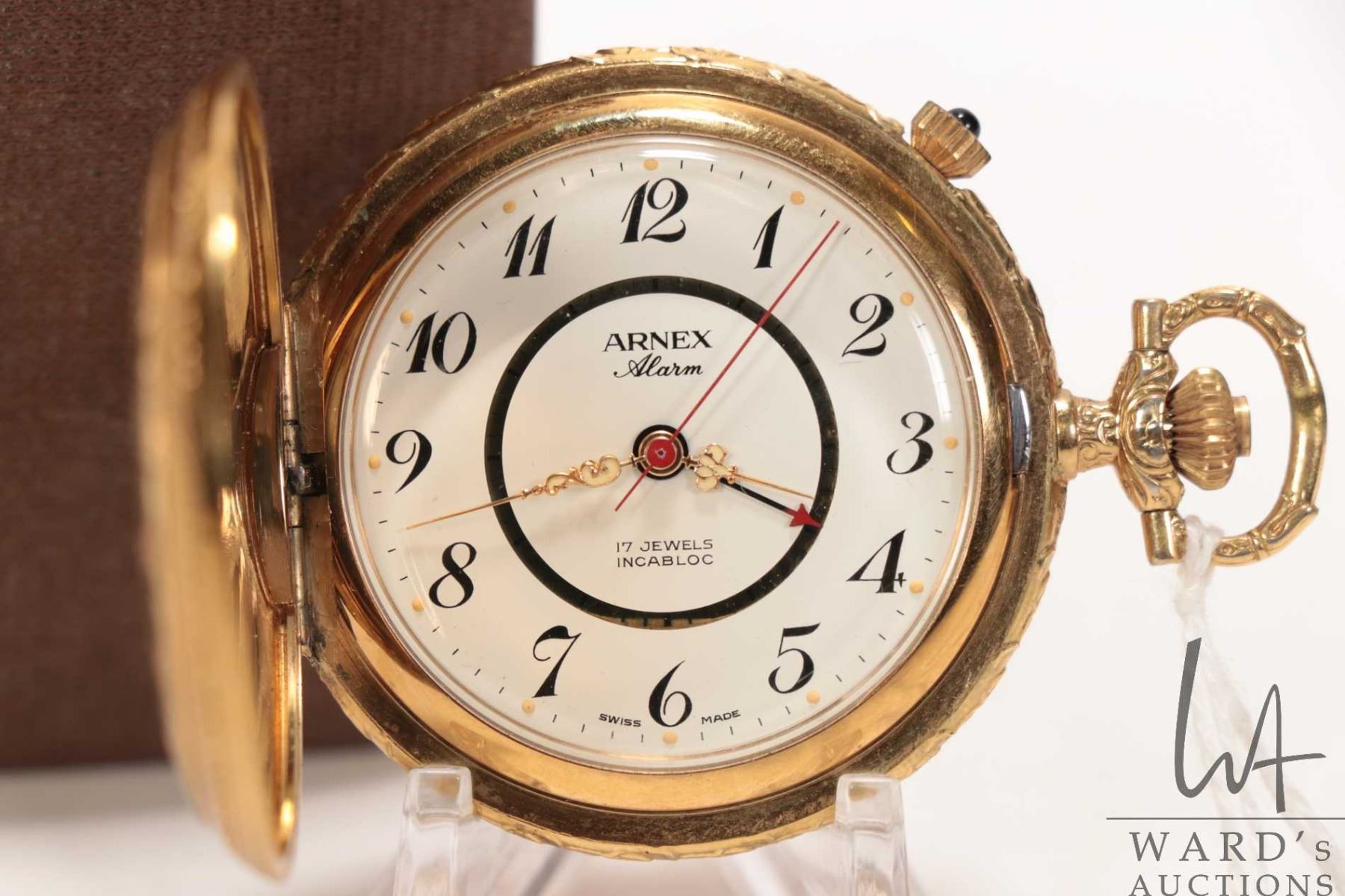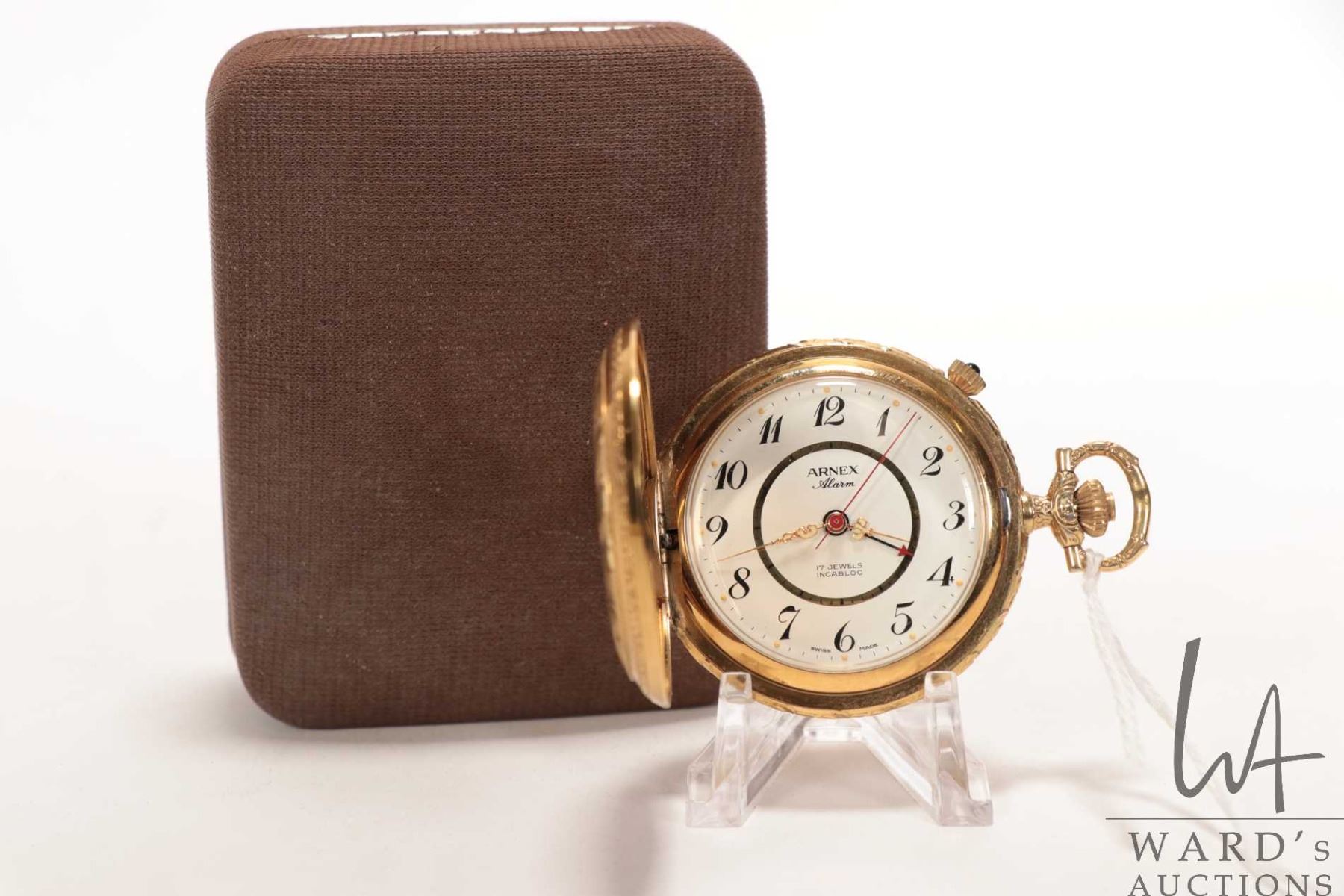 Lot 241 Arnex Alarm swiss made 17 jewel Incabloc pocket watch in gold filled case with white dial, Arabic nu