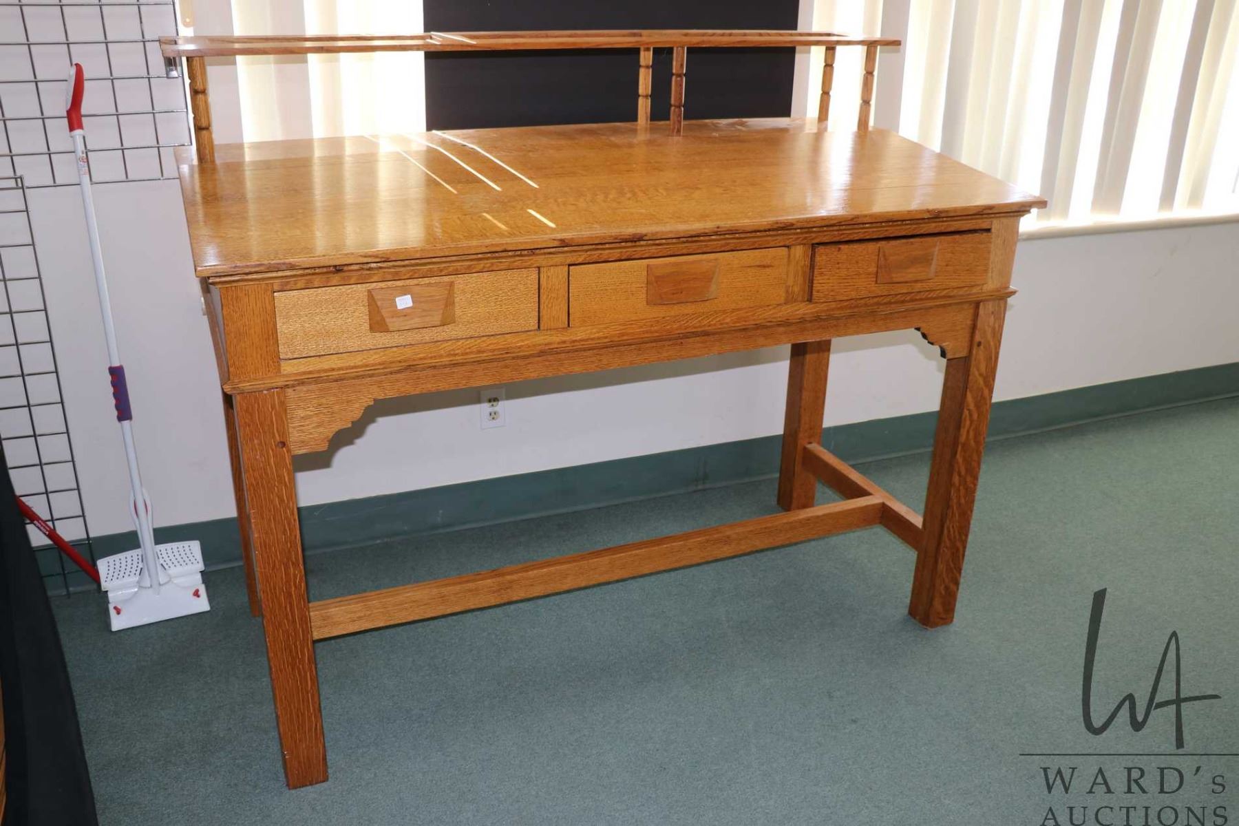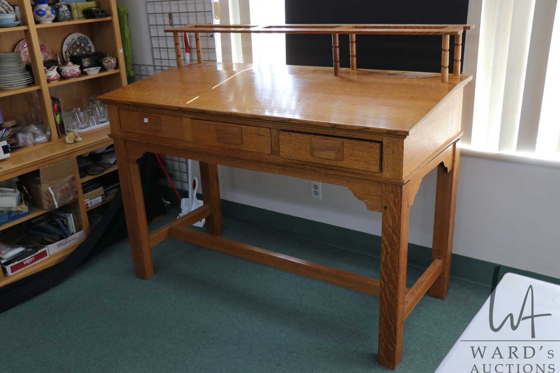 Antique quarter cut oak, Mission style clerks/ standing desk with topper, height to top of desk 45" plus 9" topper, 66" wide X 30" deep, note: two spindles for the topper are missing