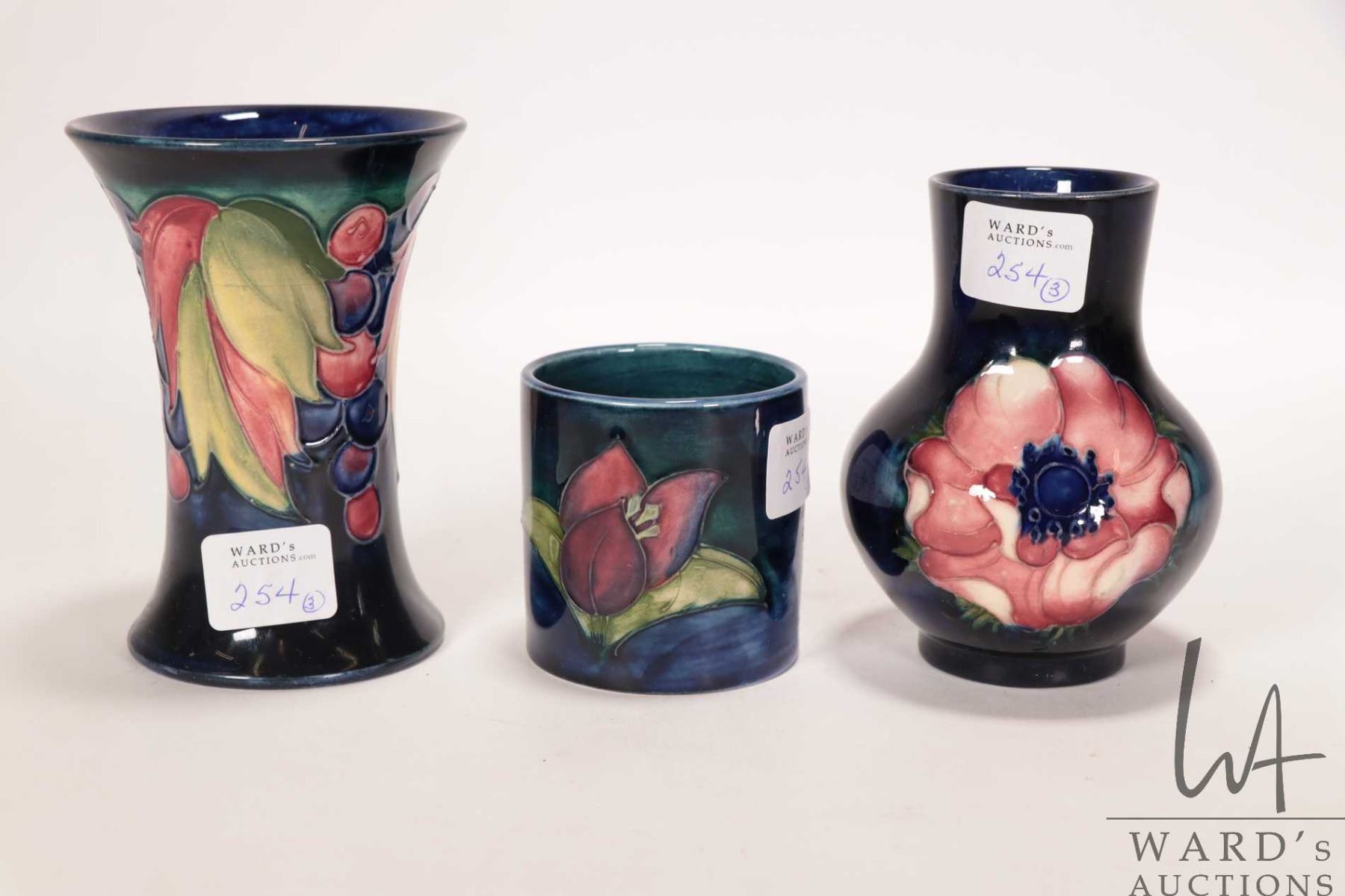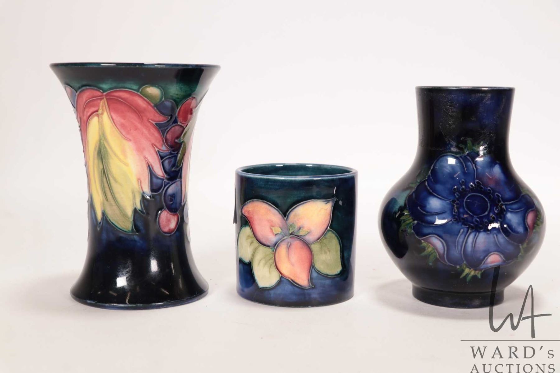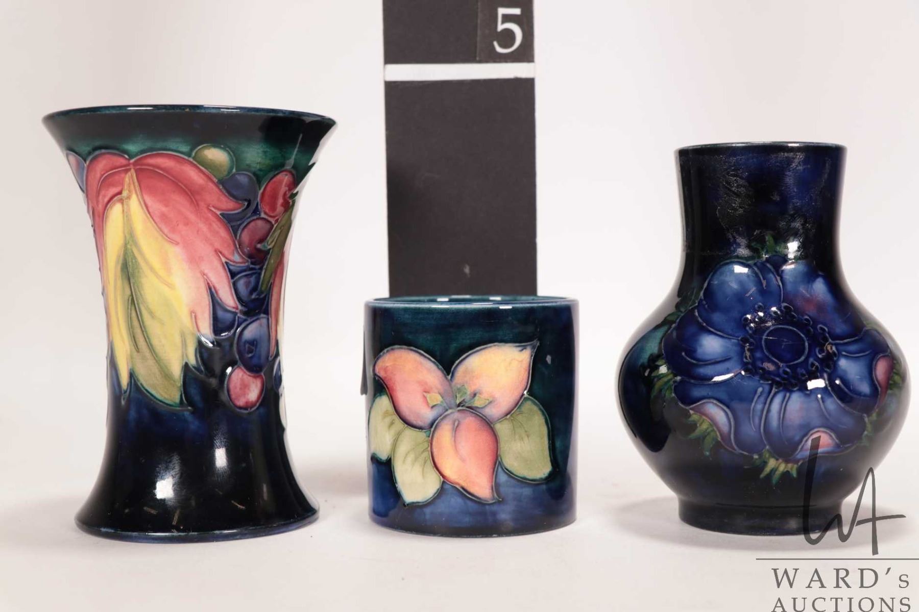 Lot 254 Three vintage Moorcroft vases including "Leaf and Berry" 4 1/2" spill vase, small "Anemone" baluster