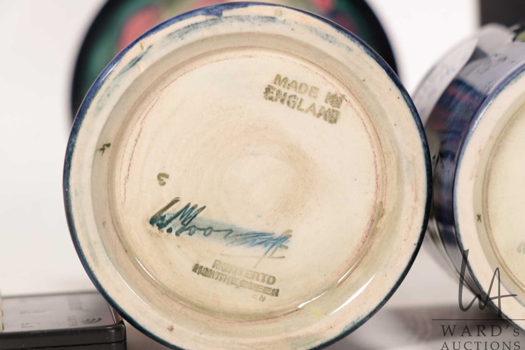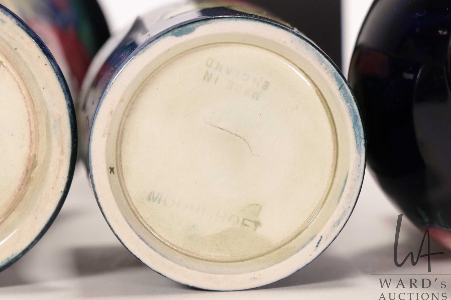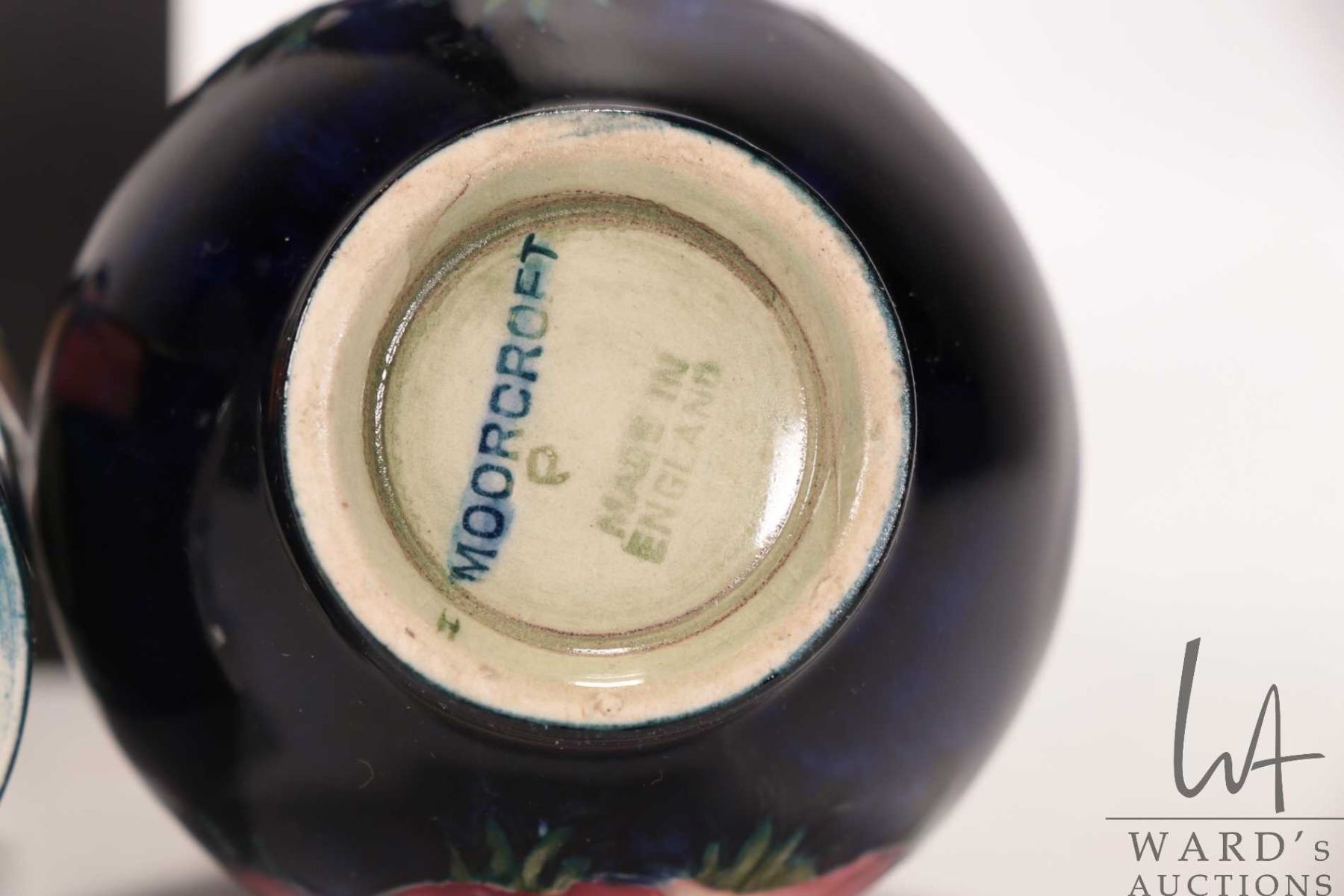 Lot 254 Three vintage Moorcroft vases including "Leaf and Berry" 4 1/2" spill vase, small "Anemone" baluster