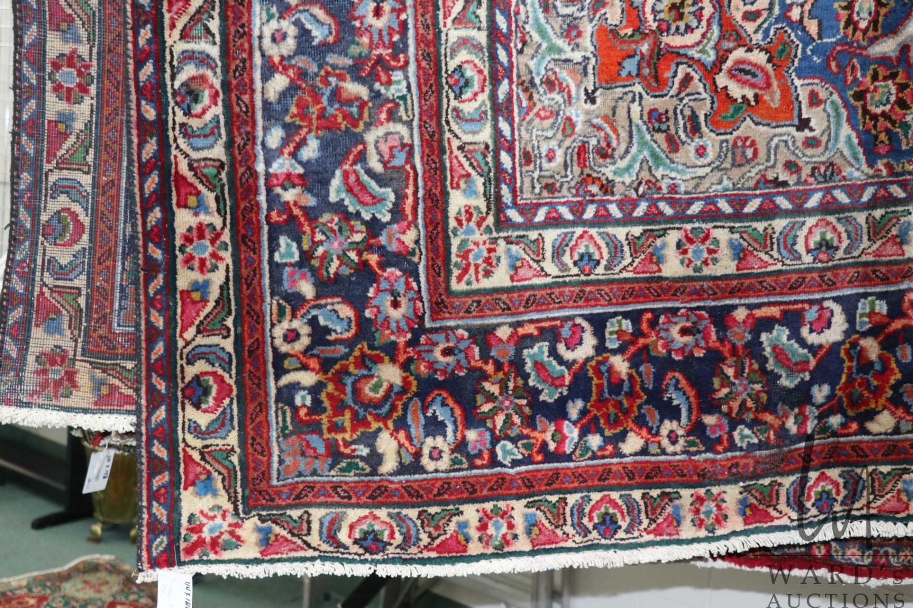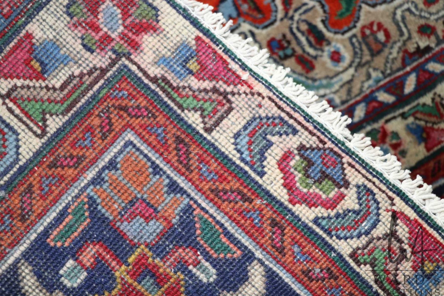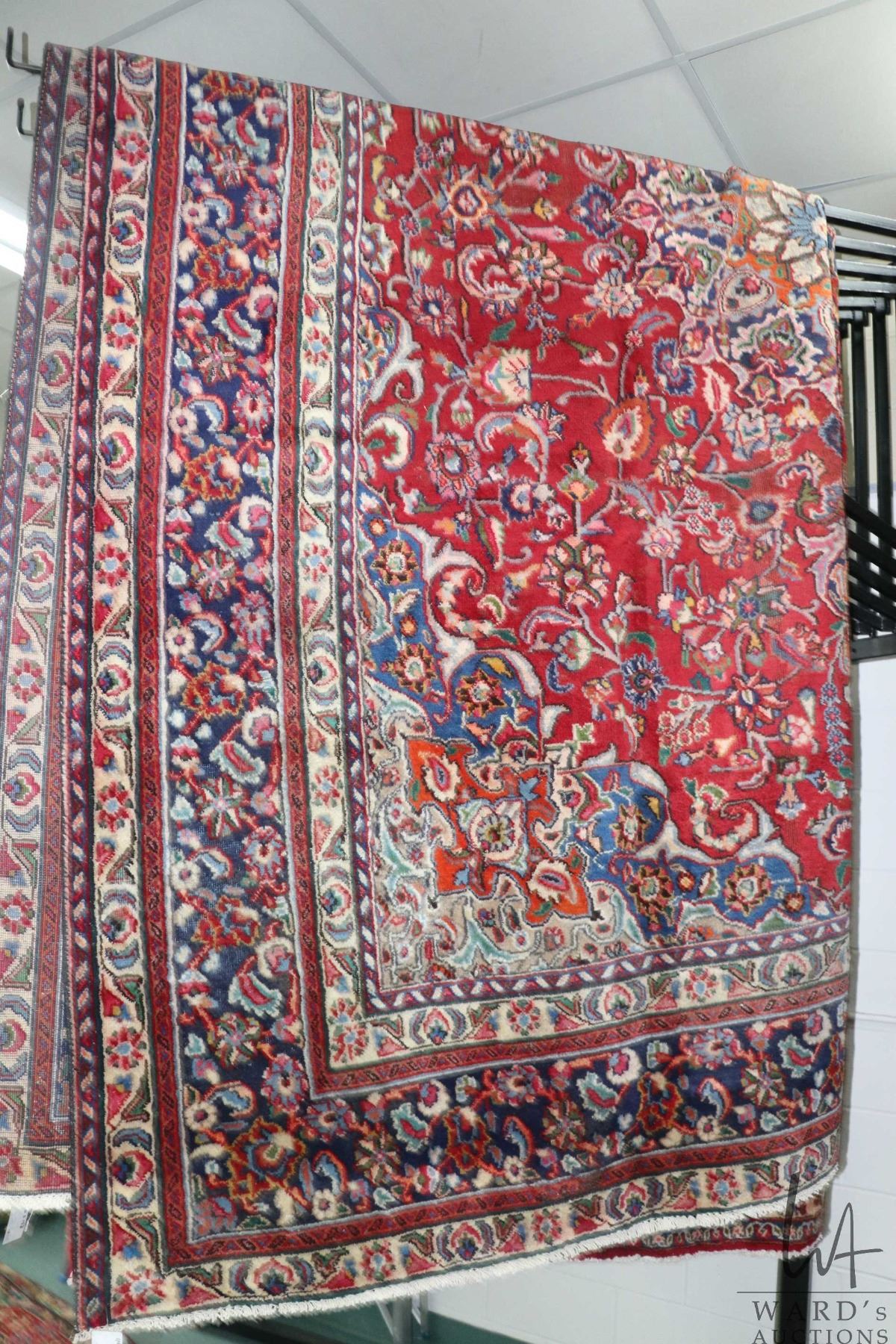 Lot 256 Iranian wool carpet "Mashad" with center medallion on red background and highlights of blues, taupe,