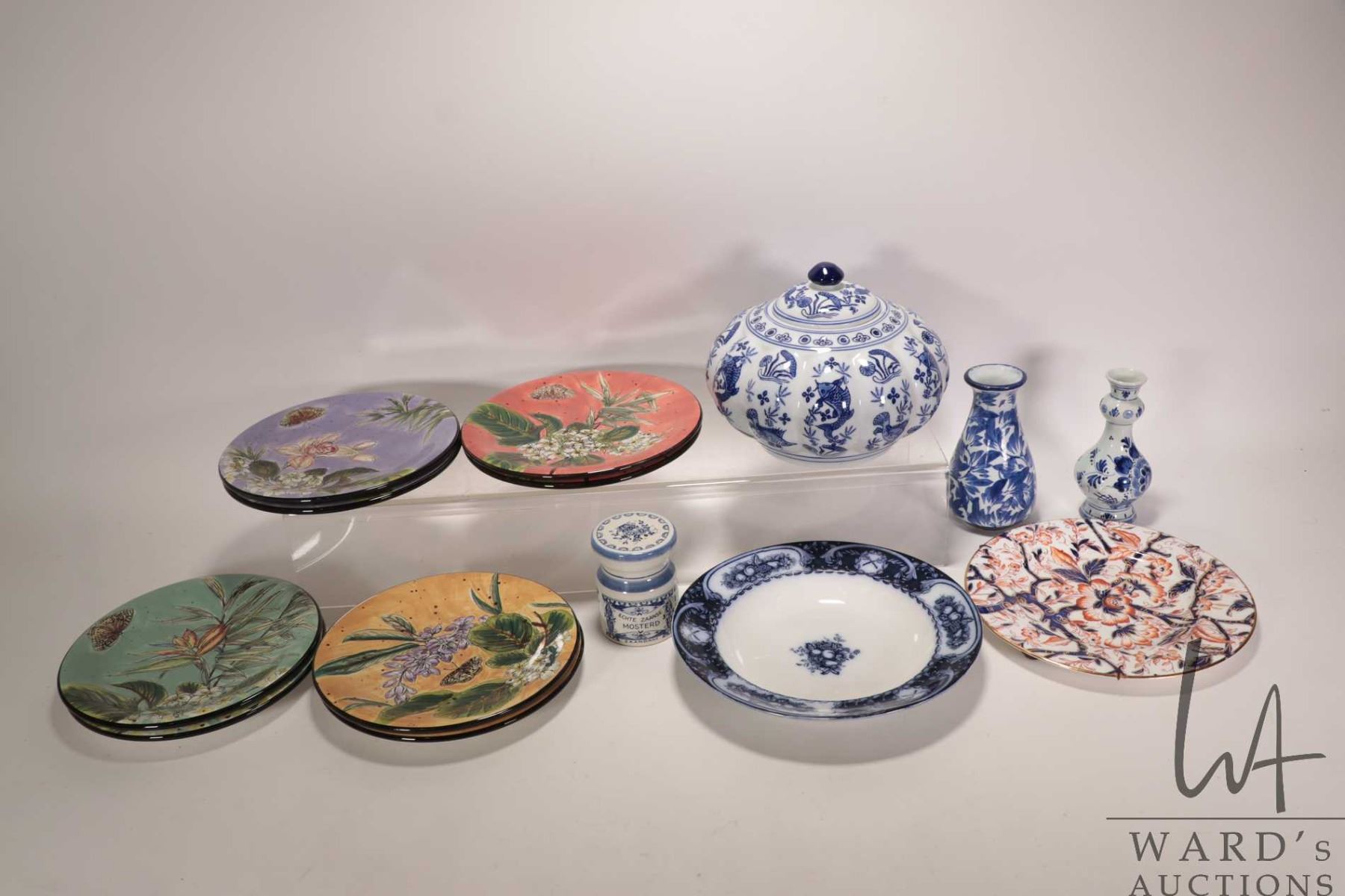 Tray lot of collectibles including pumpkin shaped blue and white lidded dish, Imari plate, Flow blue plate, two pieces of Delft/ Delft like ware including mustard pot, six Pamela Gladding floral plates and a blue and white hand painted vase